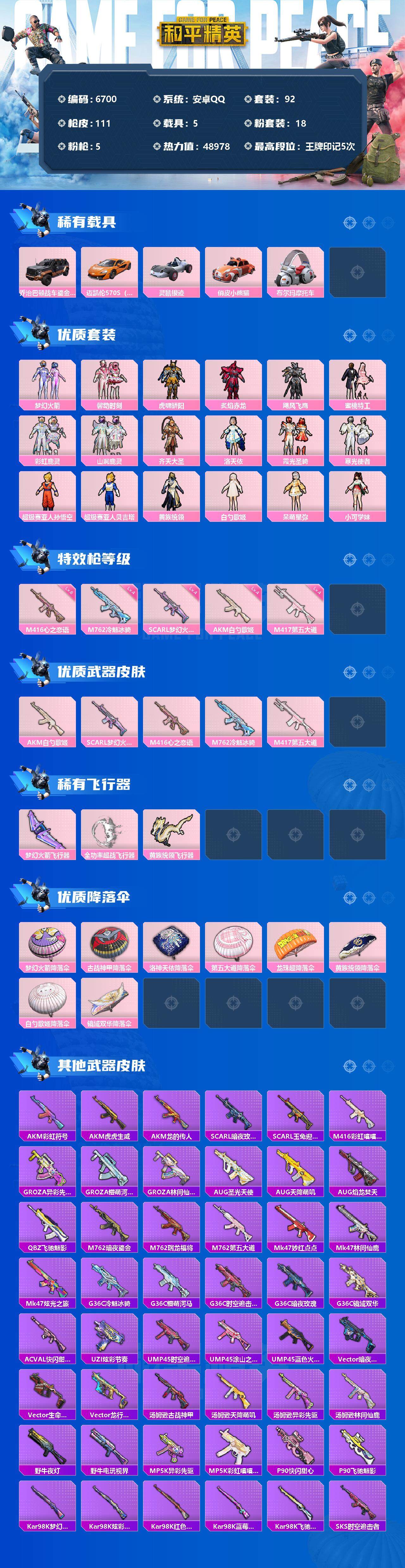 【6700】【商品标题】:安卓 手Q-18粉装-5特效枪-5载具-3粉色飞行器-48978热力值-5王牌印记-92套装-111枪皮