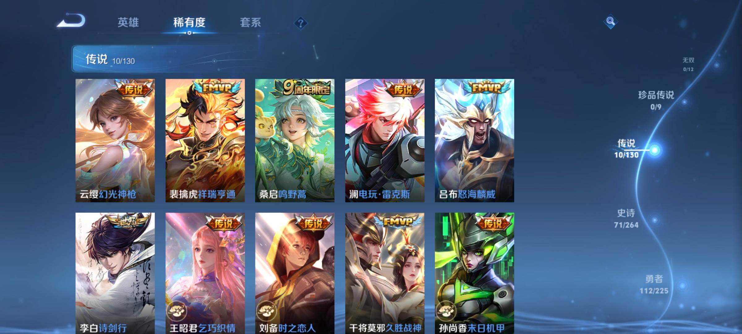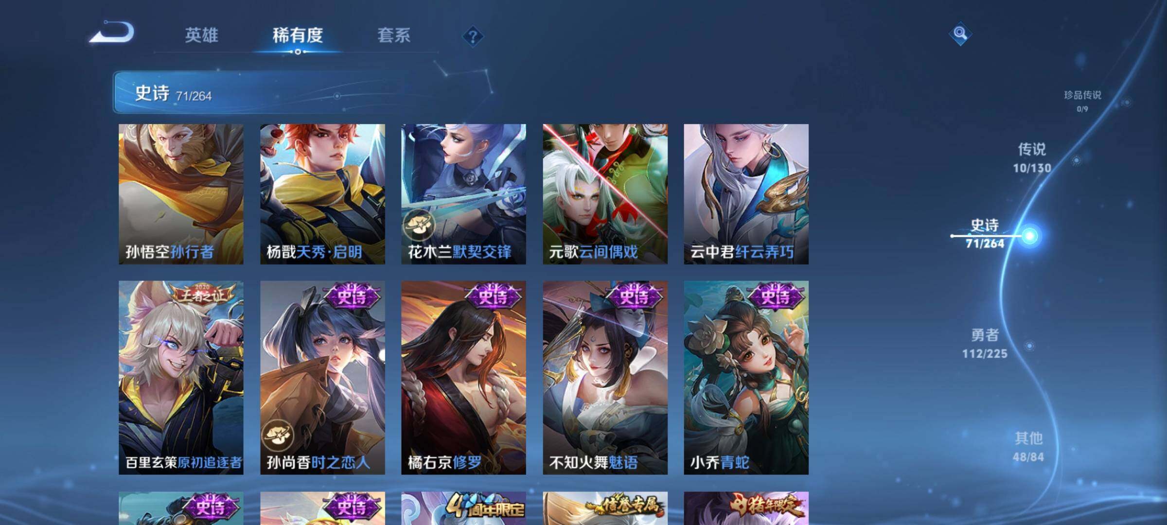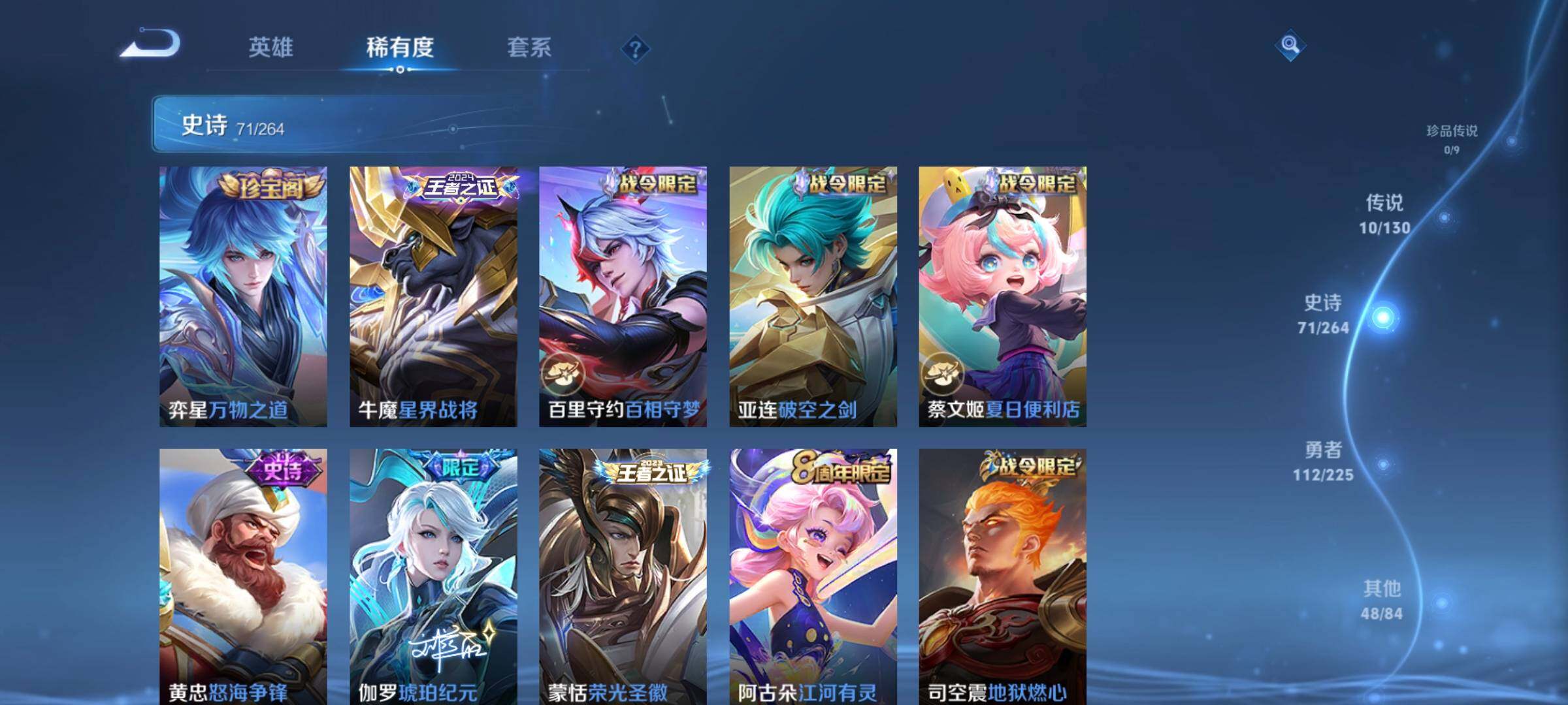 安卓Q-V7-至尊星耀I段位-127英雄-242皮肤-1典藏-0珍品无双-0无双-0珍品传说-10传说-71史诗