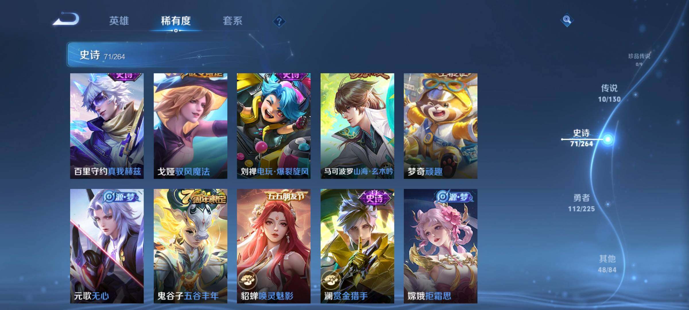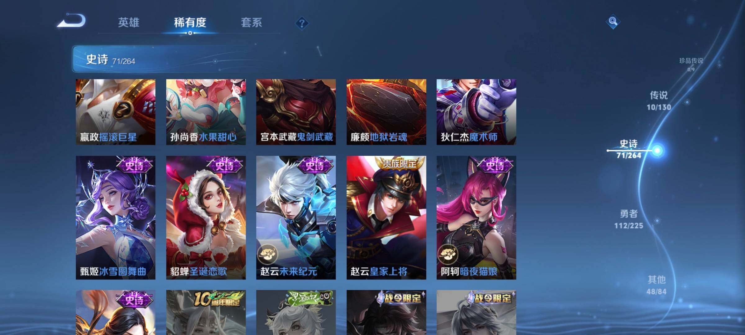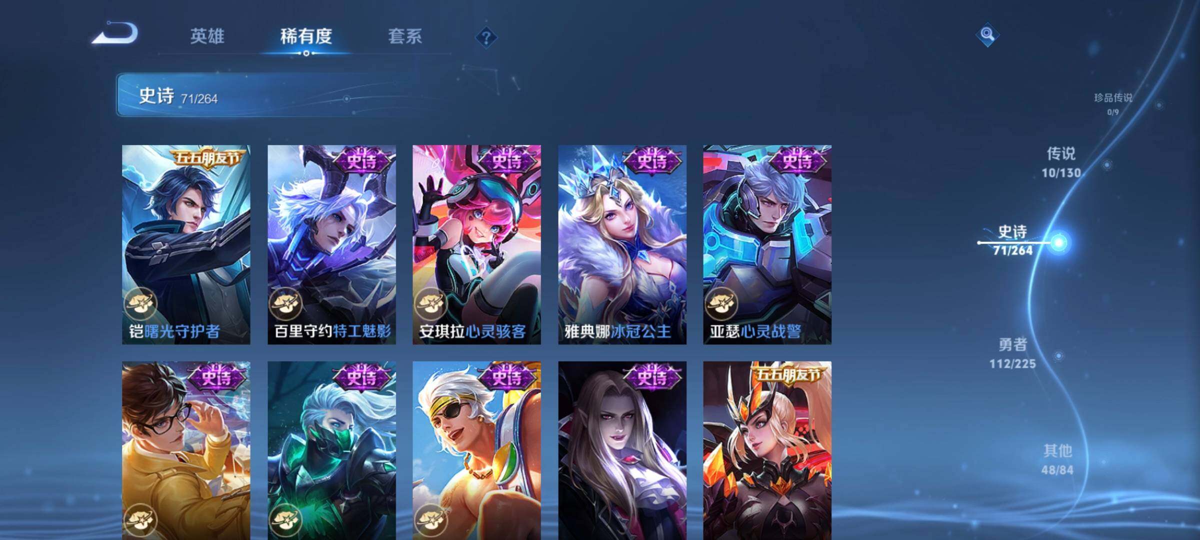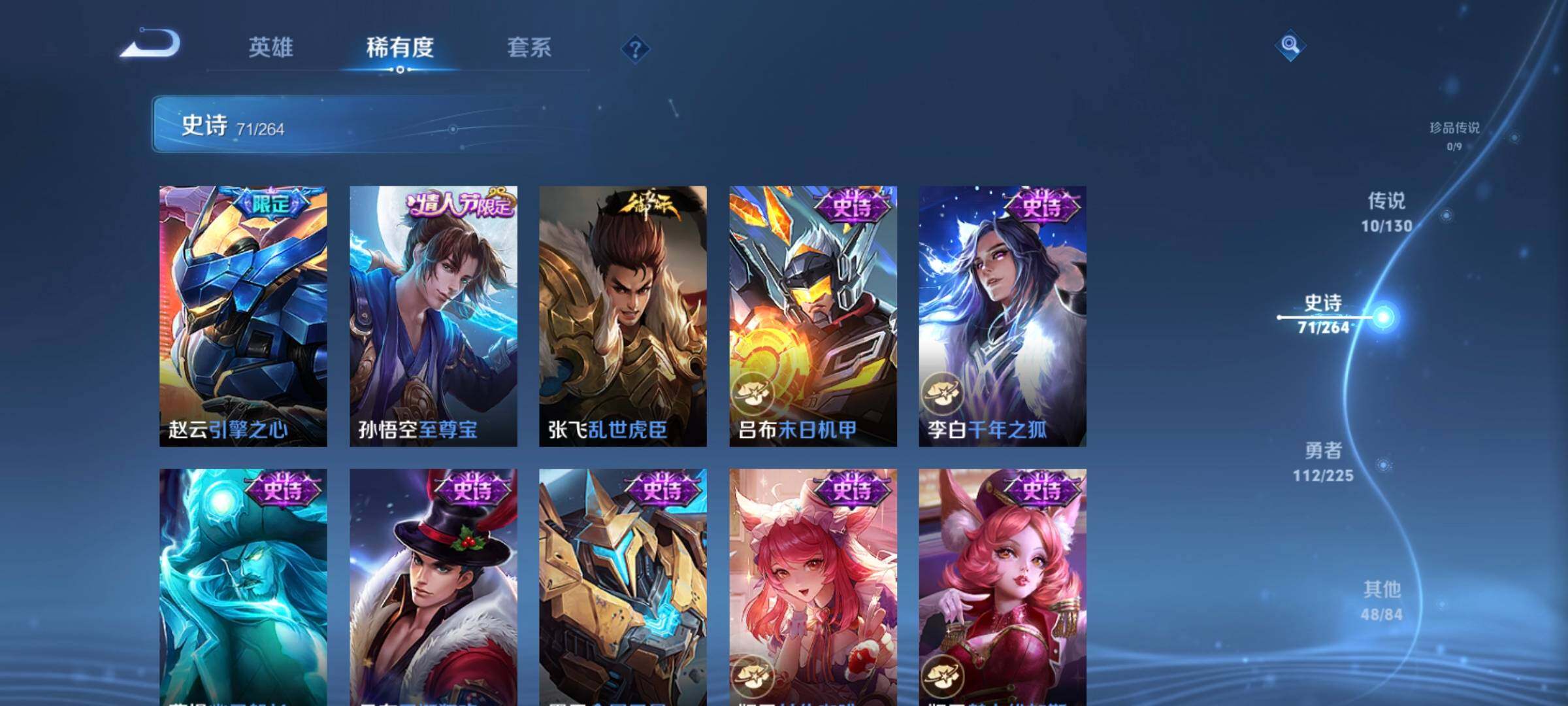 安卓Q-V7-至尊星耀I段位-127英雄-242皮肤-1典藏-0珍品无双-0无双-0珍品传说-10传说-71史诗