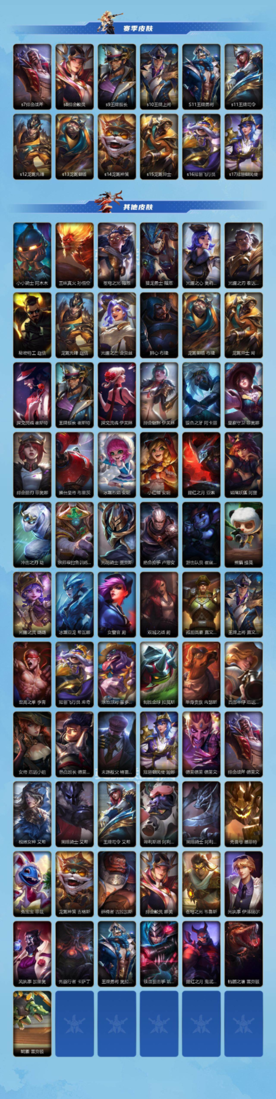 【传说皮肤】:神王 盖伦,光影巨翼 亚托克斯,心之钢 凯隐,源计划:净化 薇恩,光明哨兵 薇恩,星域游侠 崔斯特,星之守护者 卡莎,天煞 劫,星域武神 贾克斯,西部魔影 卢锡安,驯龙炮手 崔丝塔娜,星之守护者 落 霞,星之守护者 陨 洛,律政大亨 蒙多医生,黎明使者 永恩,西部天使 艾希,源计划:泯灭 雷克顿