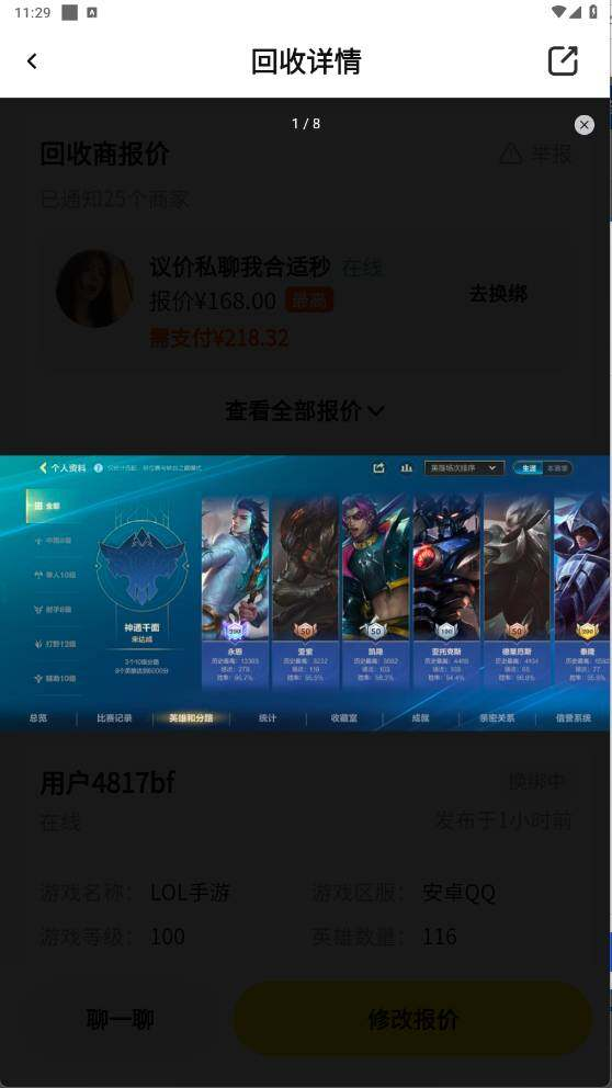 通过App,与卖家商议价格及保险,并向卖家索要账号最新截图,确认后下单购买。