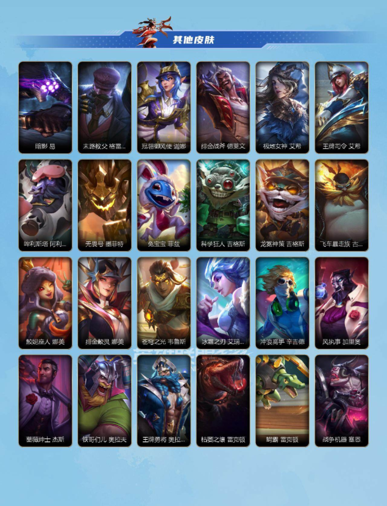 【传说皮肤】:心之钢 凯隐,光明哨兵 薇恩,星之守护者 金克丝,黑夜使者 亚索,西部魔影 卢锡安,驯龙炮手 崔丝塔娜,星之守护者 落 霞,神王 德莱厄斯,源计划:联合 艾希,黎明使者 锐雯,战斗学院 伊泽瑞尔,地狱之门卫士 加里奥,灵魂莲华 锤石