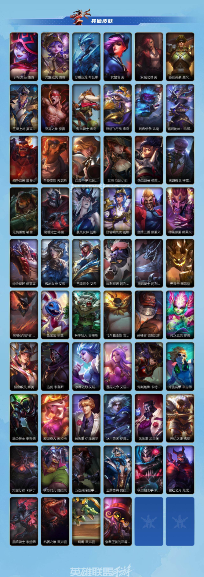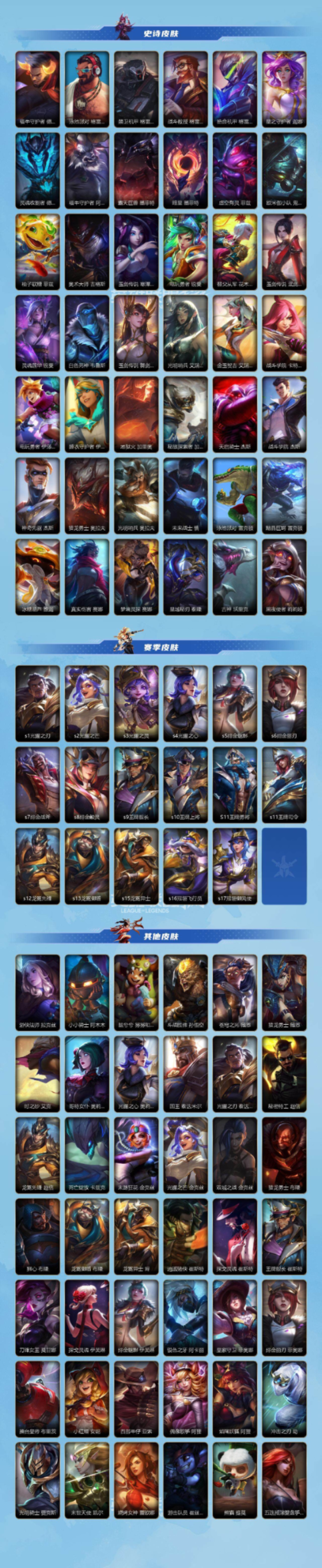 【传说皮肤】:神王 盖伦,源计划:净化 薇恩,光明哨兵 薇恩,星之守护者 金克丝,暗星尊 烬,黑夜使者 亚索,星之守护者 阿狸,天煞 劫,西部魔影 卢锡安,日蚀骑士 蕾欧娜,星之守护者 落 霞,神拳 李青,神龙尊者 圣龙 李青,律政大亨 蒙多医生,福牛