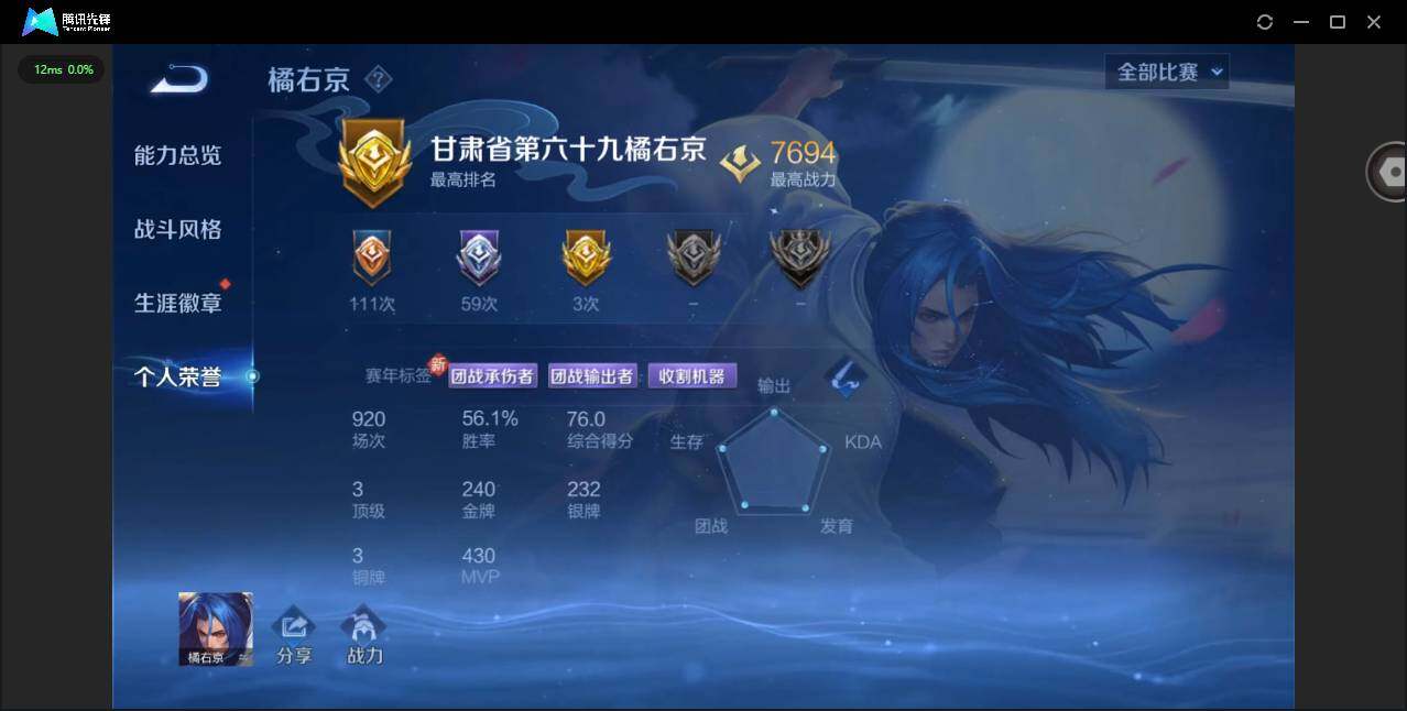王者荣耀【安卓QQ】【金标橘右京】贵族等级: V7 英雄数: 125 皮肤数: 233 荣耀水晶: