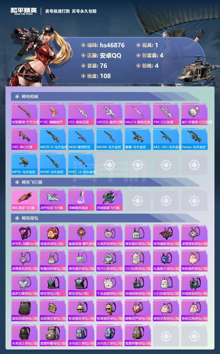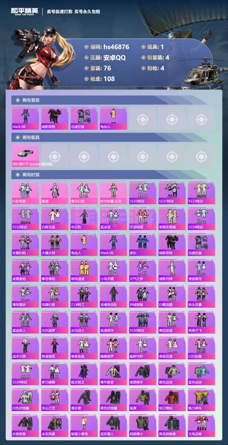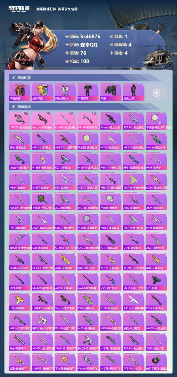 hs46876 安卓手Q-1王牌印记-4粉装-4特效枪-1载具-31316热力值-76套装-108枪