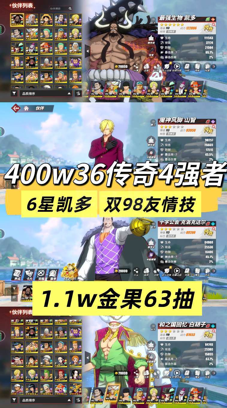 400w36传奇4强者双98友情技1.1w金果63抽,6星最强凯多等魔神山治,十字工会老沙,青白,四