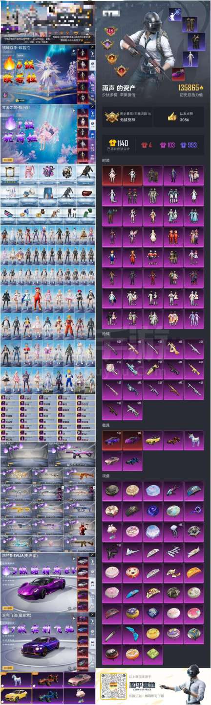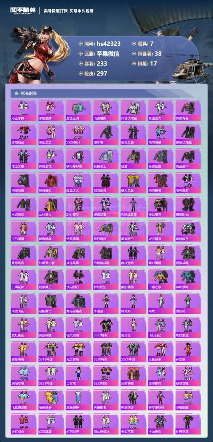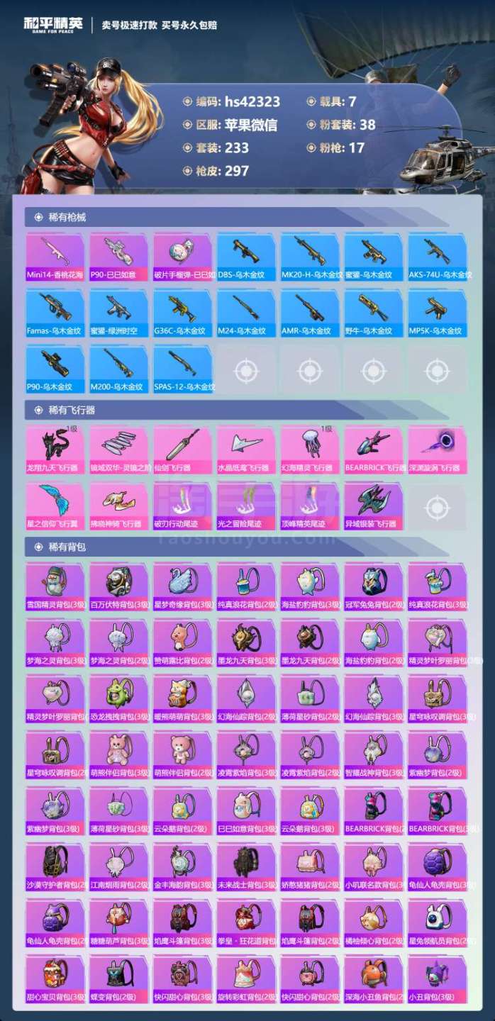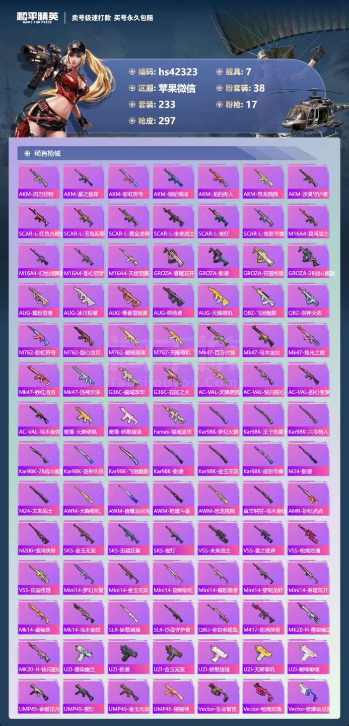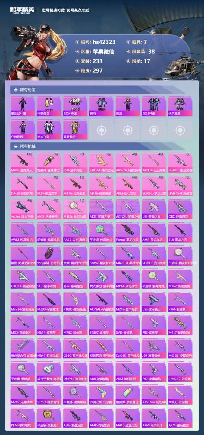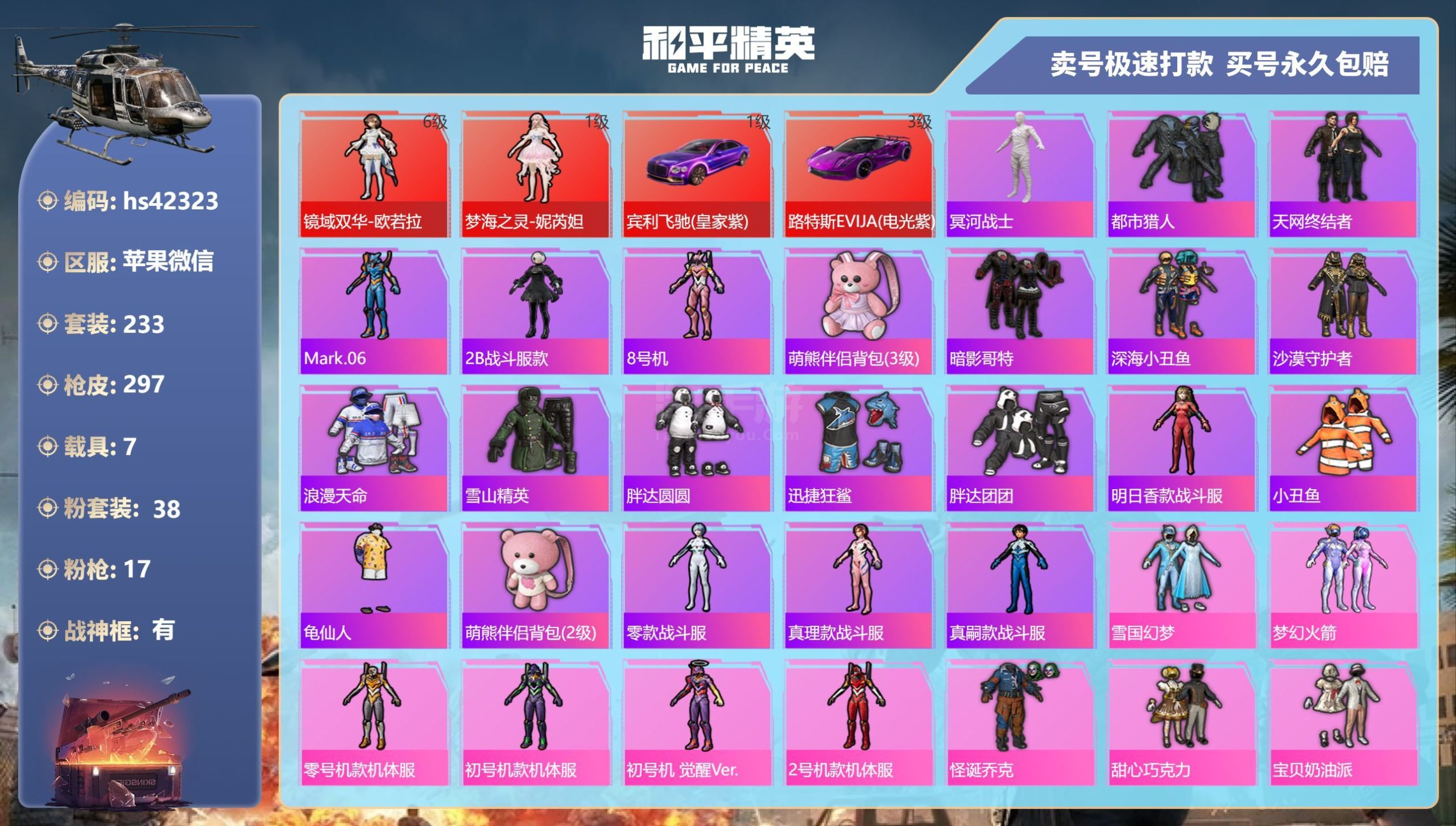 和平精英【苹果微信】hs42323 苹果v-16王牌印记-有战神框-38粉装-17特效枪-7载具-135865热力值-