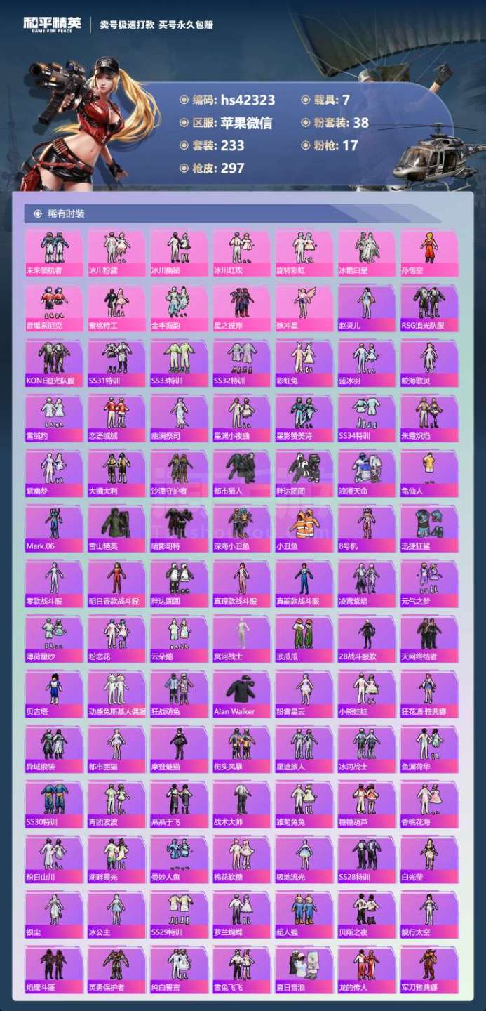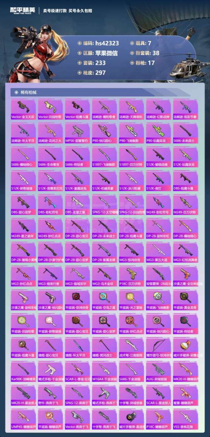 hs42323 苹果微-16王牌印记-有战神框-38粉装-17特效枪-7载具-135865热力值-