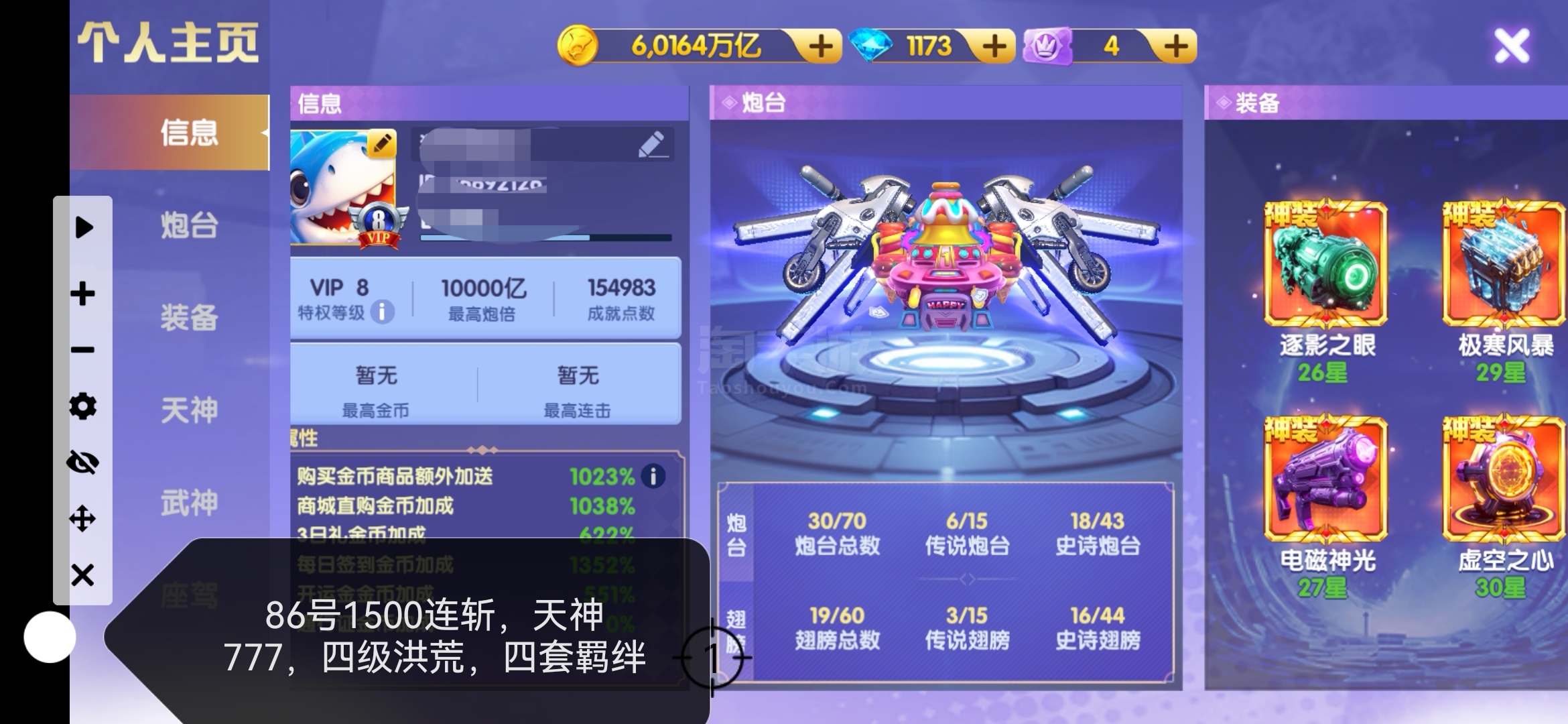 基本配置万炮神装三级洪荒,天神上班,600斩以上,纯最低7块1京,私选号