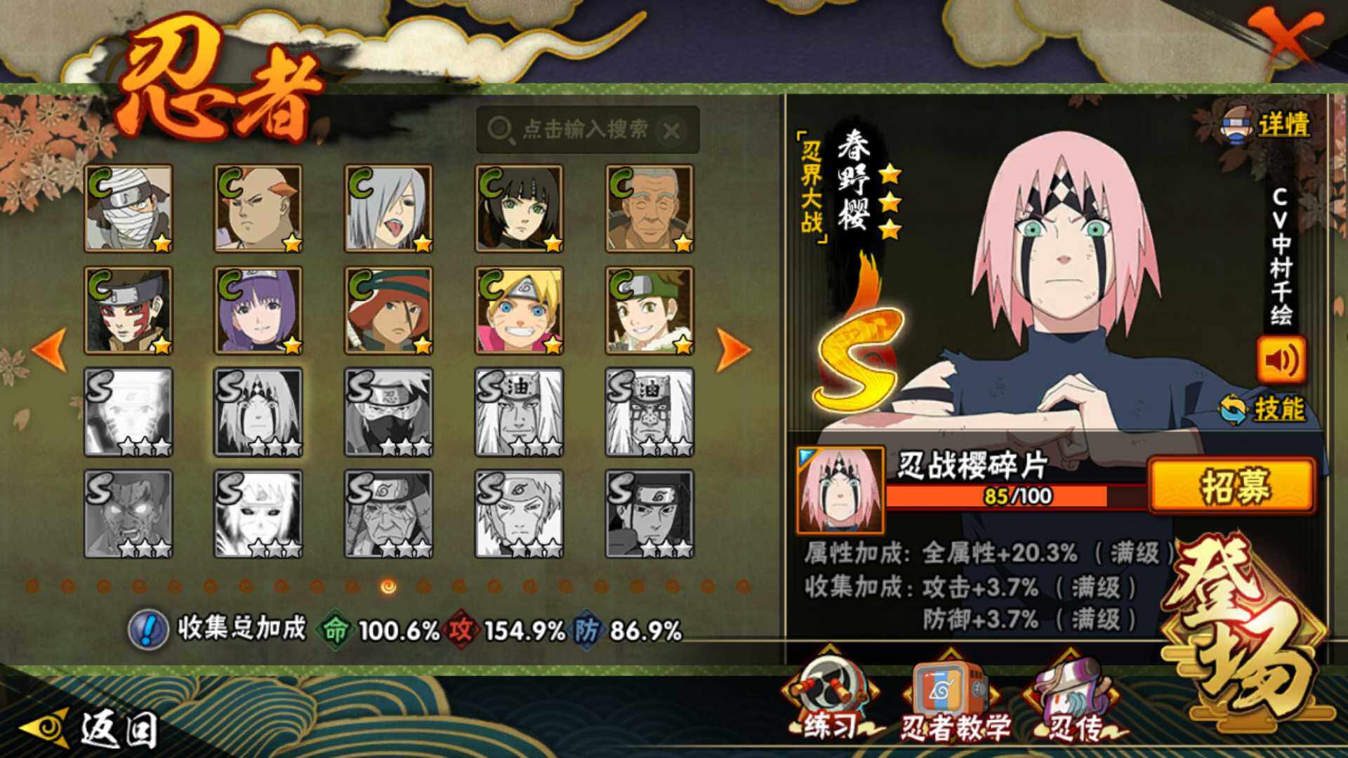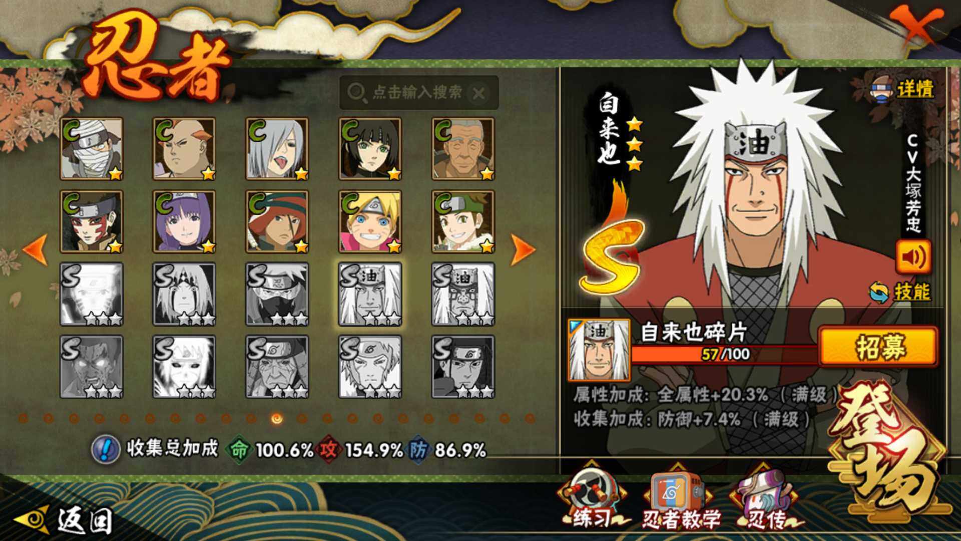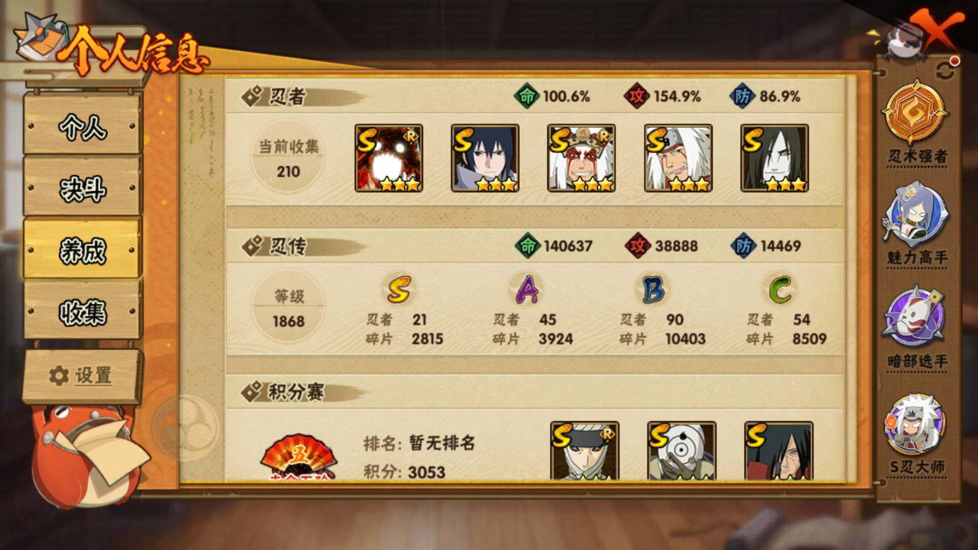 V11 1055万战力 21S级忍者数-45A级忍者数 有熊猫 九喇嘛水门51片 忍战樱85片 自来也57片 柱间46片 秽土柱间58片 忍战带土46片 天道超55片 忍战艾69片 LL5294