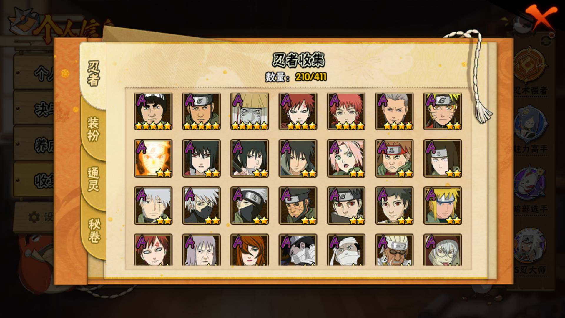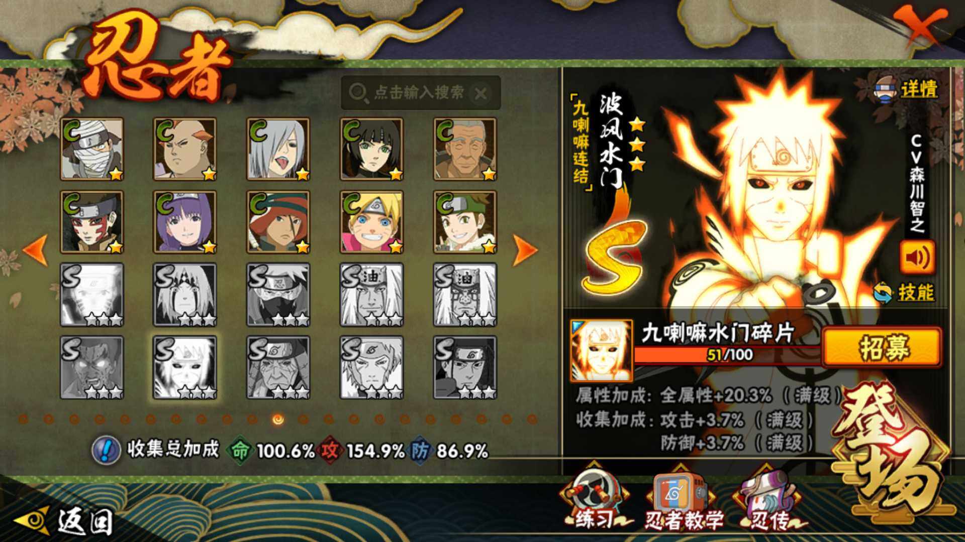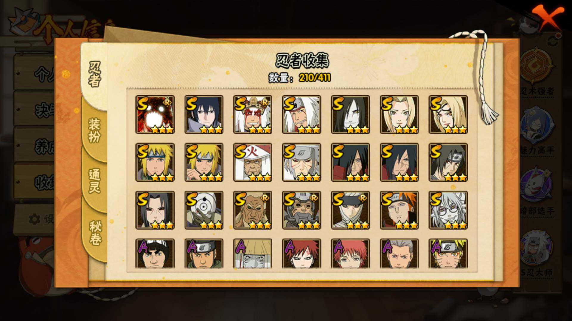 【S级忍者】:半藏「秽土转生」(3星),波风水门「秽土转生」(3星),千手扉间「秽土转生」(3星),宇智波鼬「秽土转生」(3星),宇智波斑「秽土转生」(3星),宇智波斑「秽土转生·解」(3星),宇智波鼬