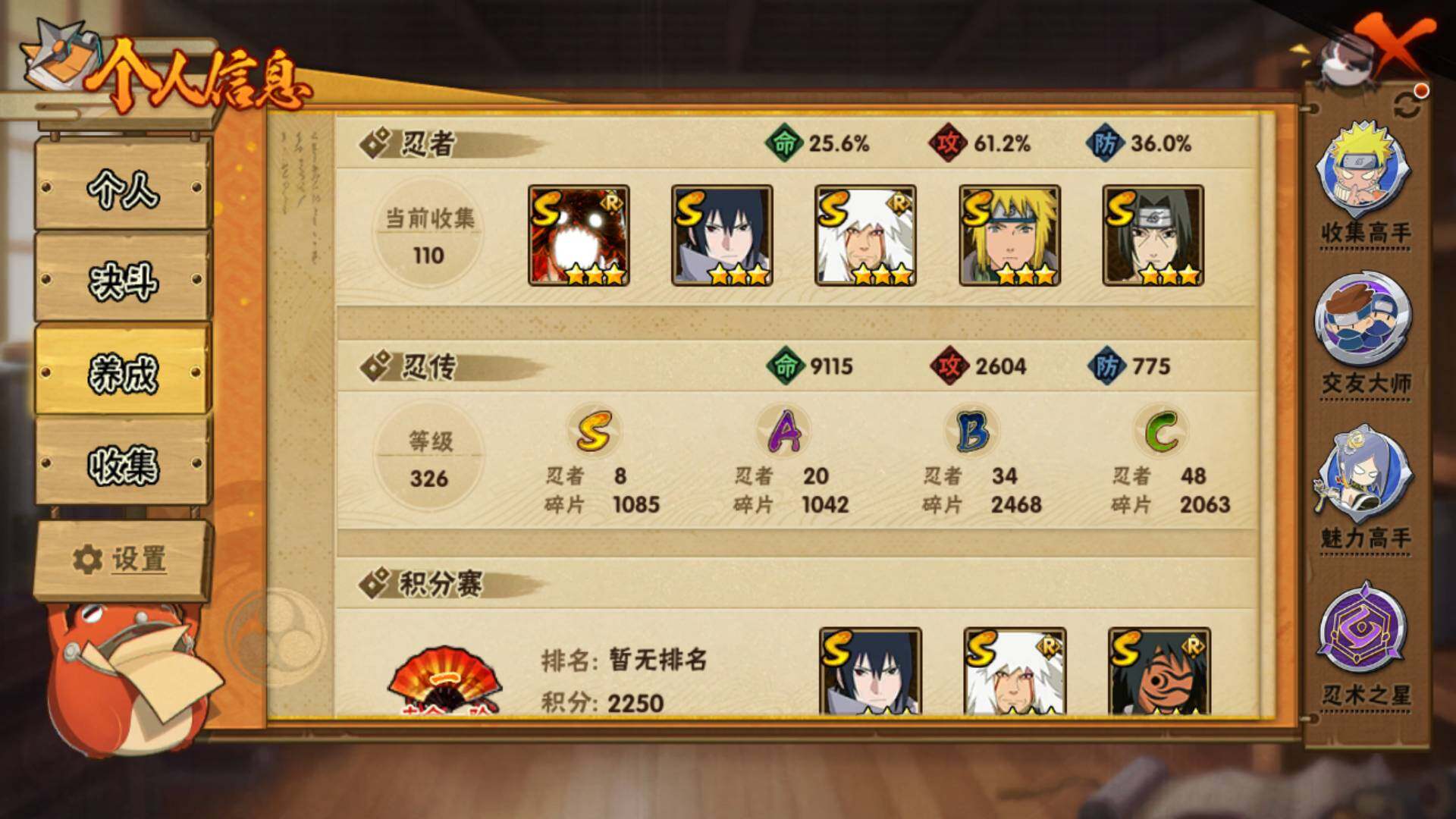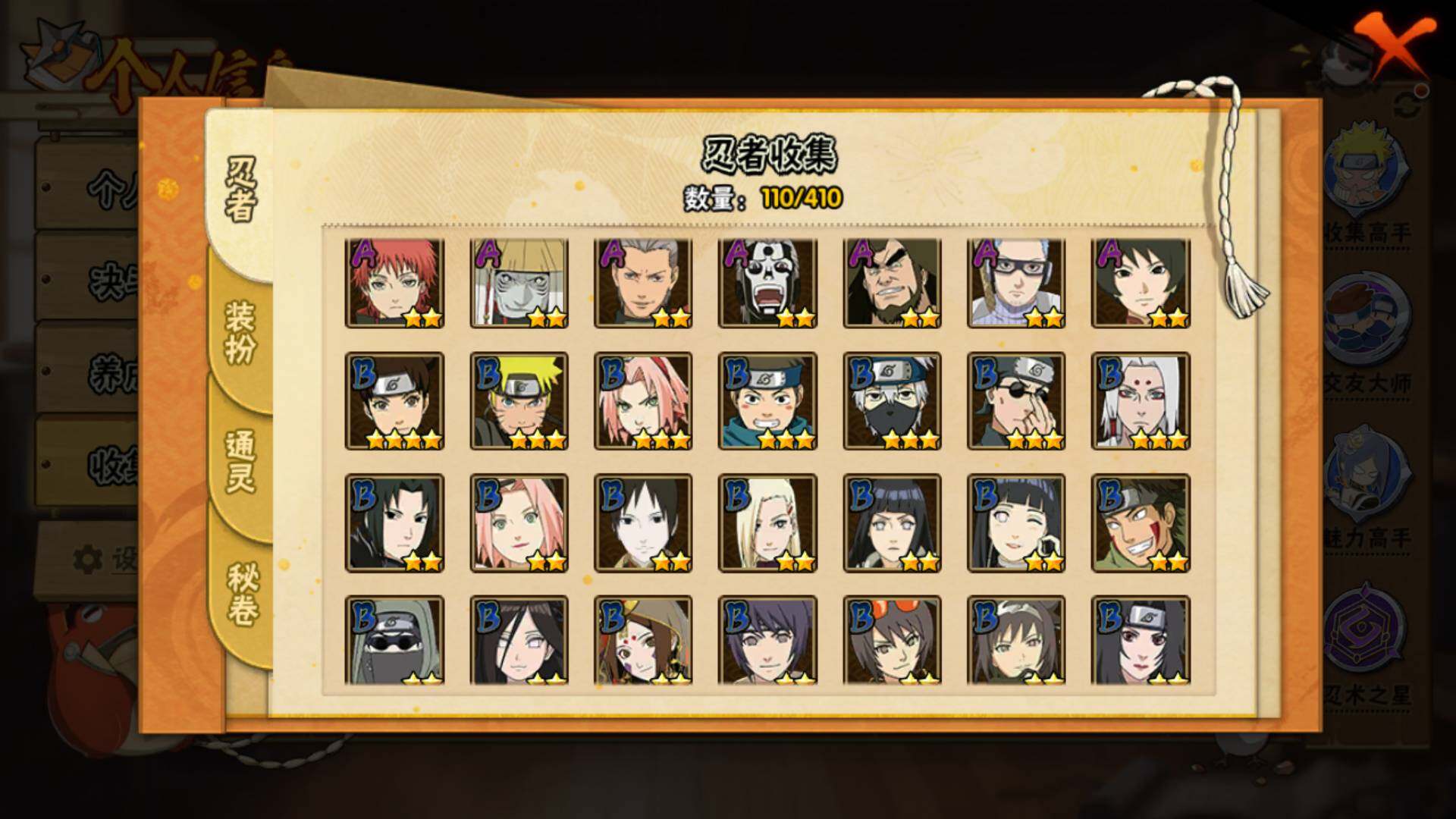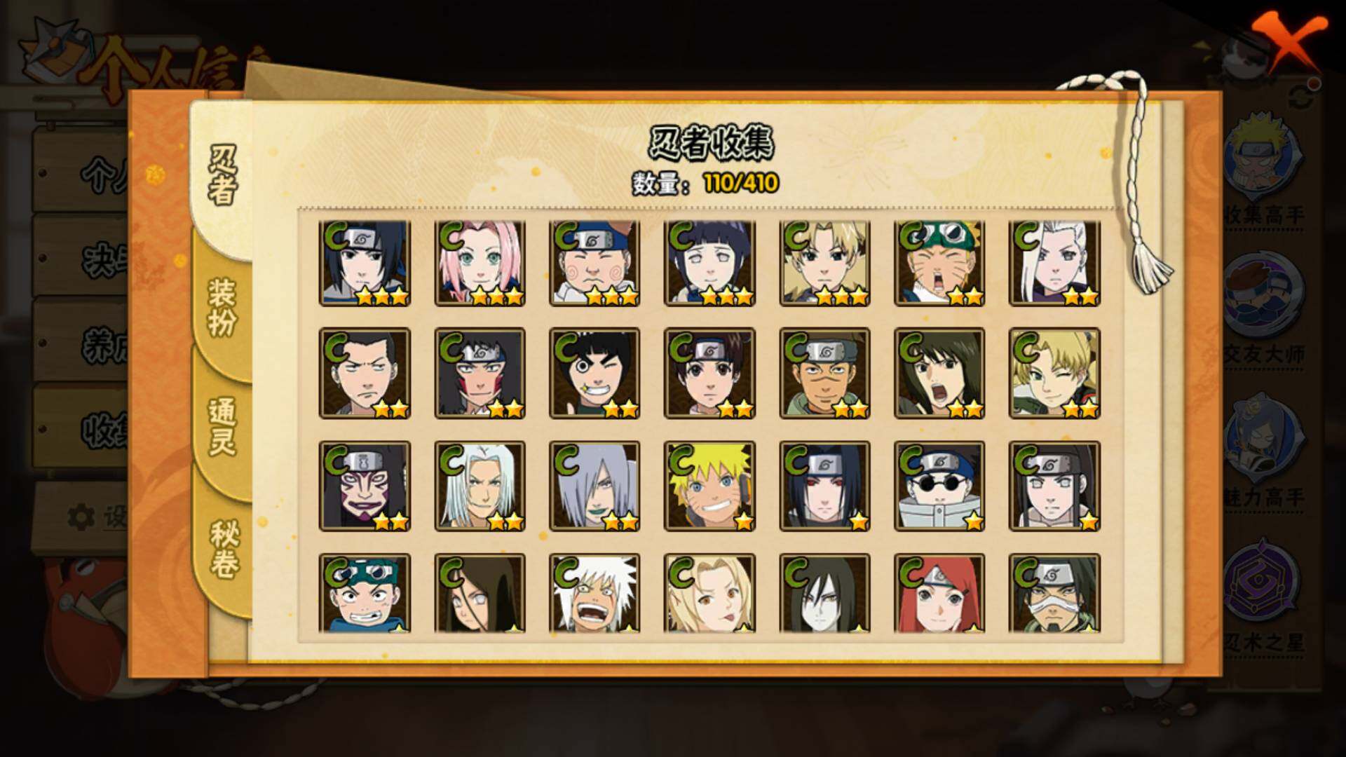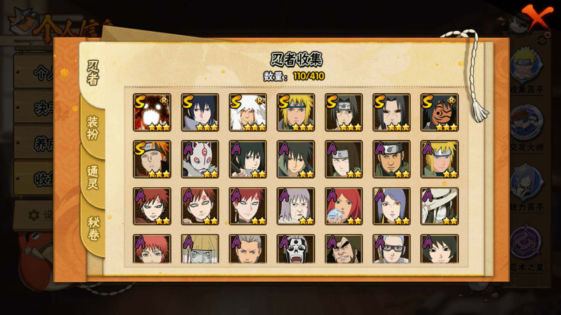 【S级忍者】:宇智波鼬「秽土转生」(3星),宇智波鼬「须佐能乎」(3星),自来也「舞之豪杰」(3星),波风水门(3星),神秘面具男「红夜之刃」(3星),佩恩「天道」(3星),宇智波佐助「永恒万花筒」(3星),漩涡鸣人「暴怒·第六尾」(3星)