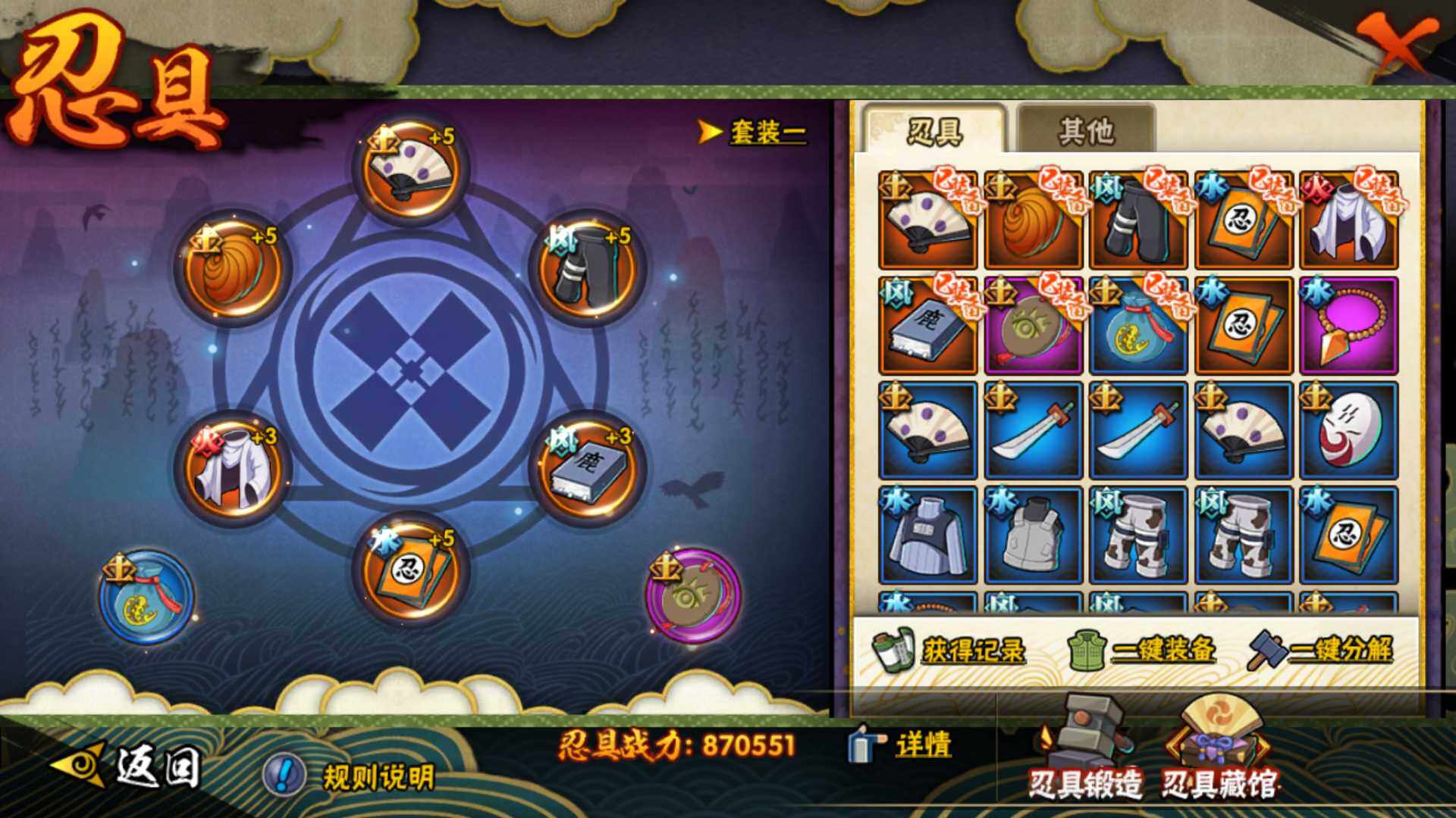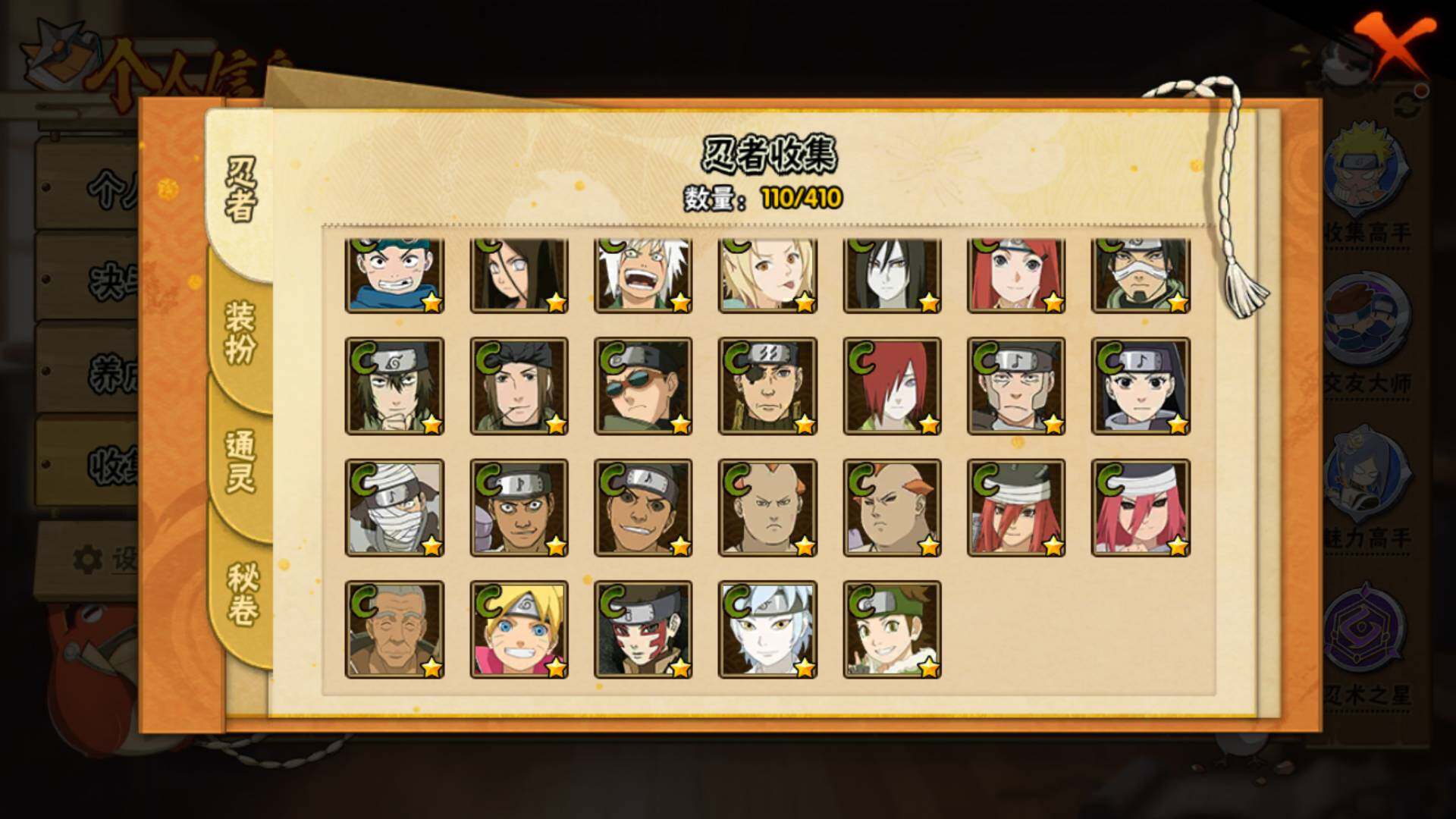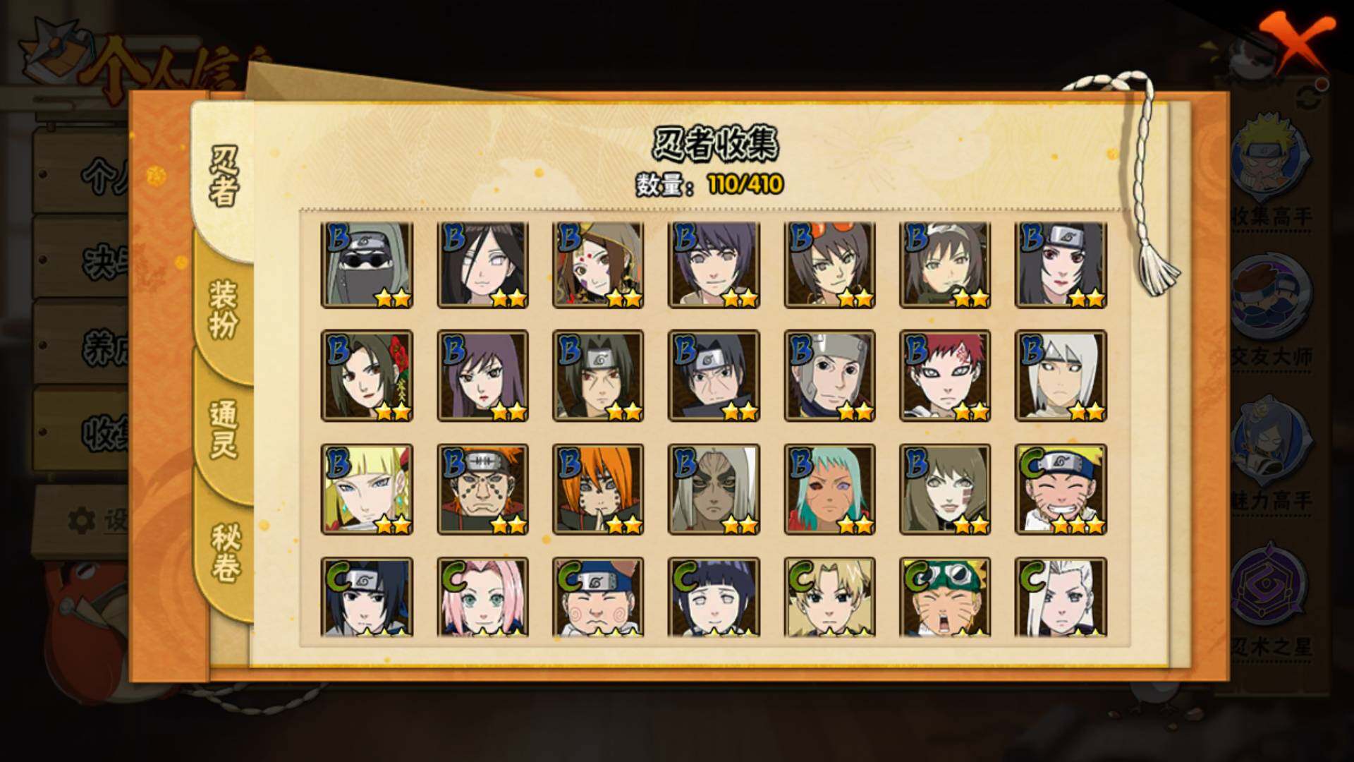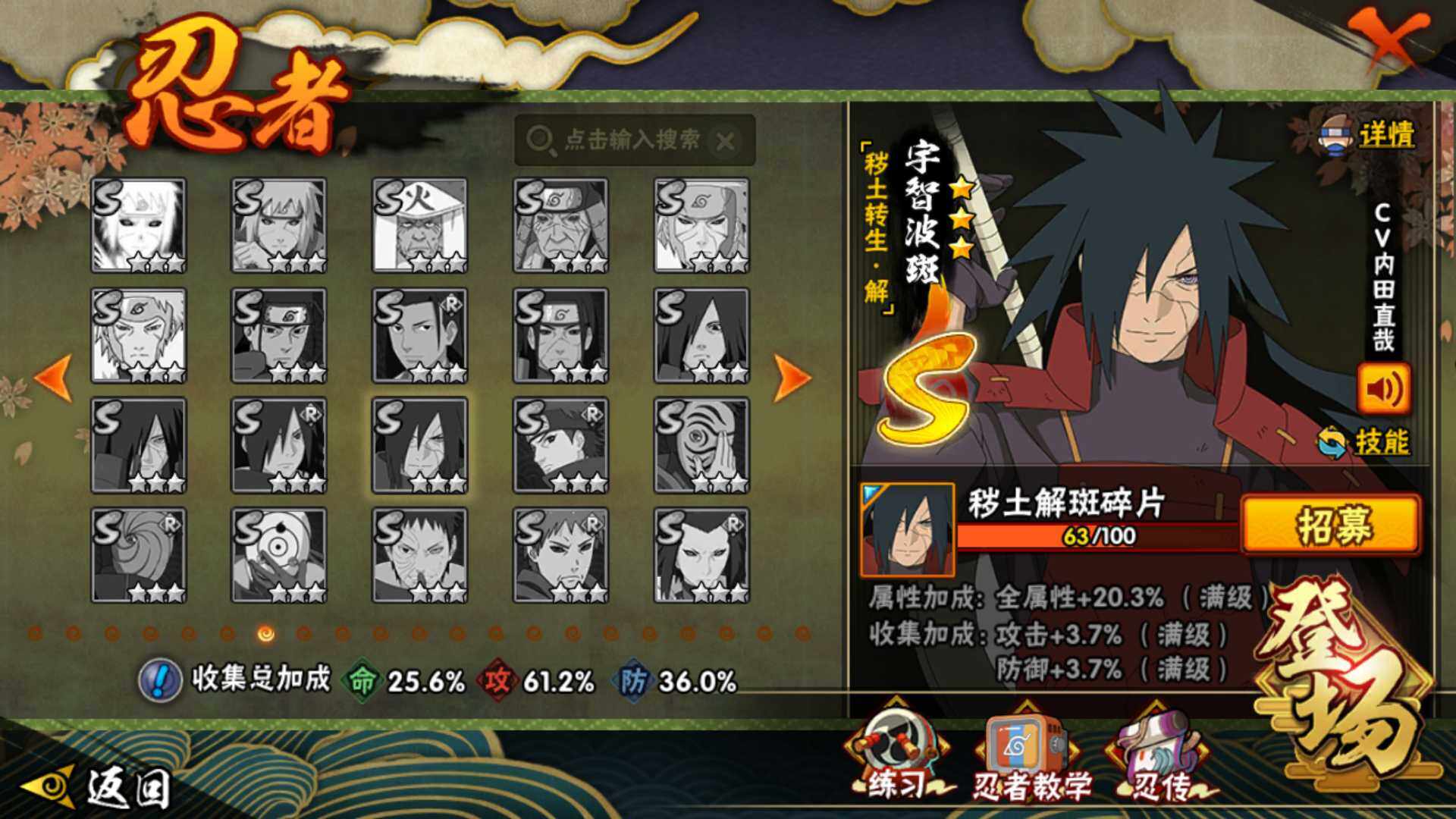 【S级忍者】:宇智波鼬「秽土转生」(3星),宇智波鼬「须佐能乎」(3星),自来也「舞之豪杰」(3星),波风水门(3星),神秘面具男「红夜之刃」(3星),佩恩「天道」(3星),宇智波佐助「永恒万花筒」(3星),漩涡鸣人「暴怒·第六尾」(3星)