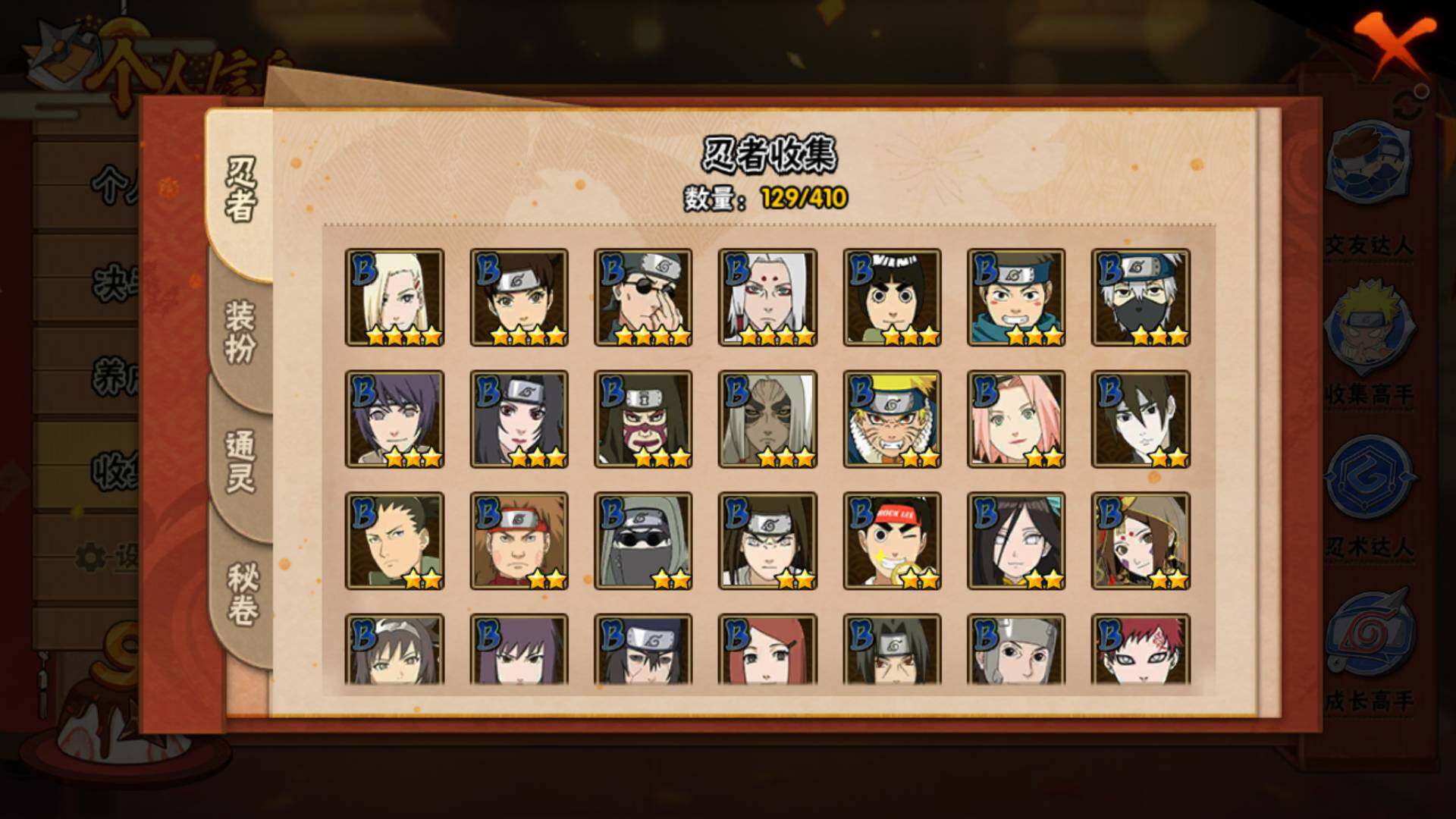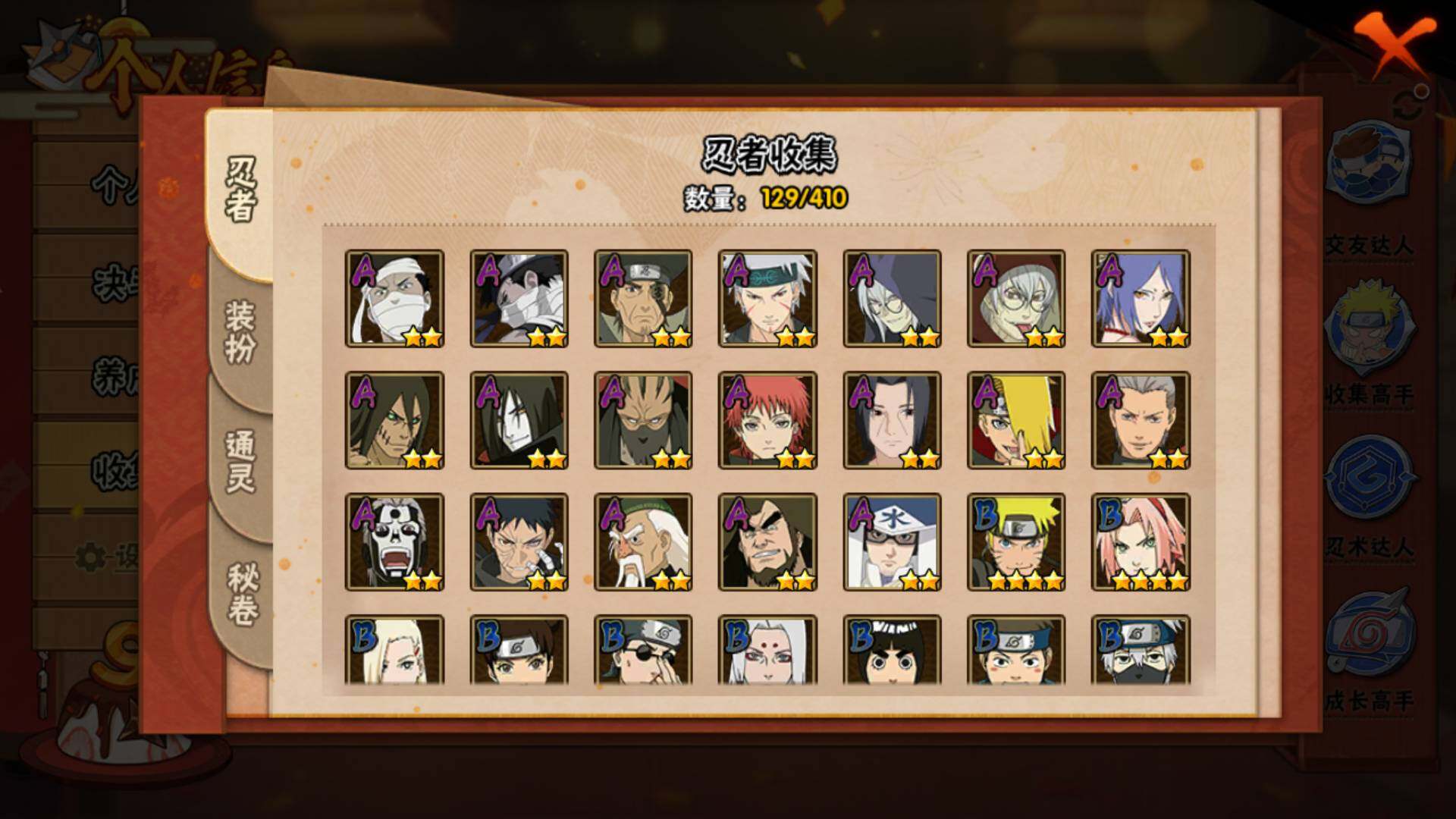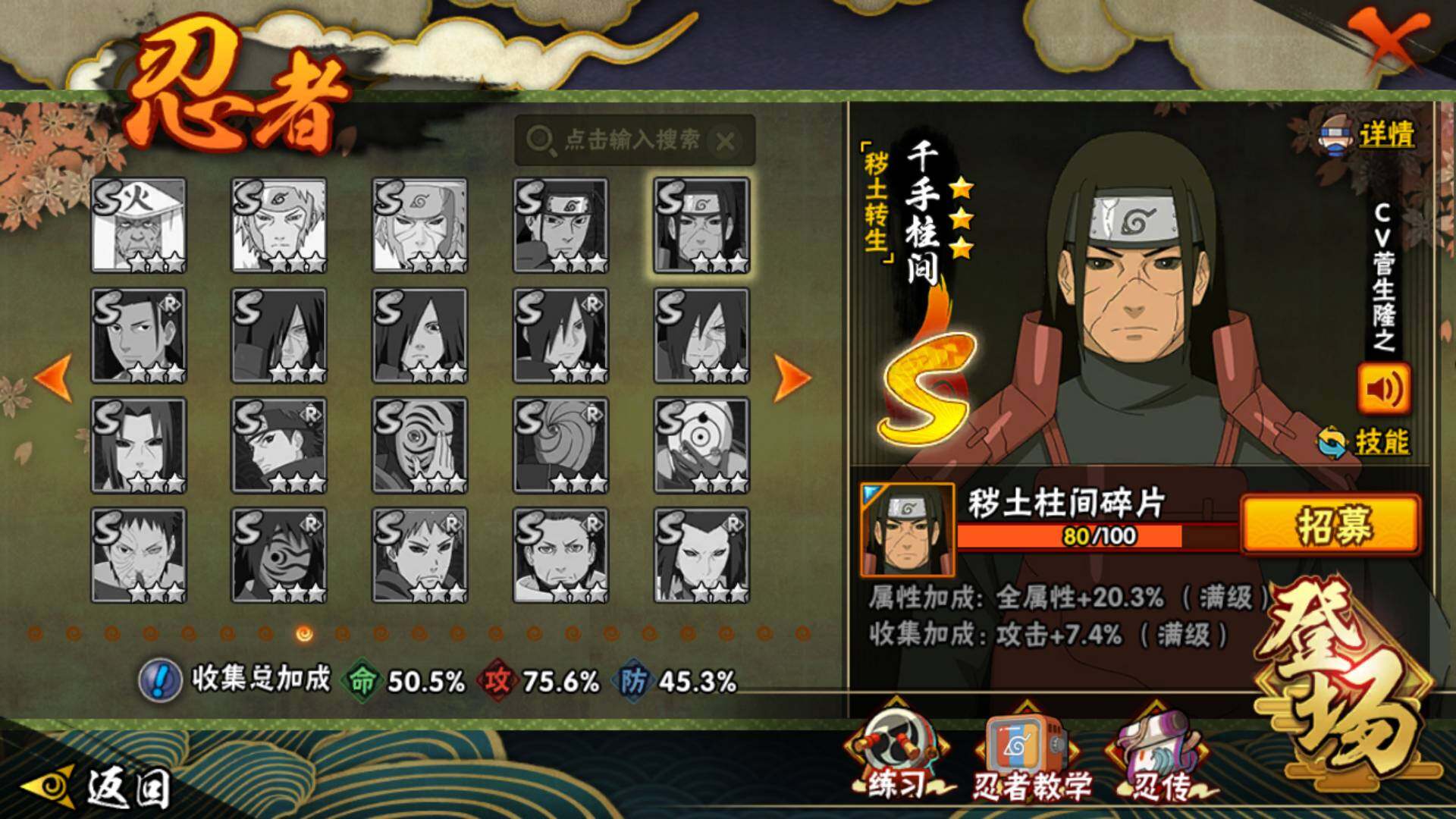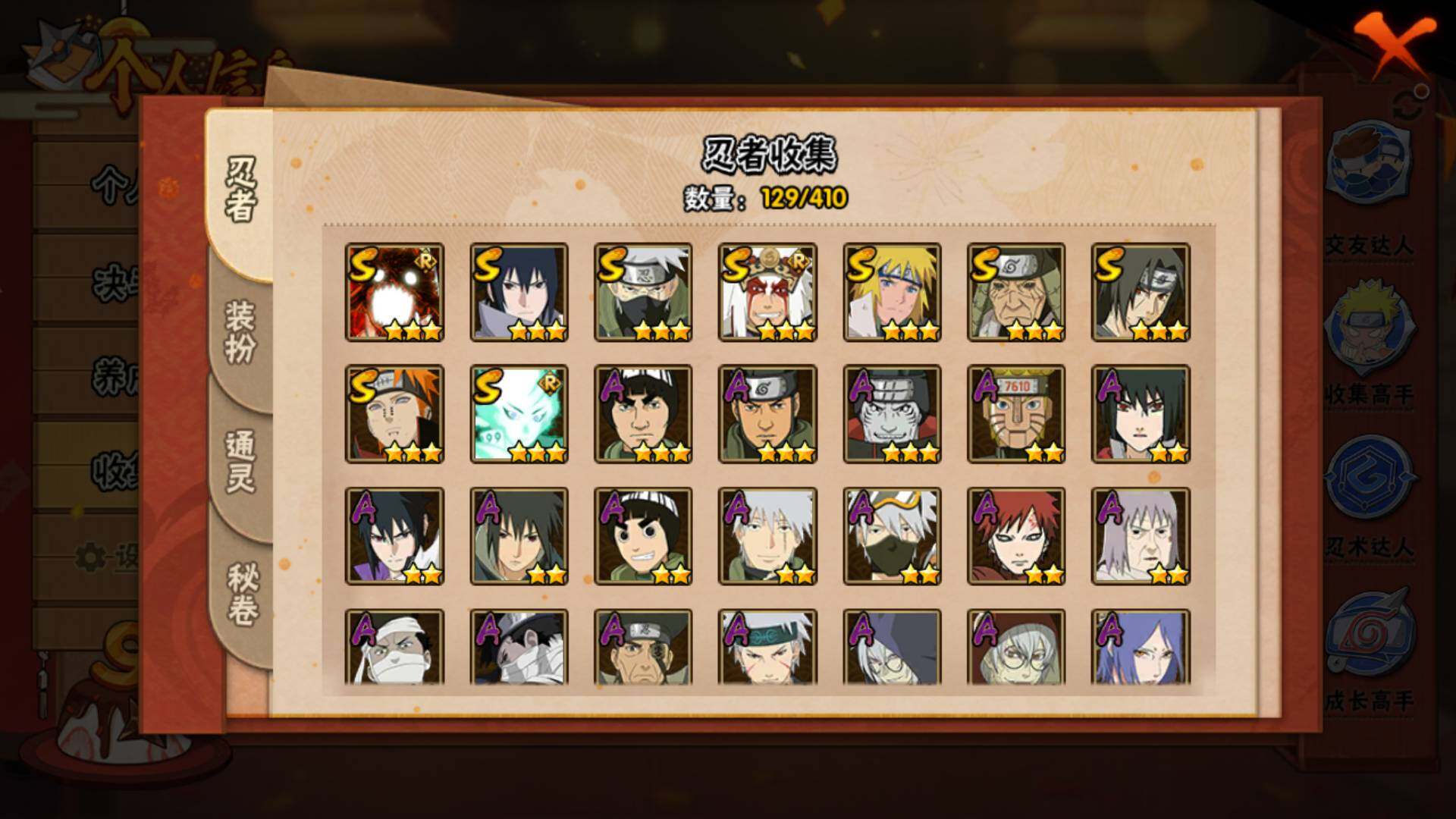 【S级忍者】:猿飞日斩「秽土转生」(3星),宇智波鼬「须佐能乎」(3星),旗木卡卡西「须佐能乎」(3星),自来也「舞之豪杰」(3星),波风水门(3星),佩恩「天道」(3星),宇智波佐助「永恒万花筒」(3星),大筒木舍人「最终