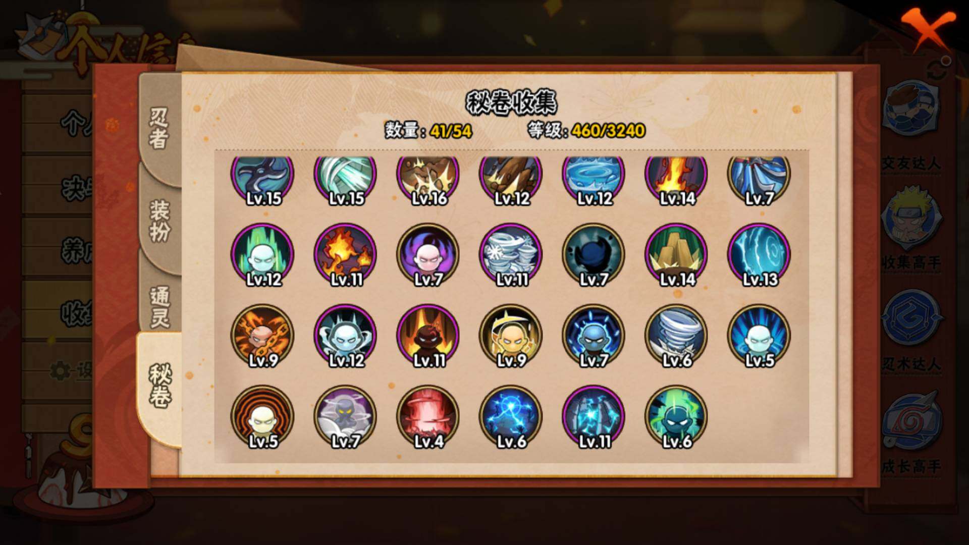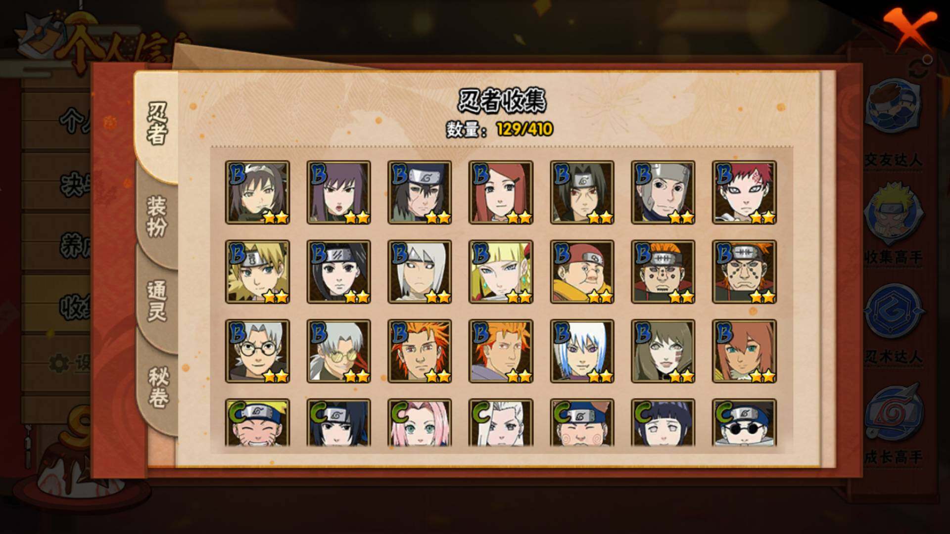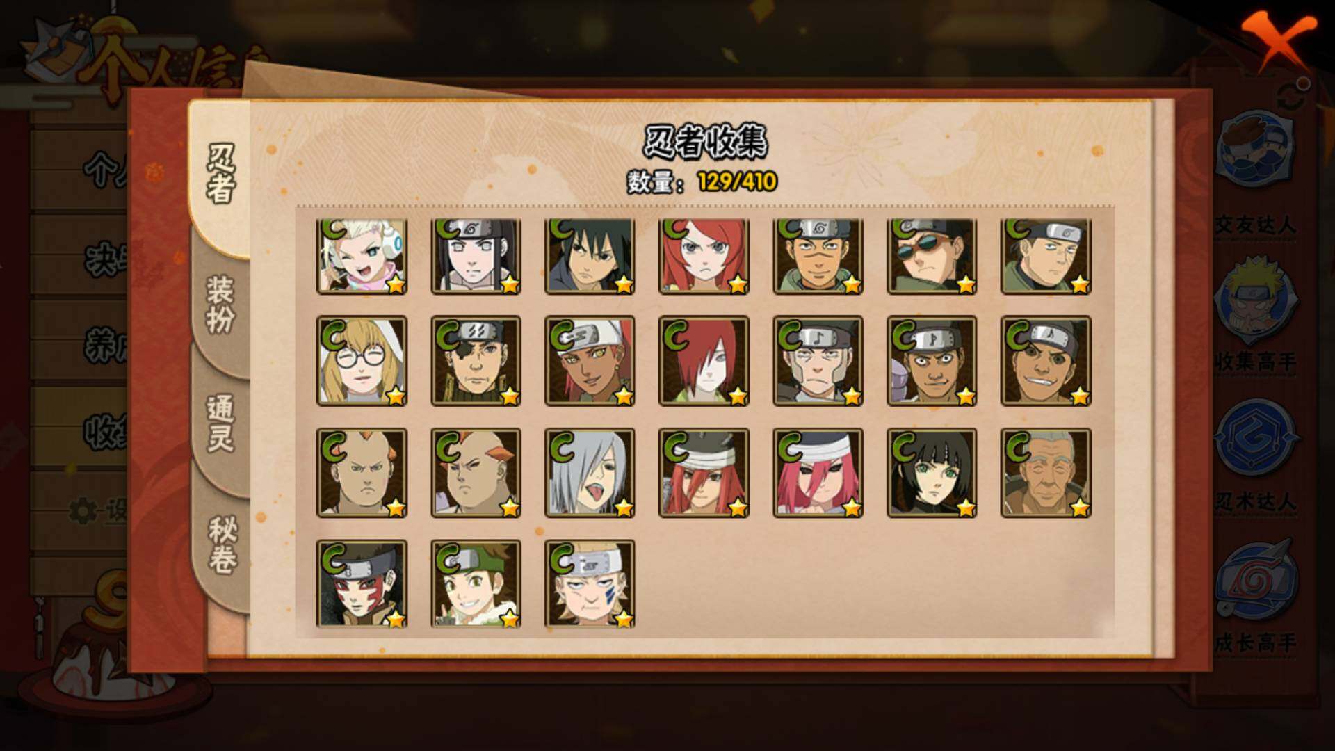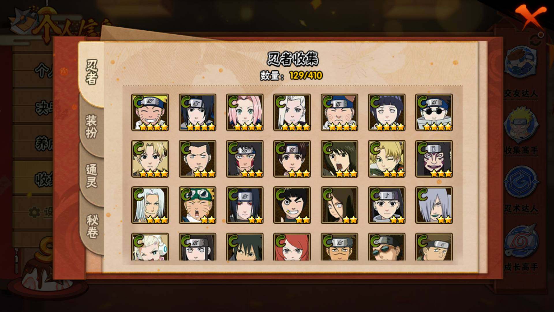 【S级忍者】:猿飞日斩「秽土转生」(3星),宇智波鼬「须佐能乎」(3星),旗木卡卡西「须佐能乎」(3星),自来也「舞之豪杰」(3星),波风水门(3星),佩恩「天道」(3星),宇智波佐助「永恒万花筒」(3星),大筒木舍人「最终
