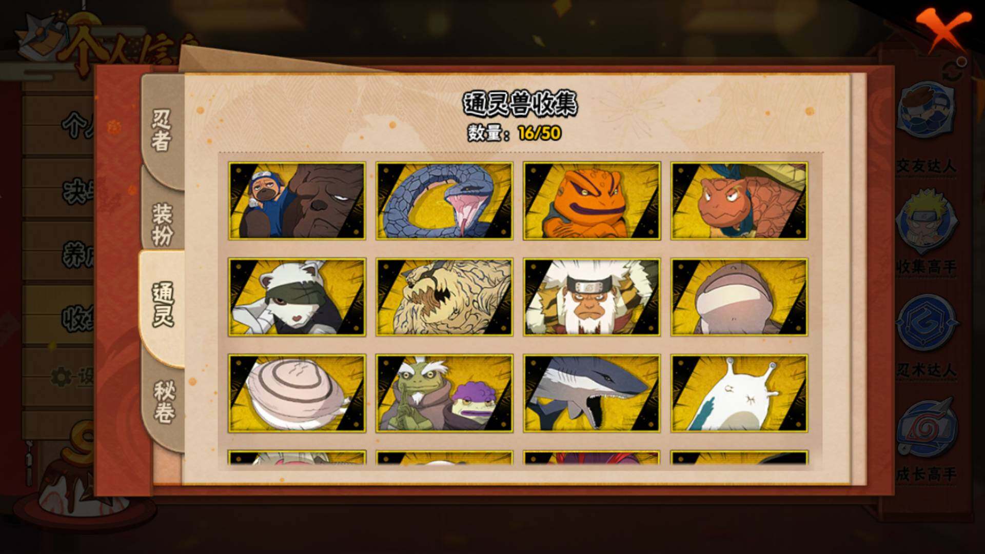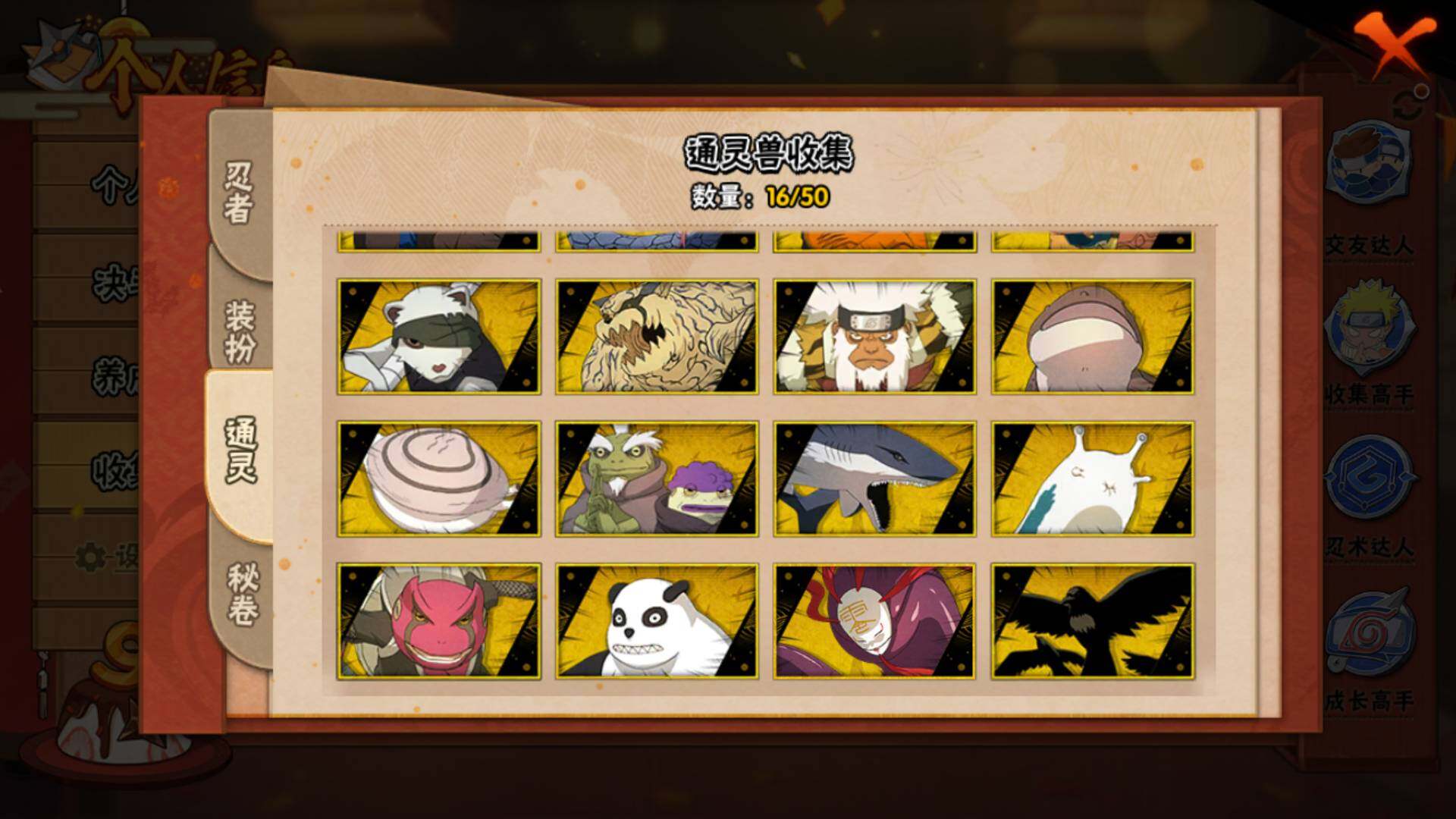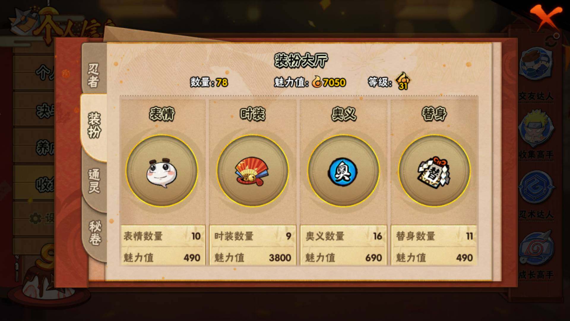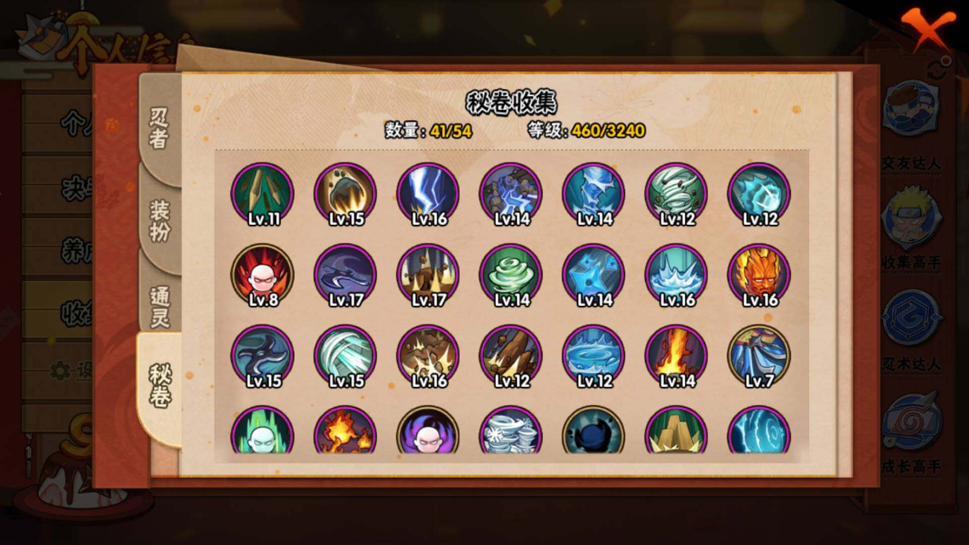 【S级忍者】:猿飞日斩「秽土转生」(3星),宇智波鼬「须佐能乎」(3星),旗木卡卡西「须佐能乎」(3星),自来也「舞之豪杰」(3星),波风水门(3星),佩恩「天道」(3星),宇智波佐助「永恒万花筒」(3星),大筒木舍人「最终