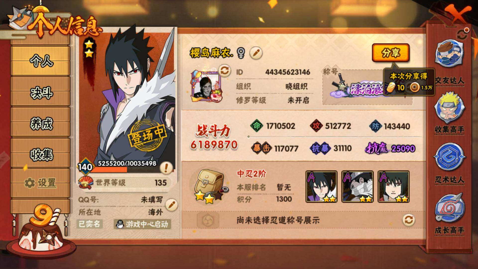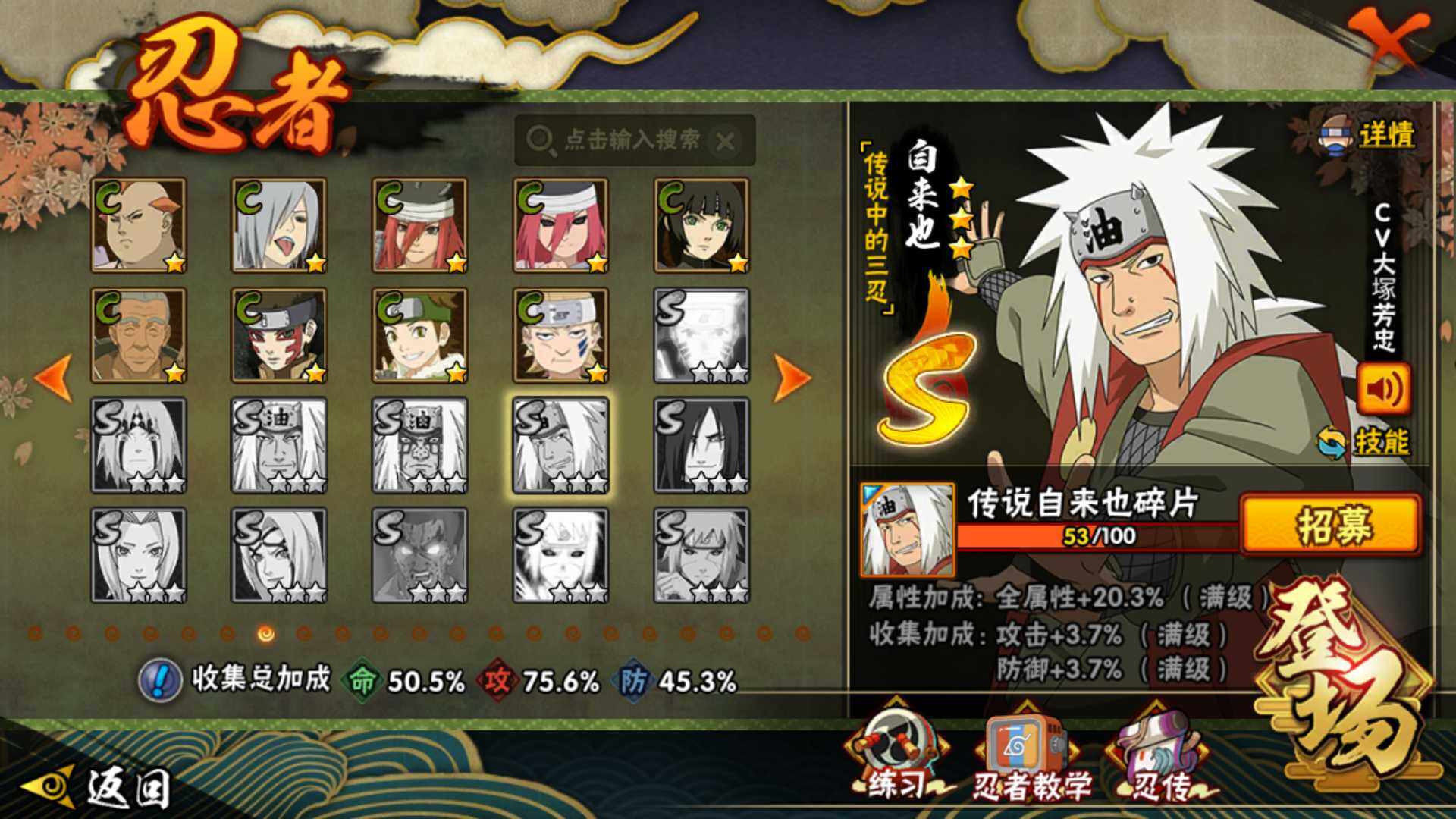 火影忍者【安卓QQ】v11 9S 29A 618w战力 热门A忍:漂泊忍者 传说自来也53片 金水