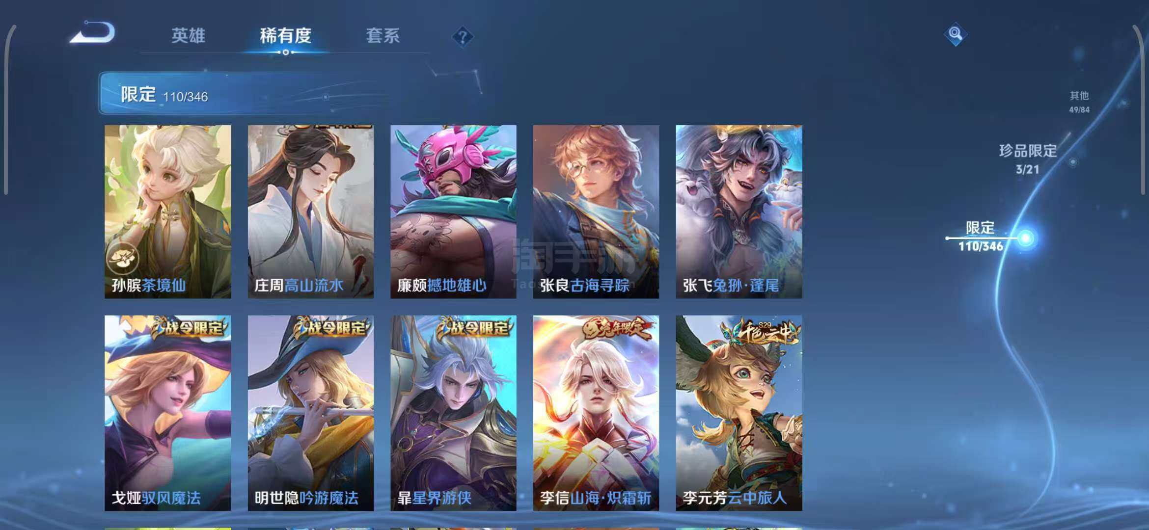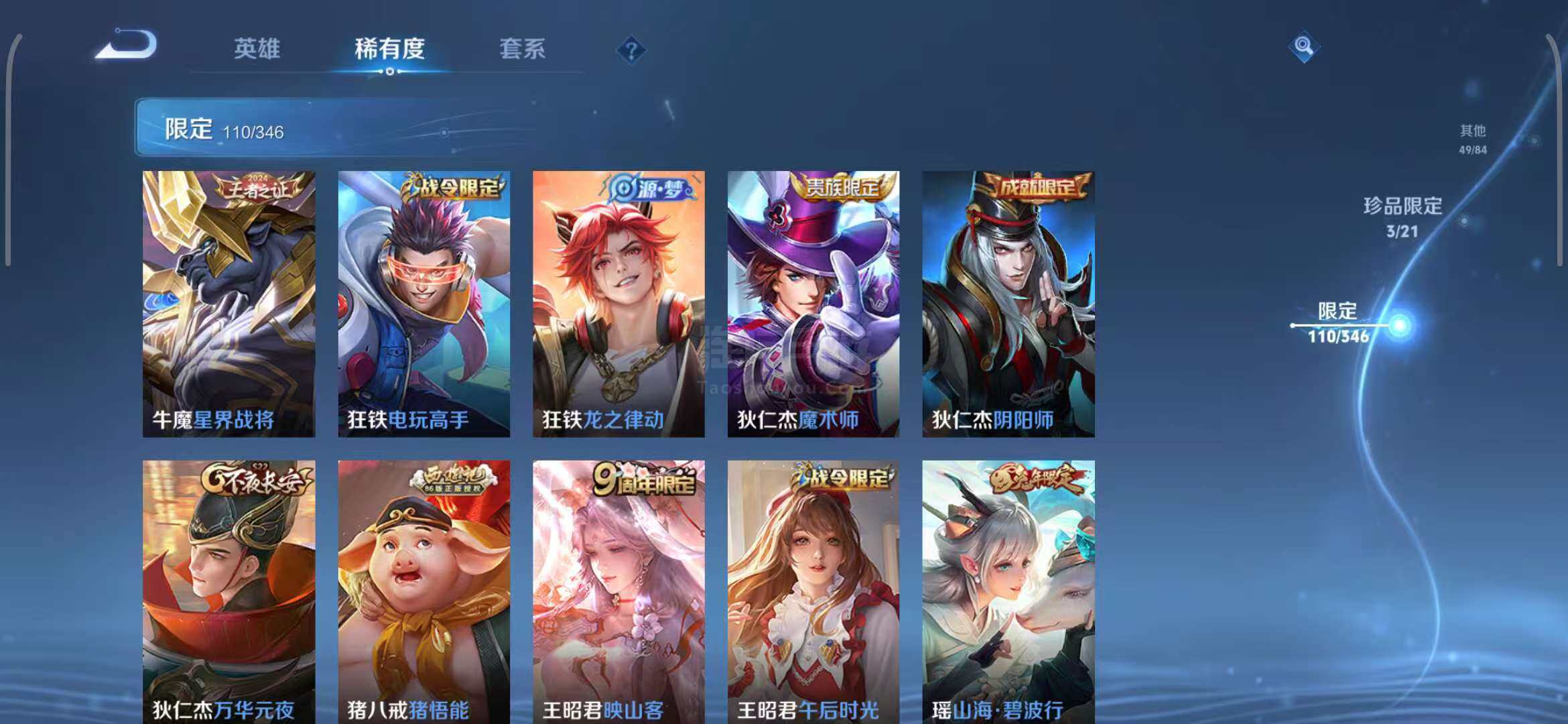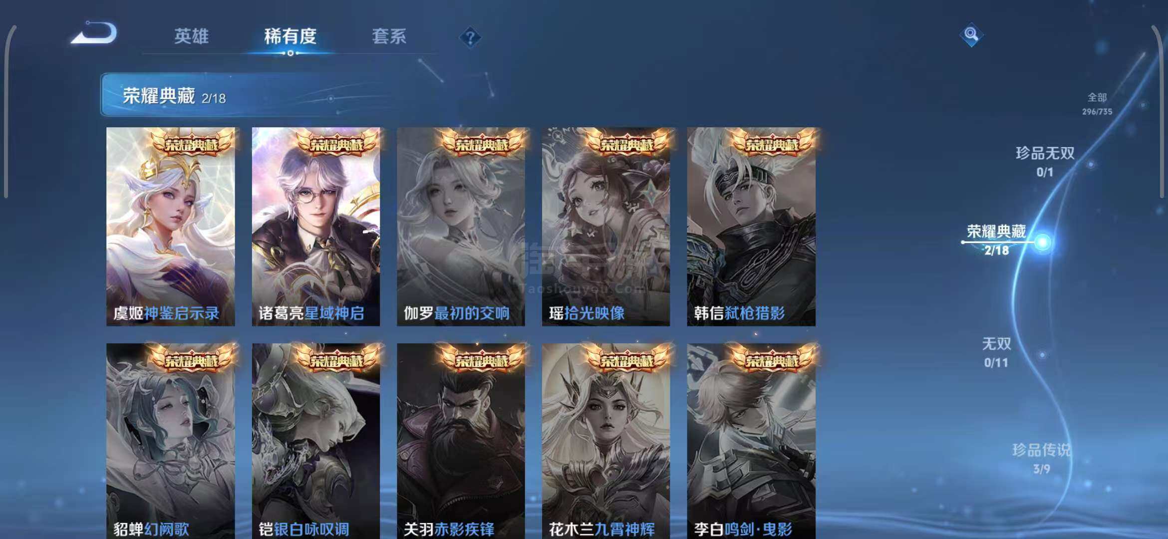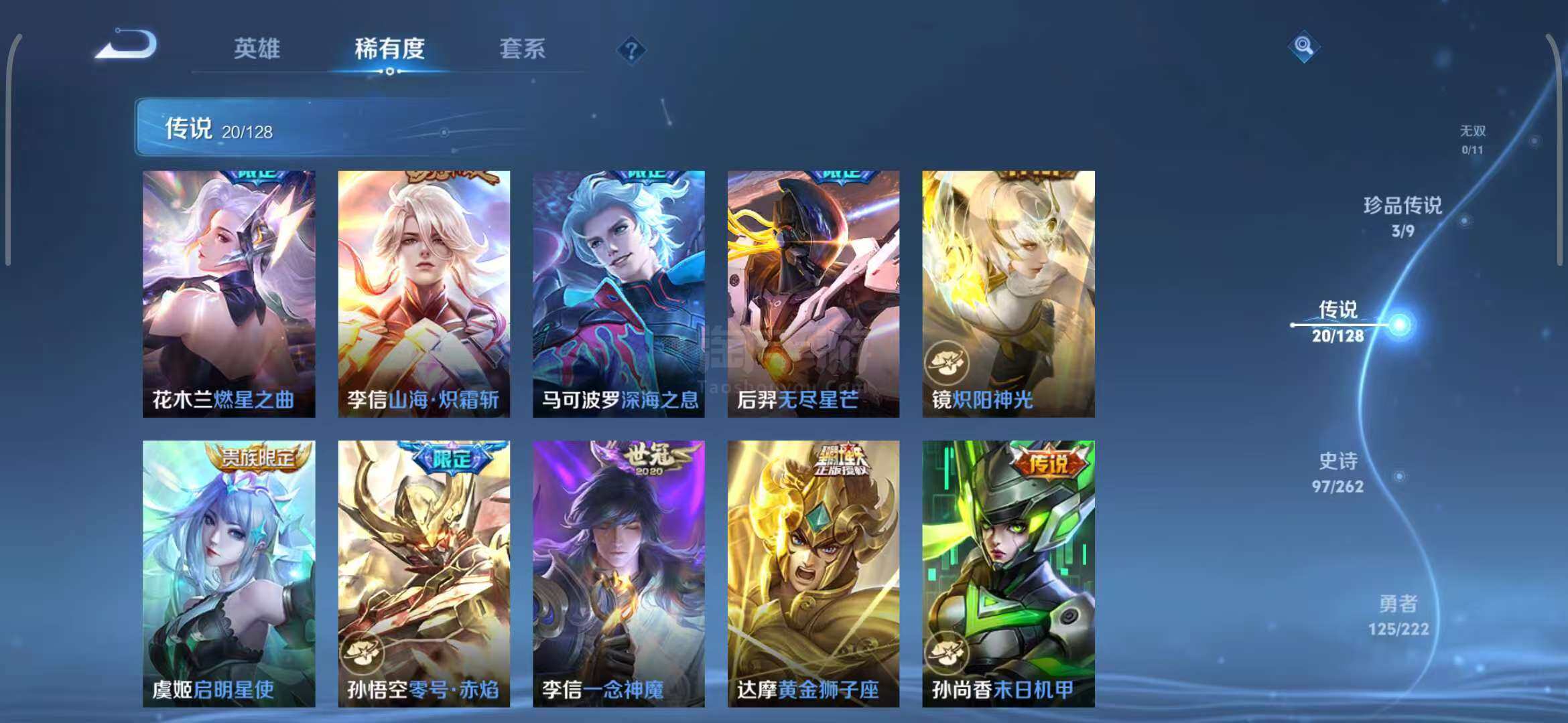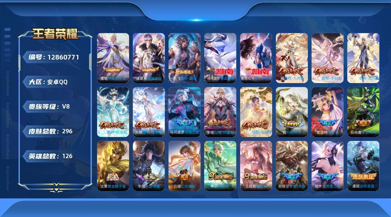 安卓Q-V8-至尊星耀V段位-126英雄-296皮肤-2典藏-0珍品无双-0无双-3珍品传说-20传