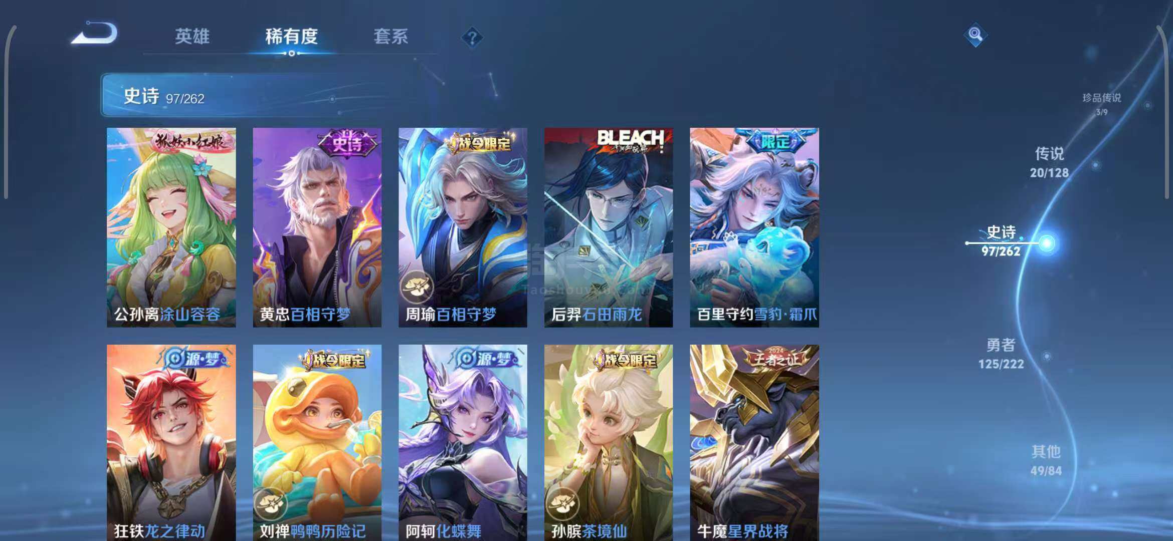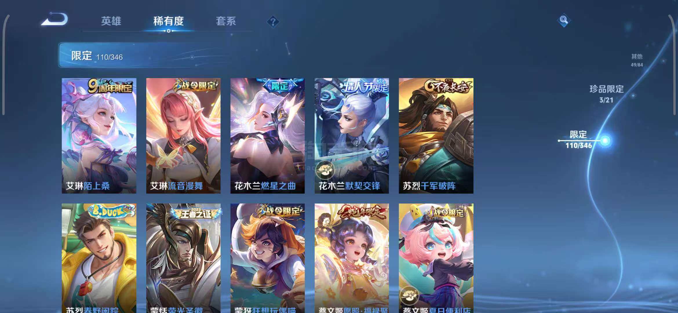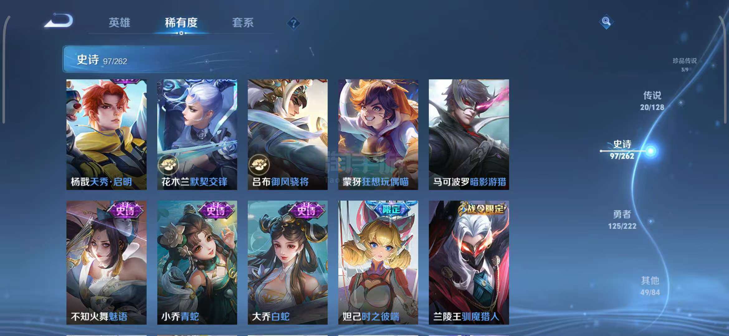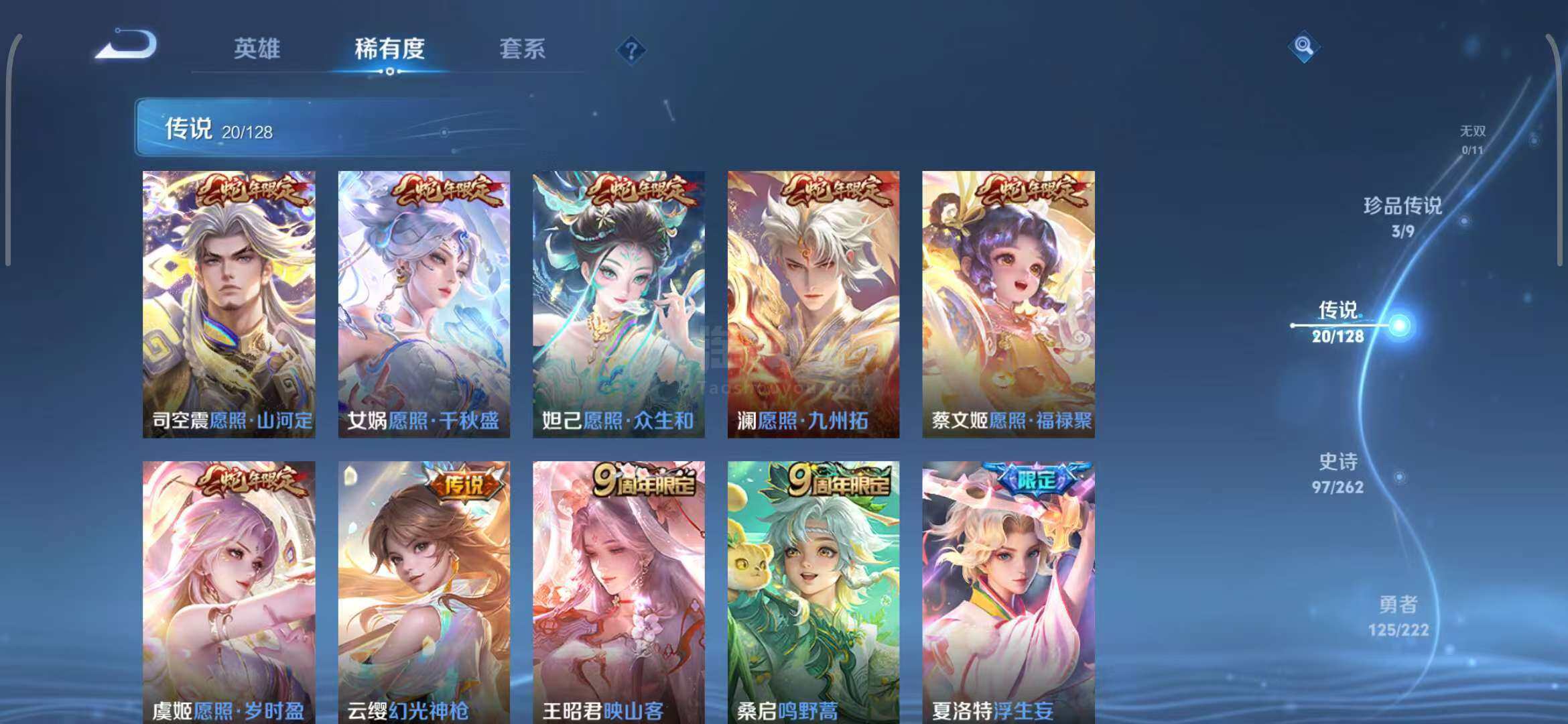 安卓Q-V8-至尊星耀V段位-126英雄-296皮肤-2典藏-0珍品无双-0无双-3珍品传说-20传
