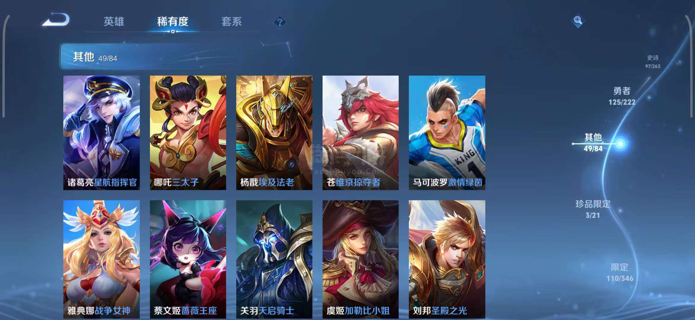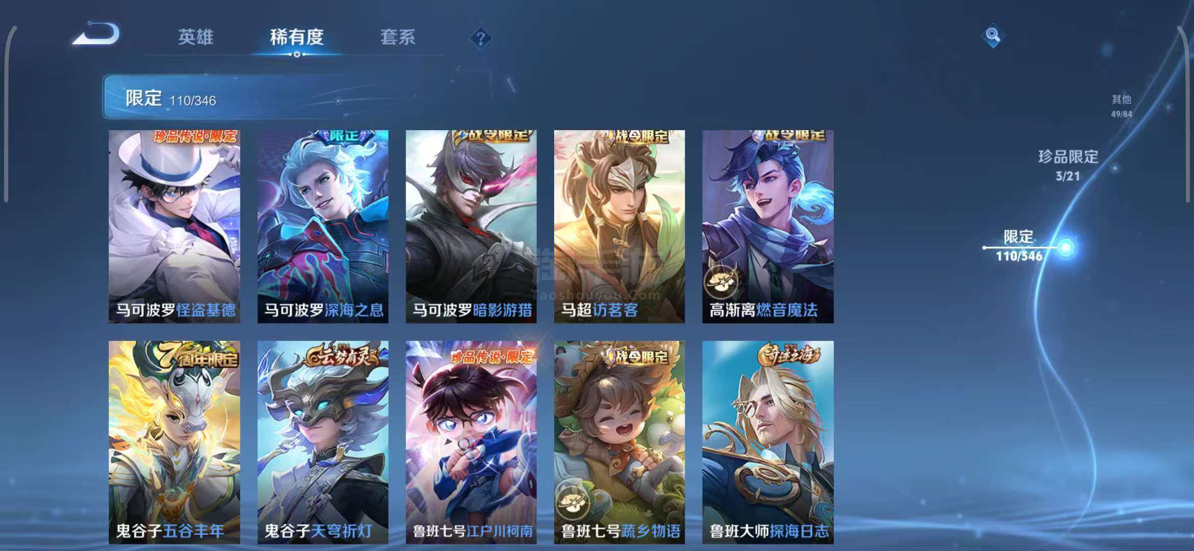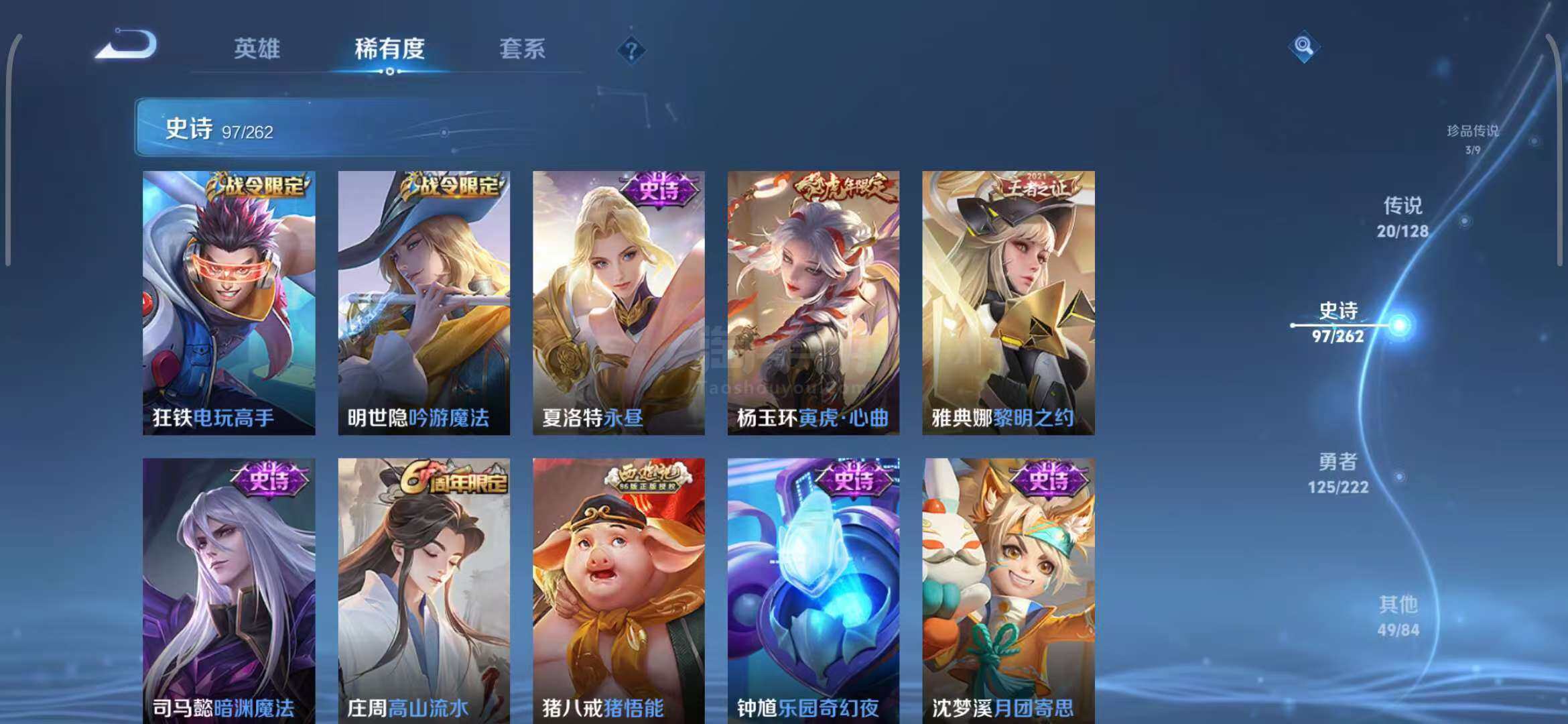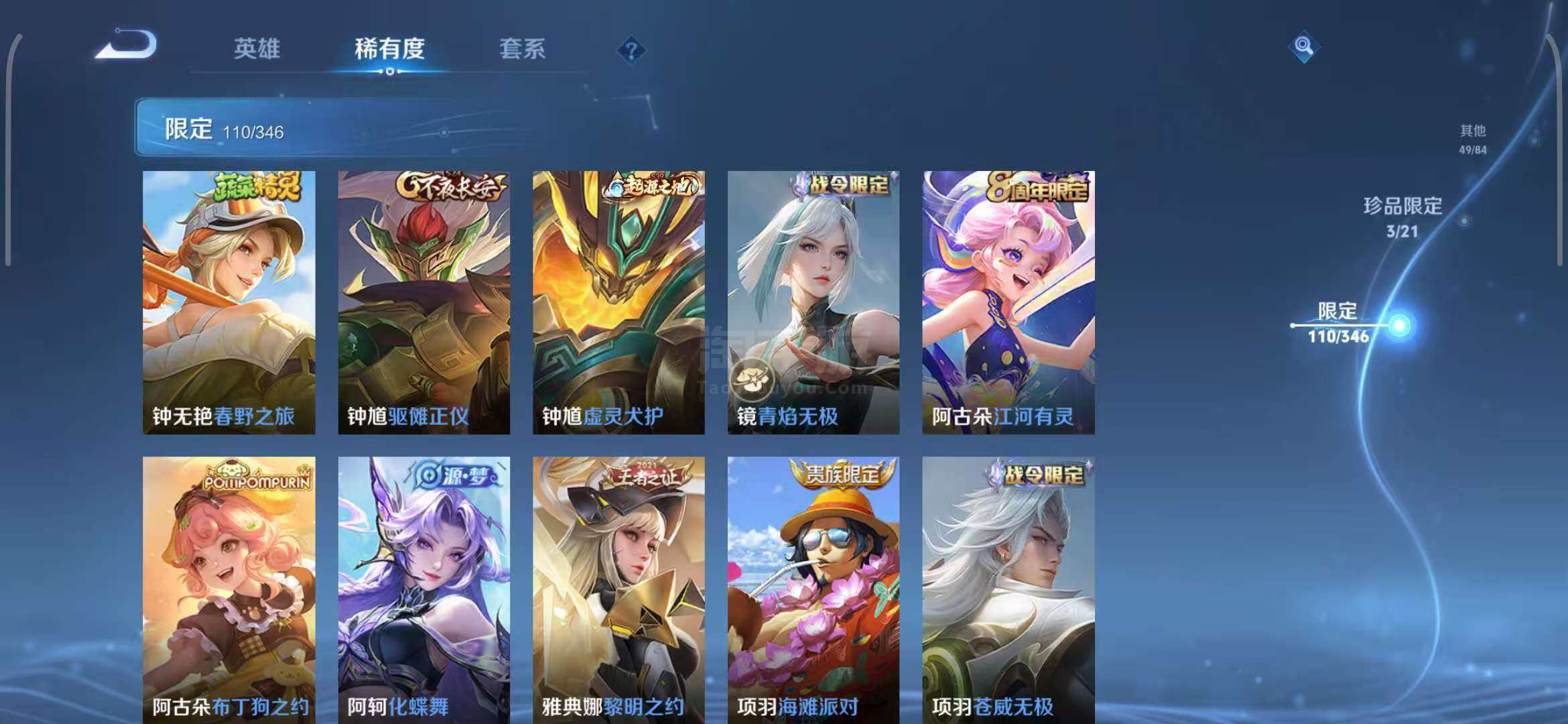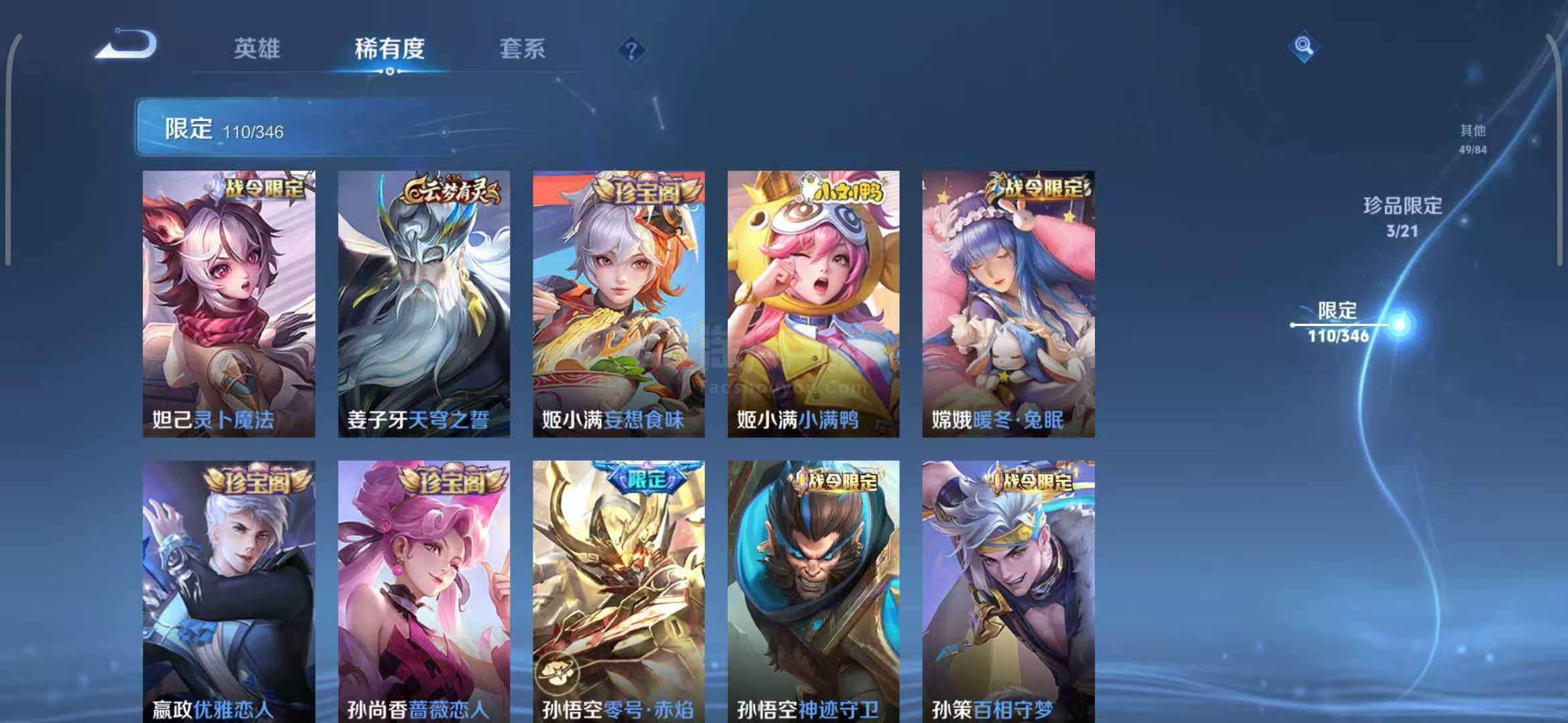 安卓Q-V8-至尊星耀V段位-126英雄-296皮肤-2典藏-0珍品无双-0无双-3珍品传说-20传