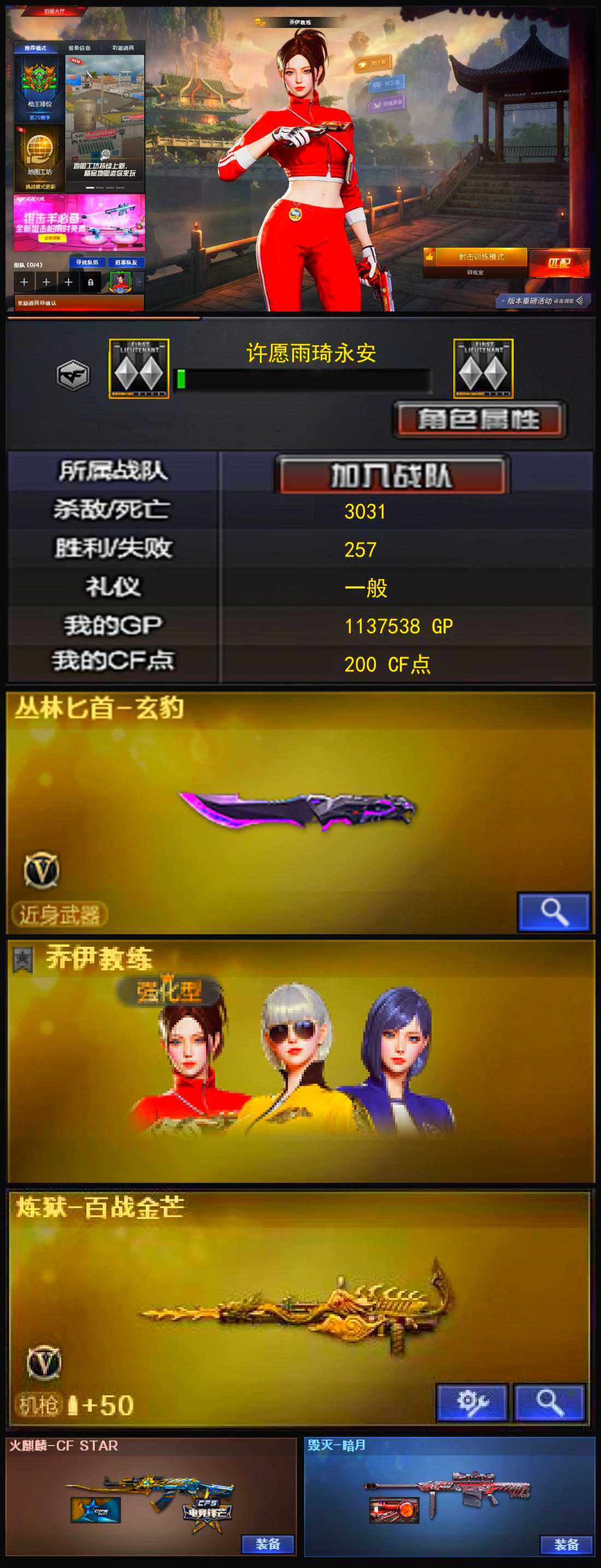 穿越火线(CF)【端游】河南一区-10V-0王者-0炫金【丛林匕首-玄豹】【炼狱-百战金芒】【乔伊教练