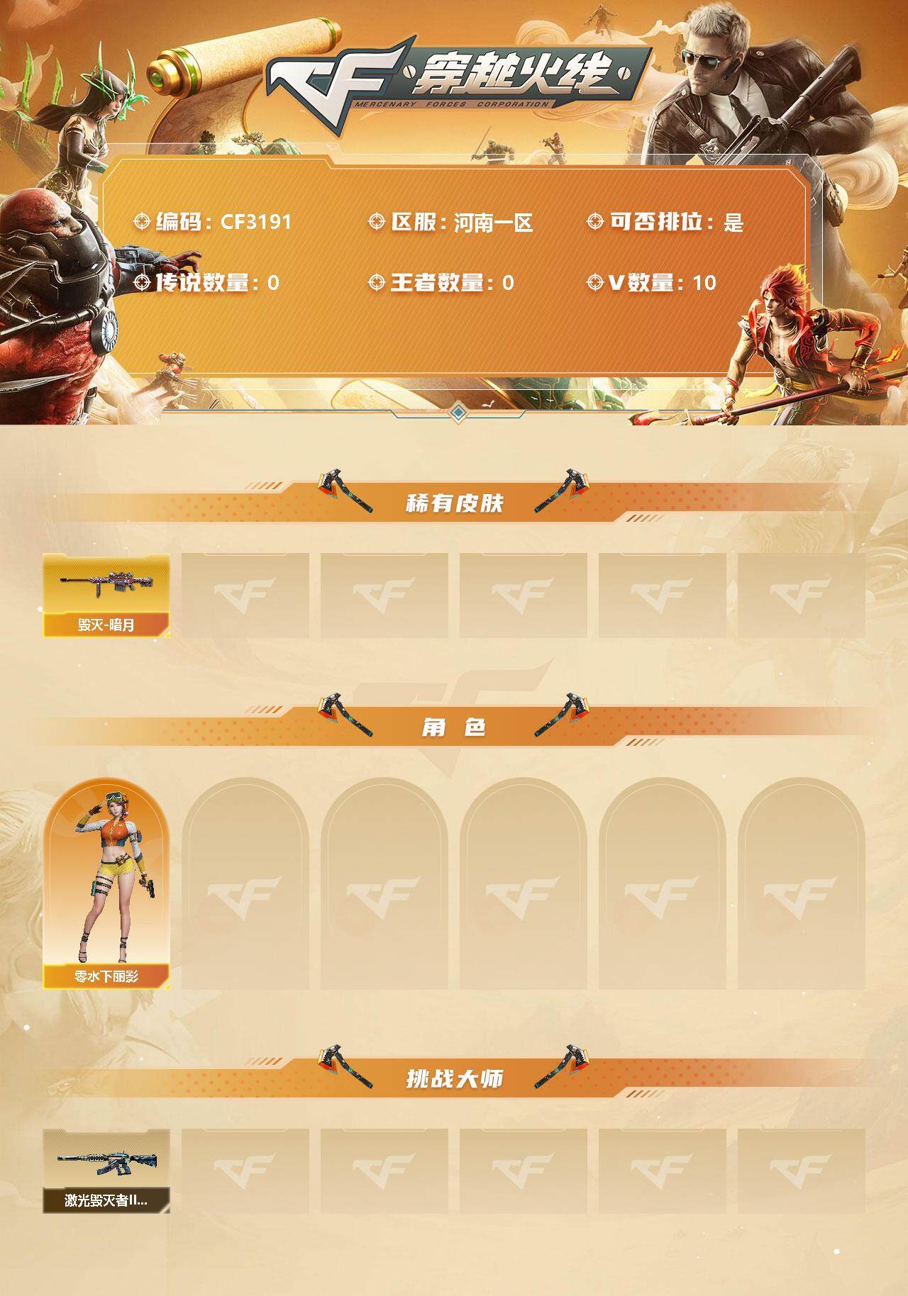 河南一区-10V-0王者-0炫金【丛林匕首-玄豹】【炼狱-百战金芒】【乔伊教练】【火麒麟-CFSTAR】【毁灭-暗月】