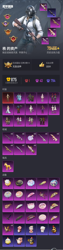 苹果【极品红装号/战神框/一套绝世印记/14王牌印记/298扭蛋碎片/沙丘之主-图卡盟(五级)/M416-星际漫游/怪诞乔克/甜心巧克力/放客神游/雪国幻梦/初号机 觉醒Ver/寒蝎幽灵/赤蝎幽灵/冥河战士/派对舞王/天网终结者/沙漠守护者/暗影哥特/粉螳螂/蓝螳螂/萌熊伴侣背包/1神装-13粉装-8特效枪-1载具-4粉色飞行器】 手Q--79466热力值-14王牌印记-172套装-253枪皮