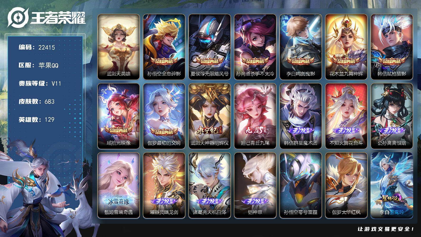 【荣耀典藏】:武则天英雄,孙悟空全息碎影,武则天倪克斯神谕,夏侯惇无限飓风号,小乔天鹅之梦,孙尚香杀手不太冷,鲁班七号星空梦想,芈月大秦宣太后,程咬金活力突击,李白鸣剑曳影,诸葛亮星域神启,花木兰九霄神辉,关羽赤影疾锋,铠银白咏叹调,貂蝉幻阙