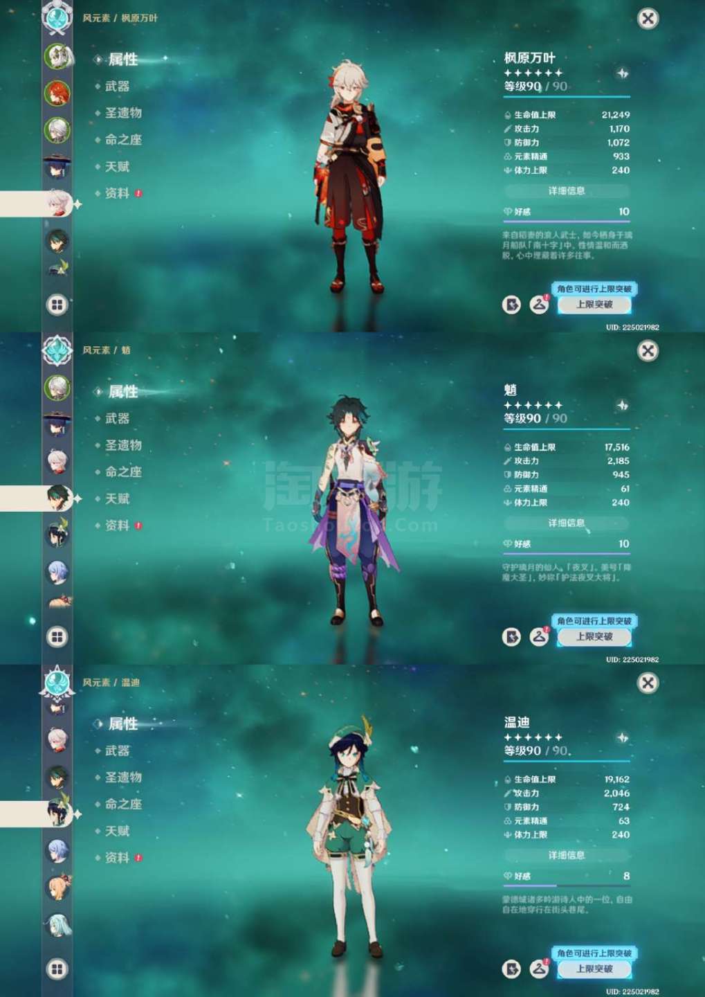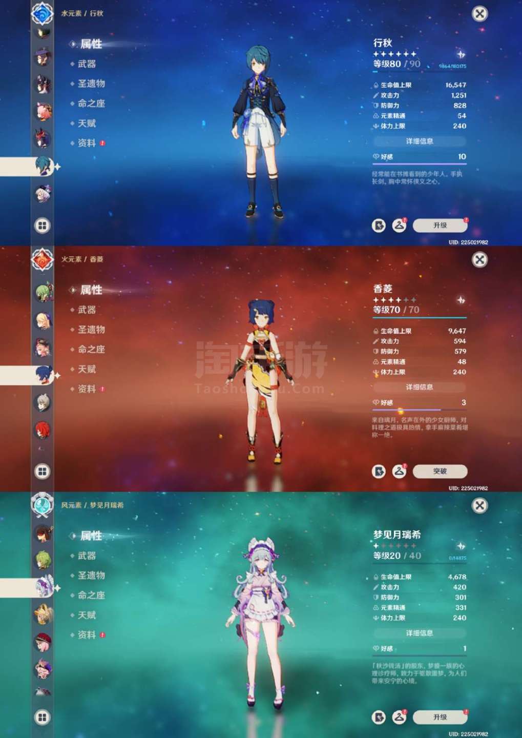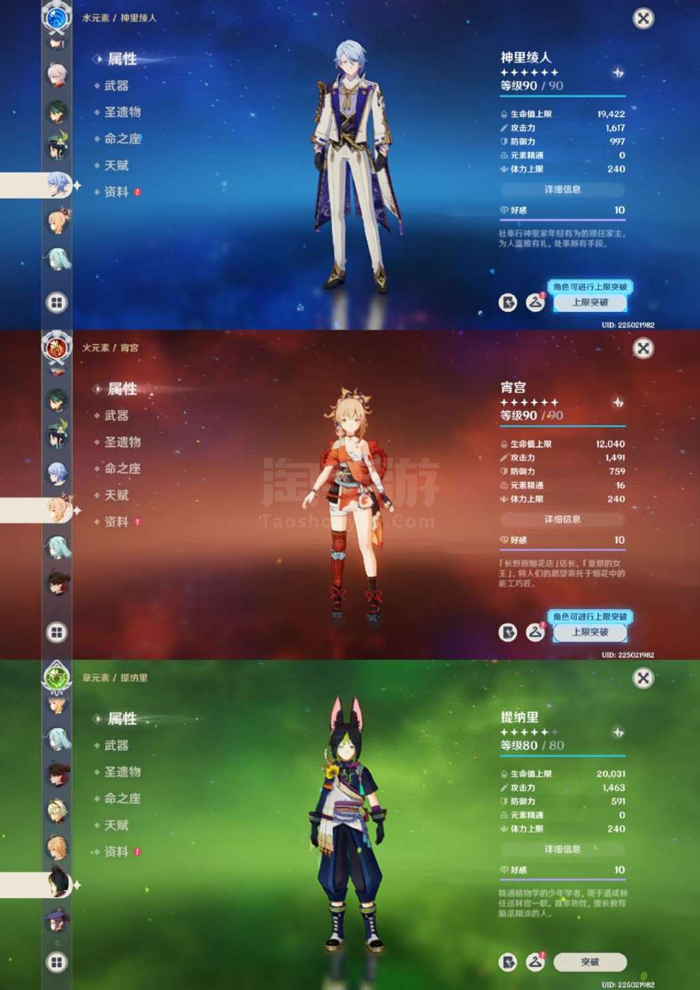 原神【安卓官方】火神仆人龙王草神都有专武,号里角色练度都很高,邮箱和taptap都没有绑定,号非常安全,具体情况看图