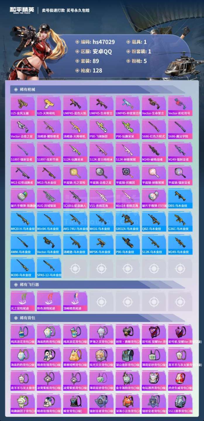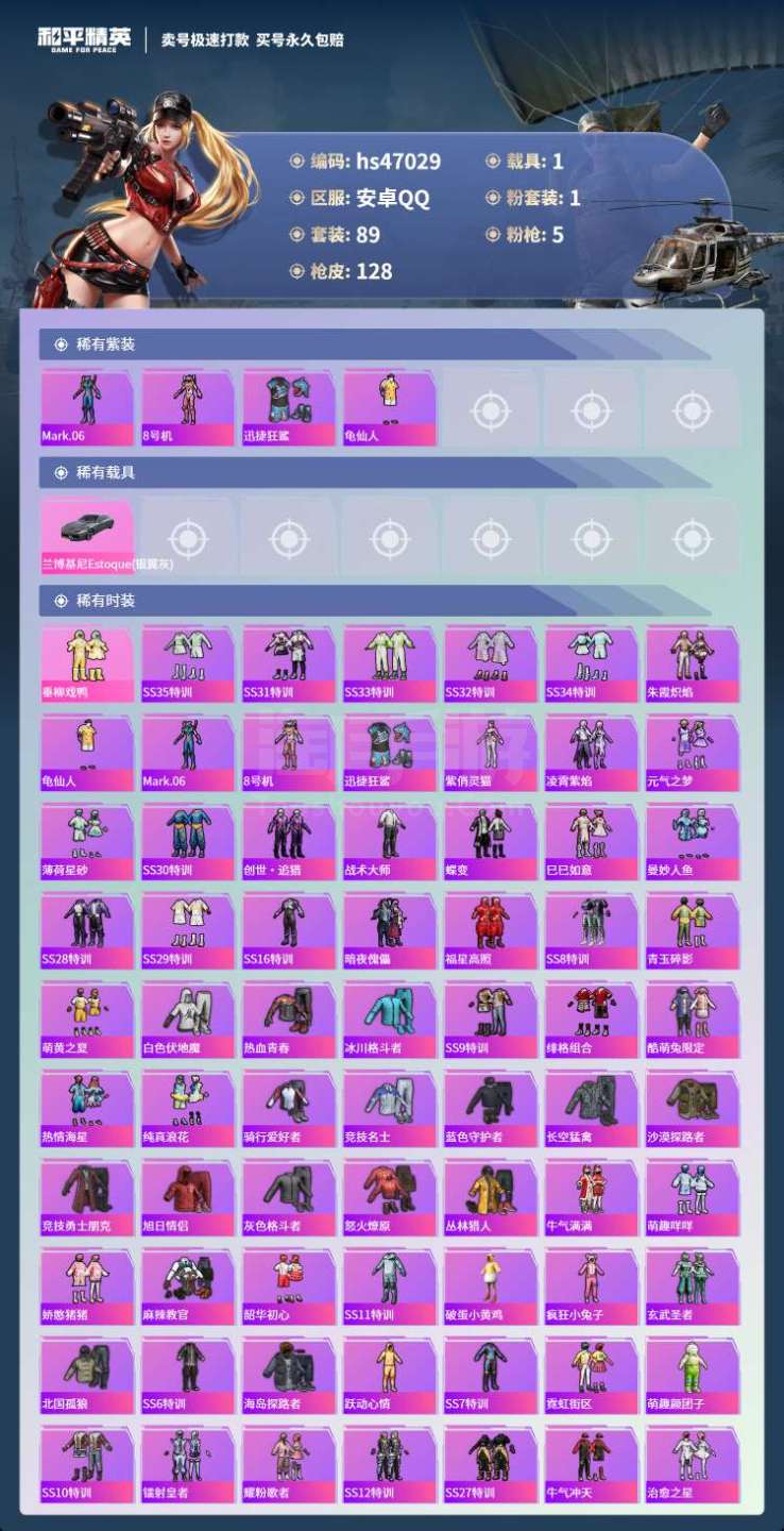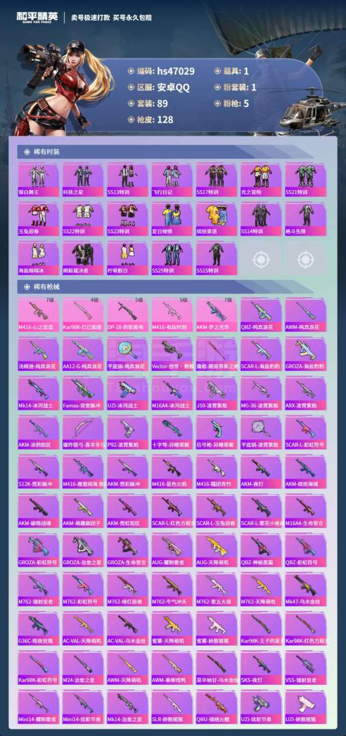 hs47029 安卓手Q-7王牌印记-1粉装-5特效枪-1载具-39689热力值-89套装-128枪