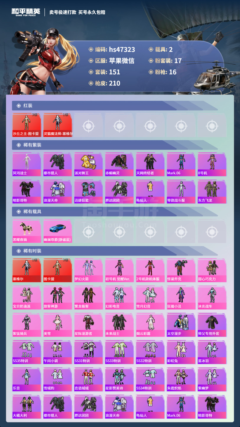 hs47323 苹果v-11王牌印记-17粉装-16特效枪-2载具-80676热力值-151套装-