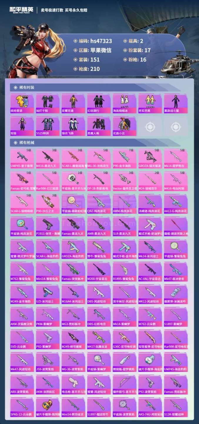 hs47323 苹果微-11王牌印记-17粉装-16特效枪-2载具-80676热力值-151套装-