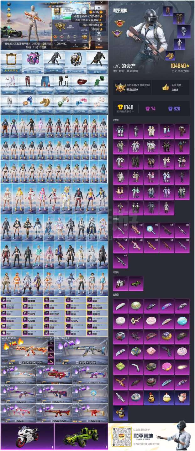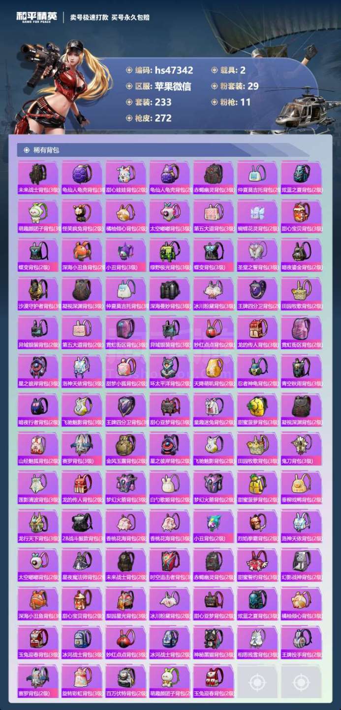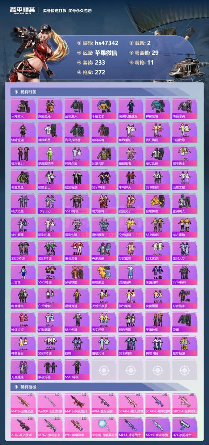 hs47342 苹果微-20王牌印记-有战神框-29粉装-11特效枪-2载具-104840热力值-
