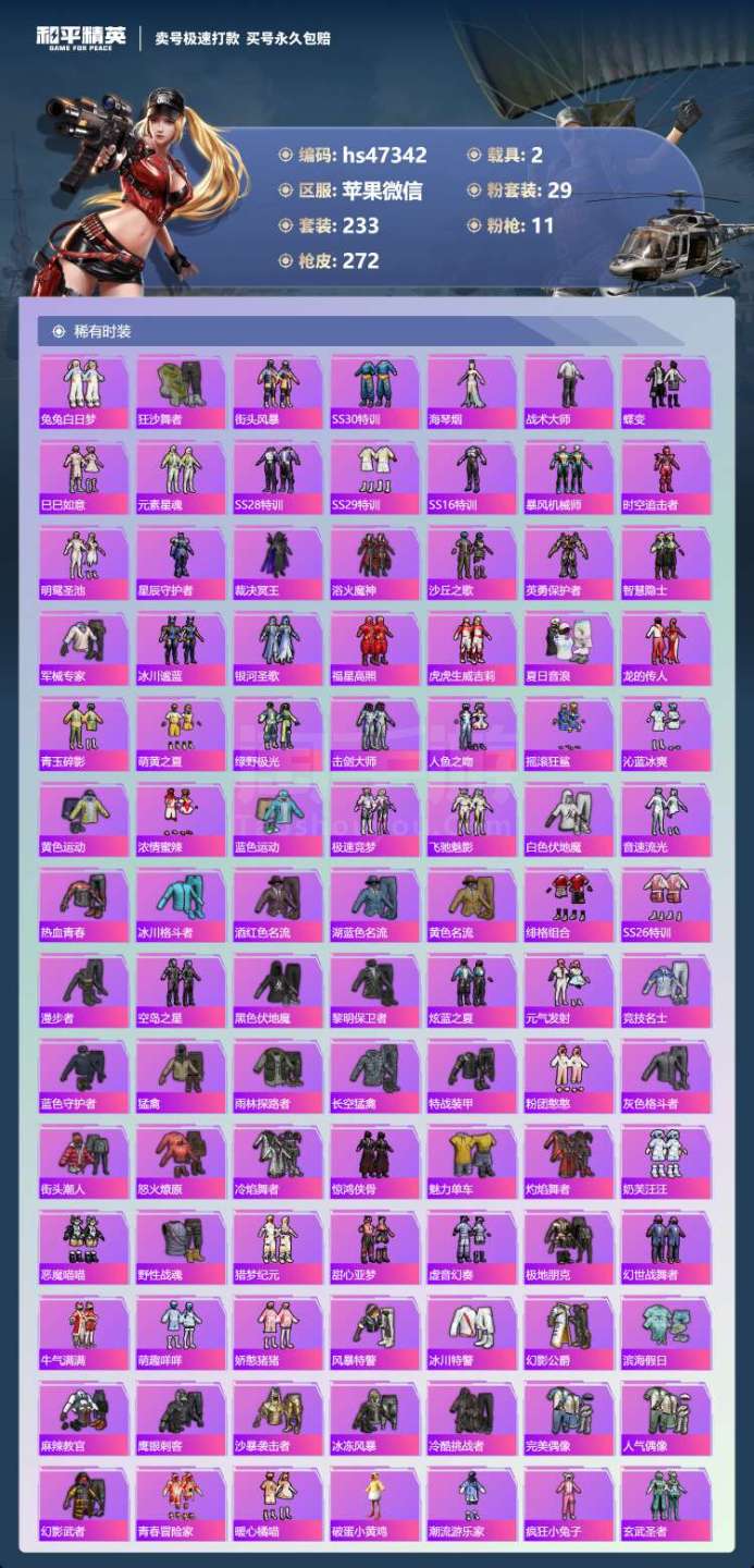 hs47342 苹果v-20王牌印记-有战神框-29粉装-11特效枪-2载具-104840热力值-