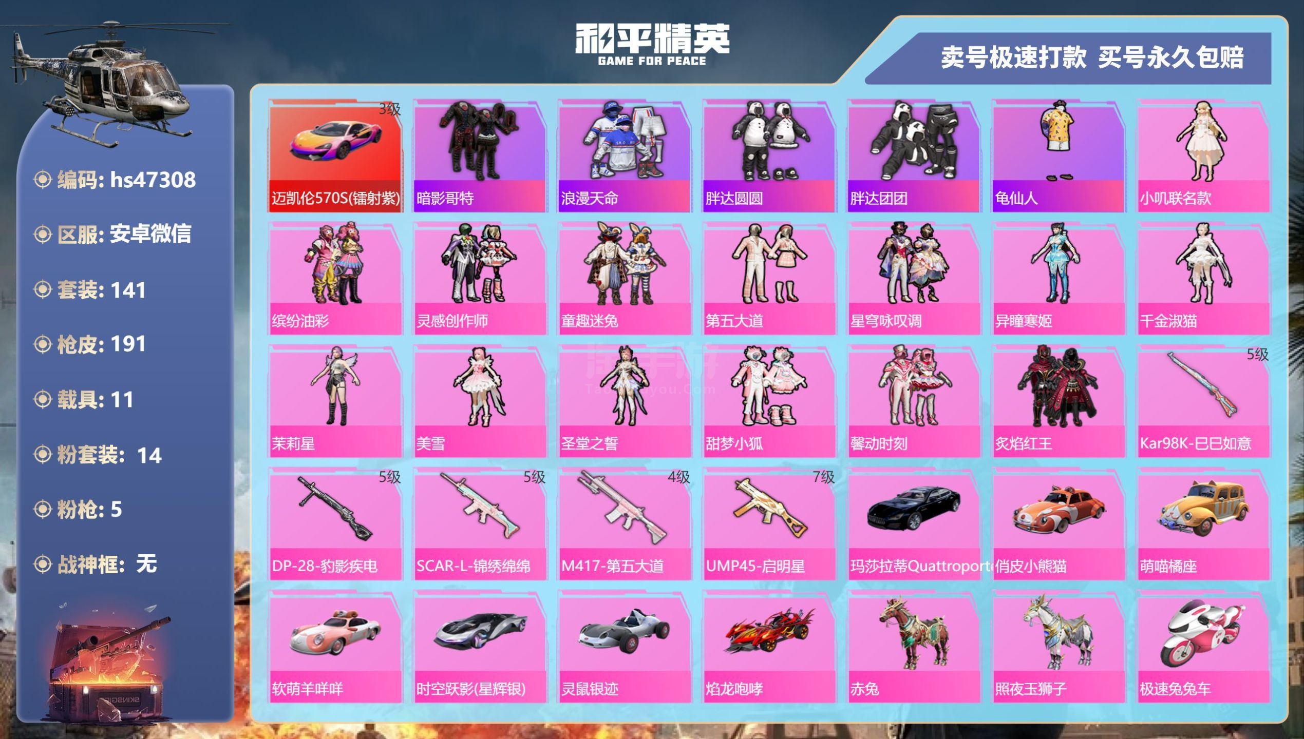hs47308 安卓v-15王牌印记-14粉装-5特效枪-11载具-79175热力值-141套装-