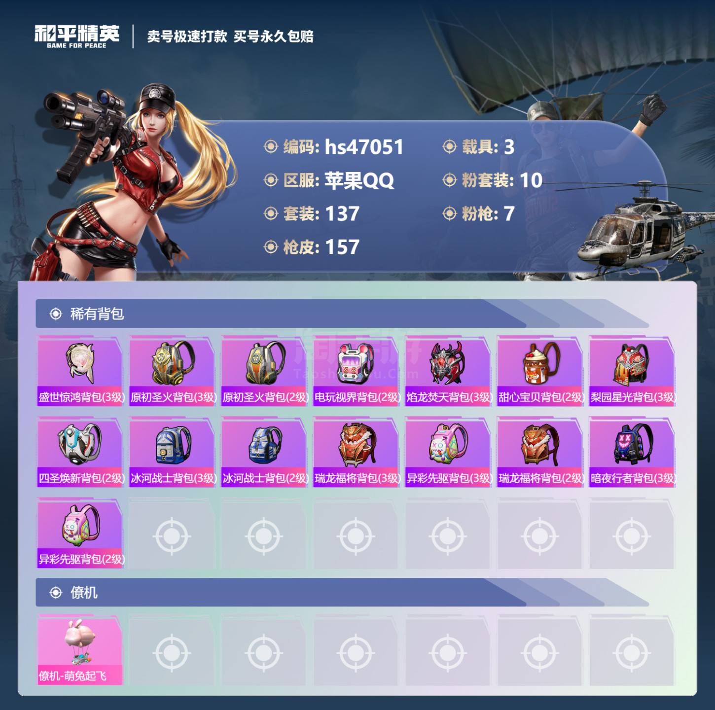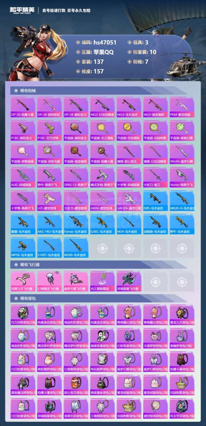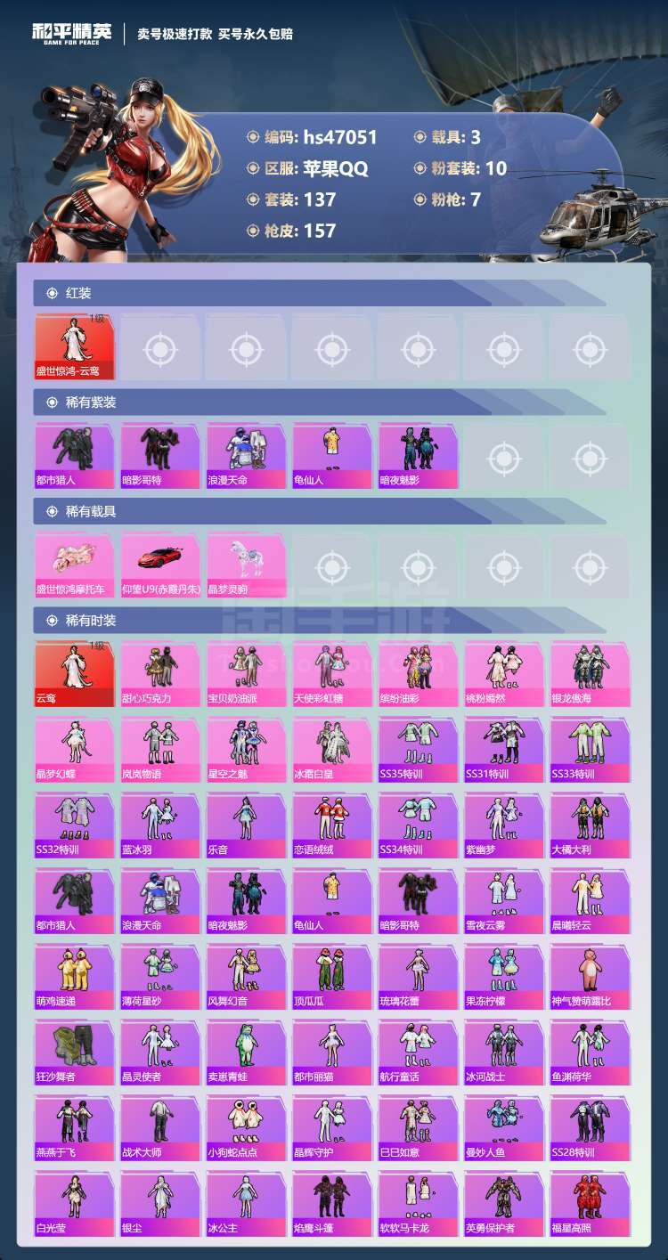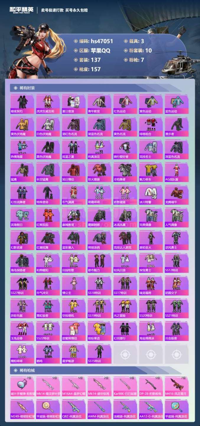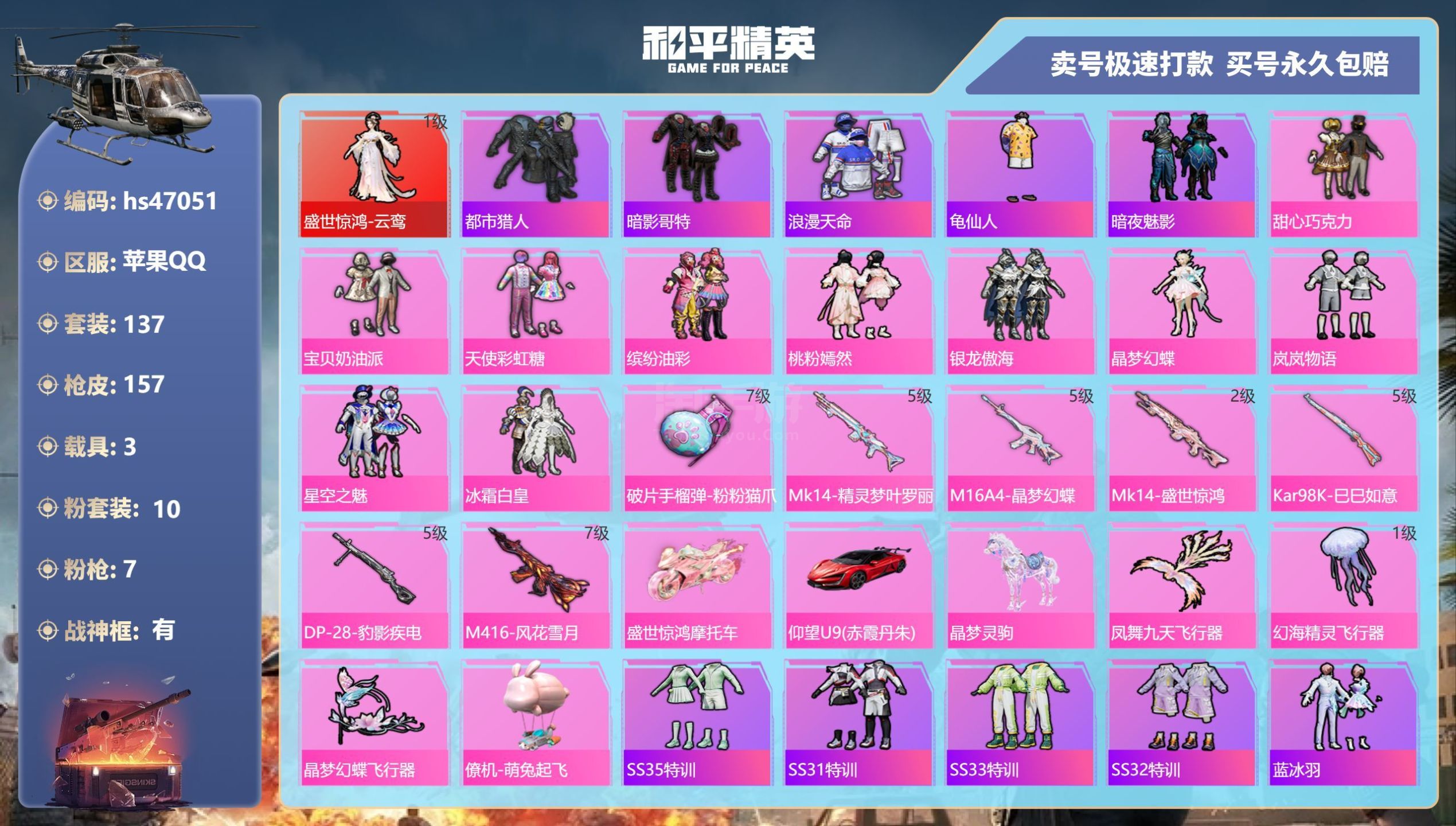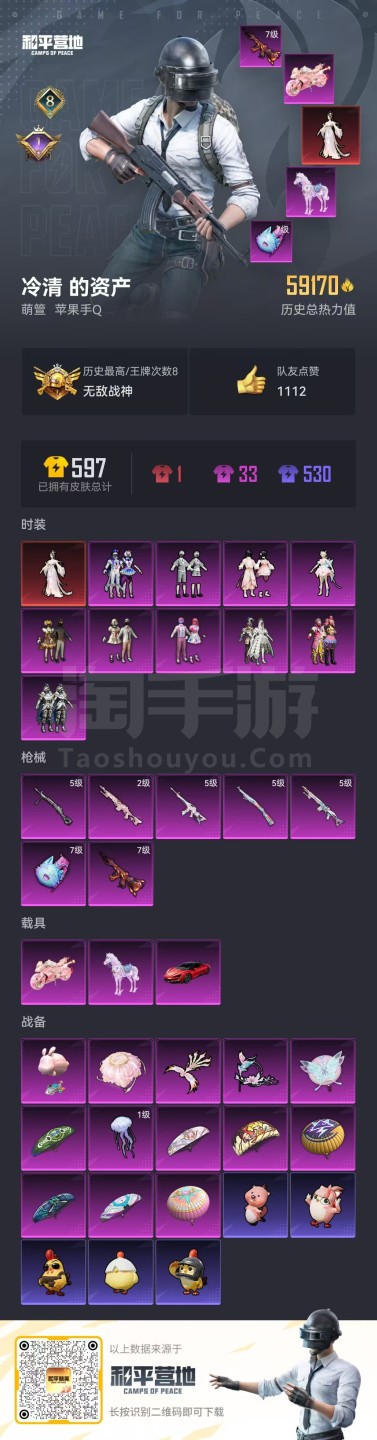 hs47051 苹果手Q-8王牌印记-有战神框-10粉装-7特效枪-3载具-59170热力值-137