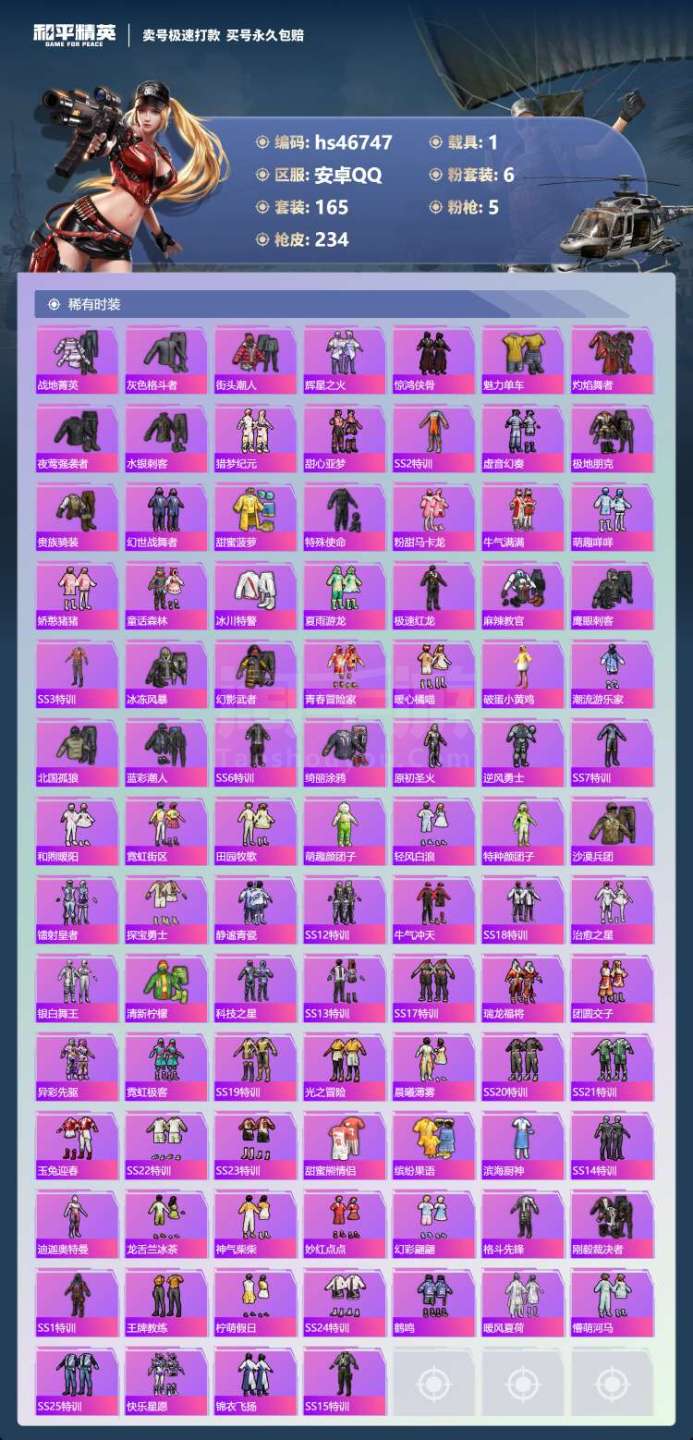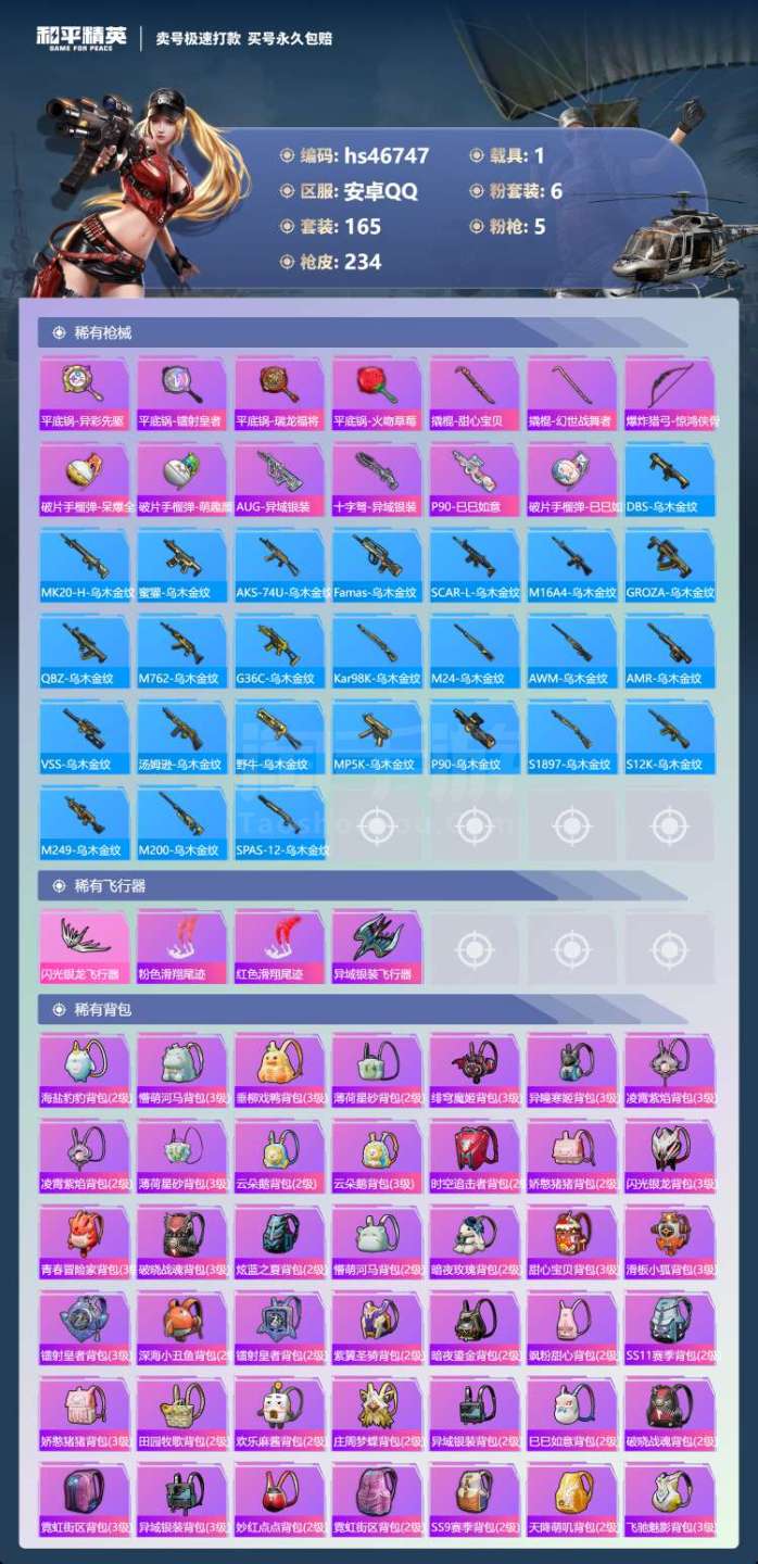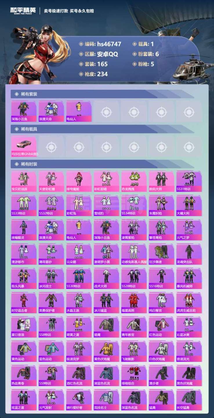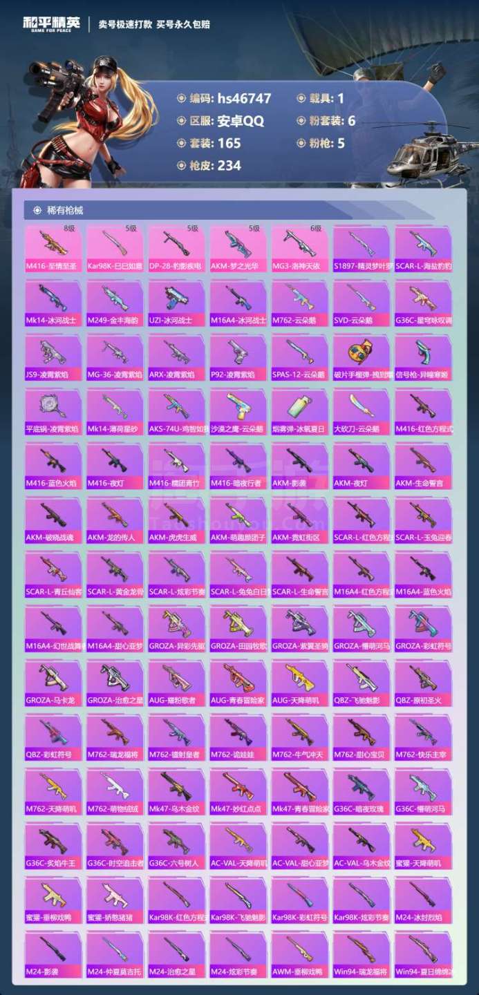 hs46747 安卓手Q-9王牌印记-6粉装-5特效枪-1载具-75375热力值-165套装-234