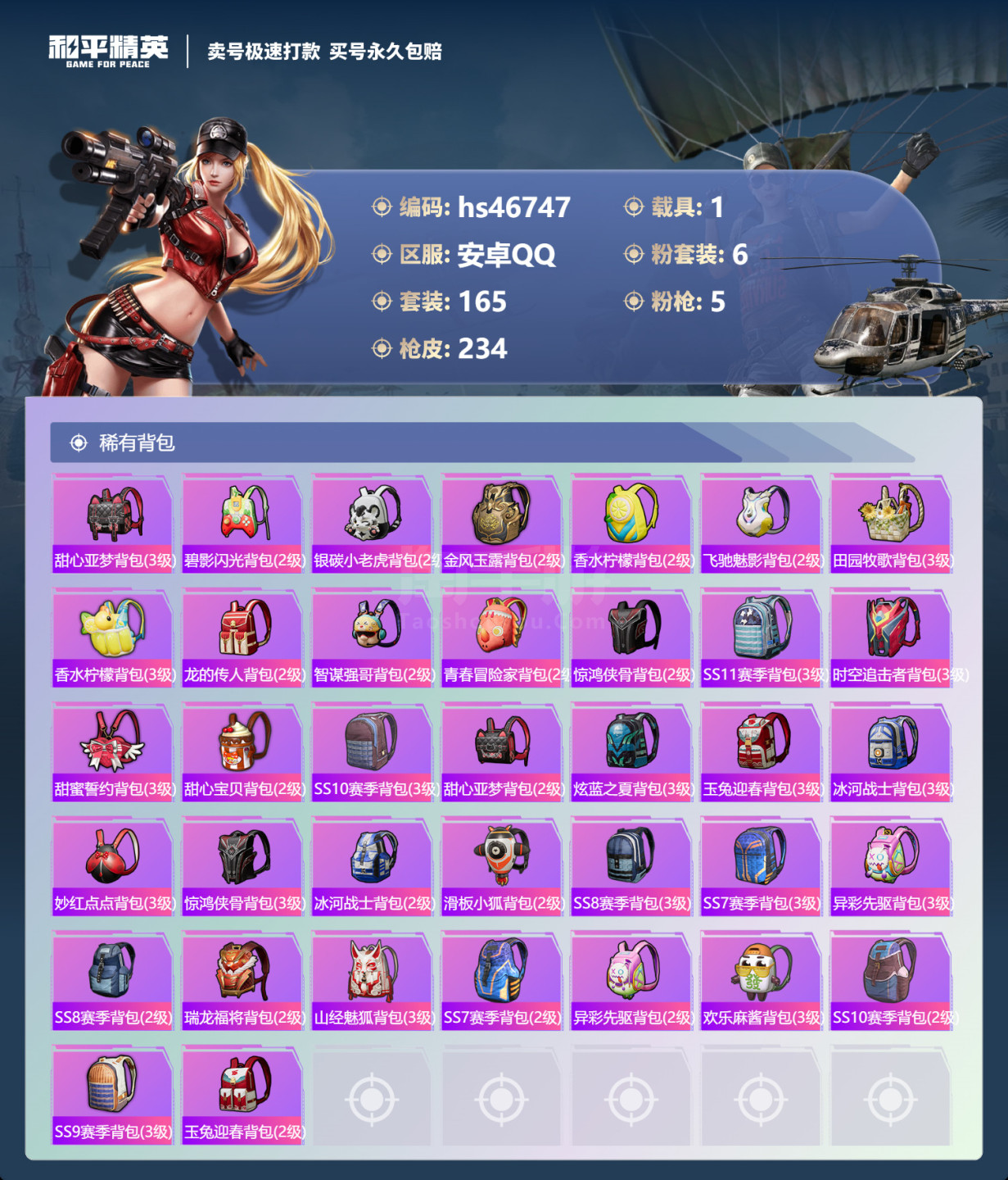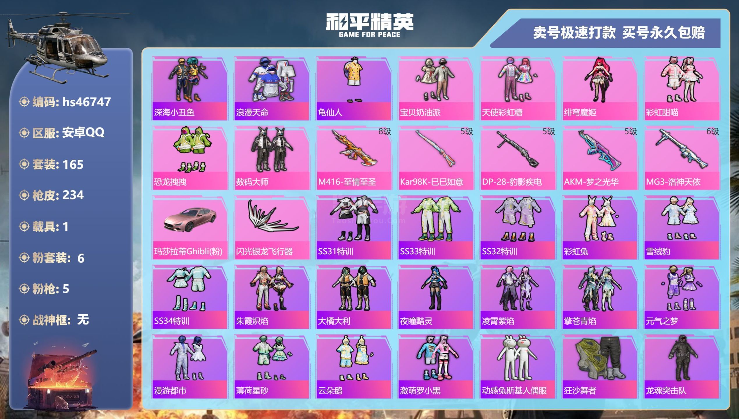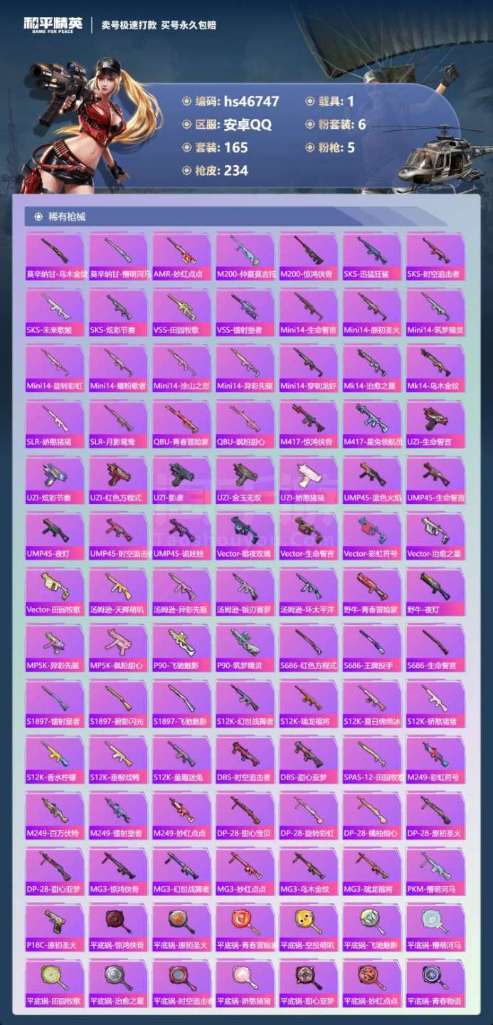 hs46747 安卓手Q-9王牌印记-6粉装-5特效枪-1载具-75375热力值-165套装-234