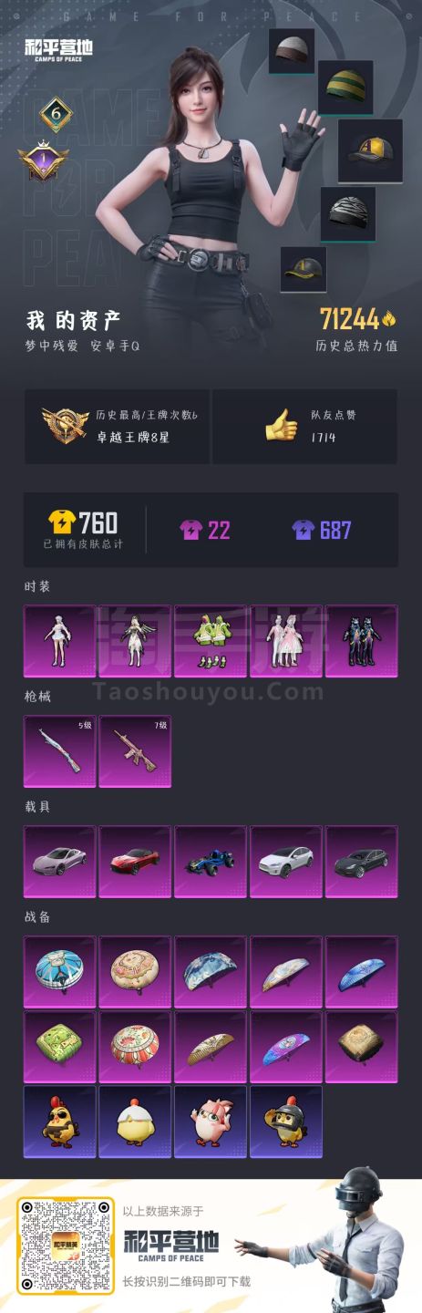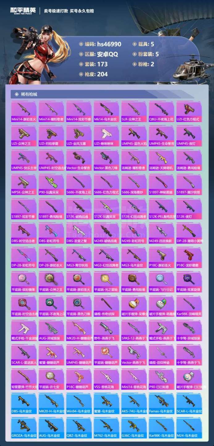 hs46990 安卓手Q-6王牌印记-5粉装-2特效枪-5载具-71324热力值-173套装-204