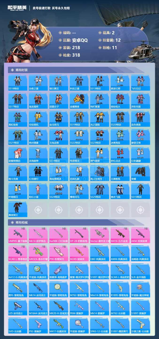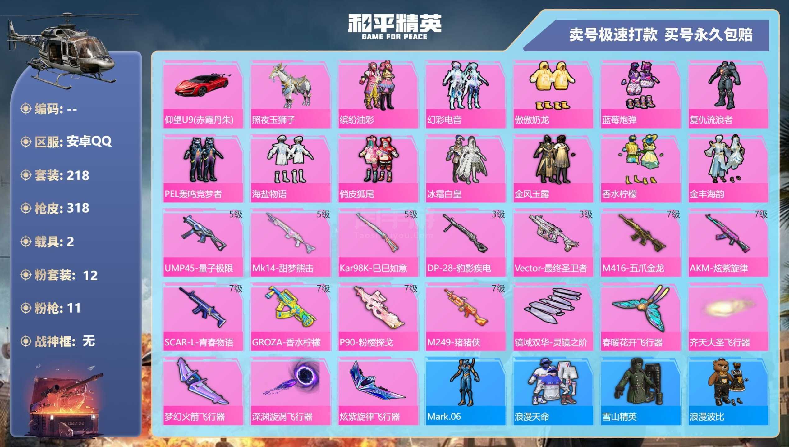 a3824/安卓QQ/-22王牌印记-12粉装-11特效枪-2载具-105514热力值-218套装-
