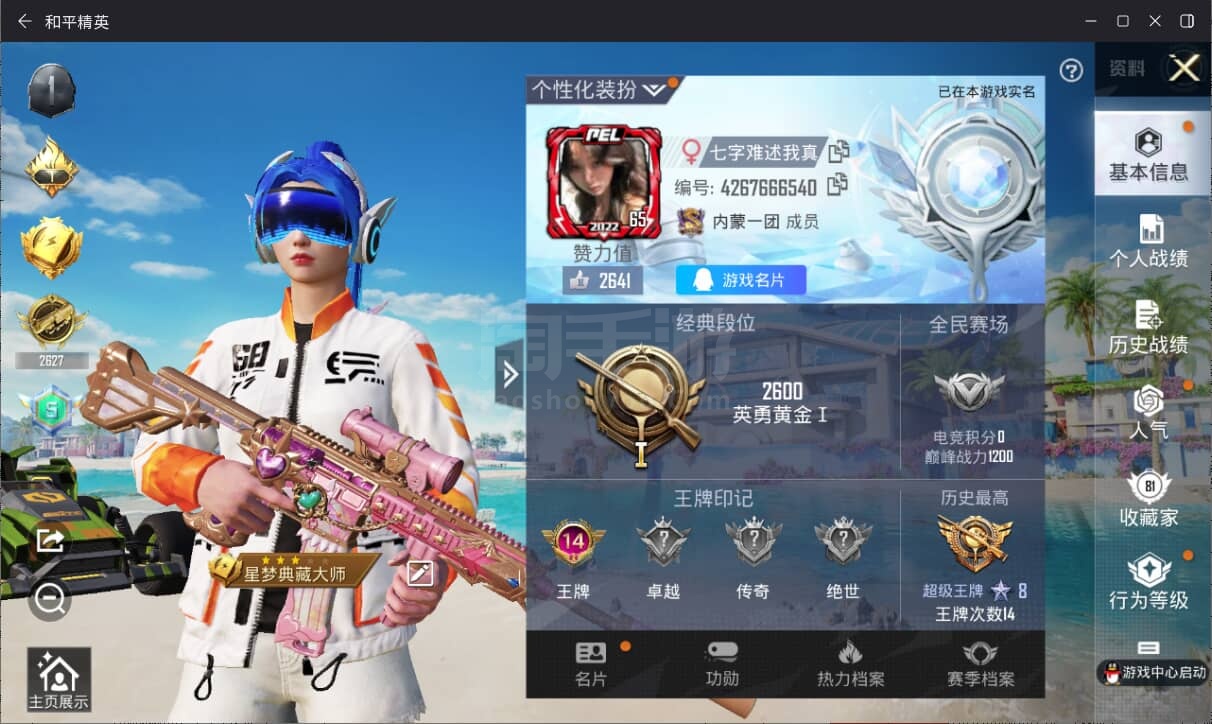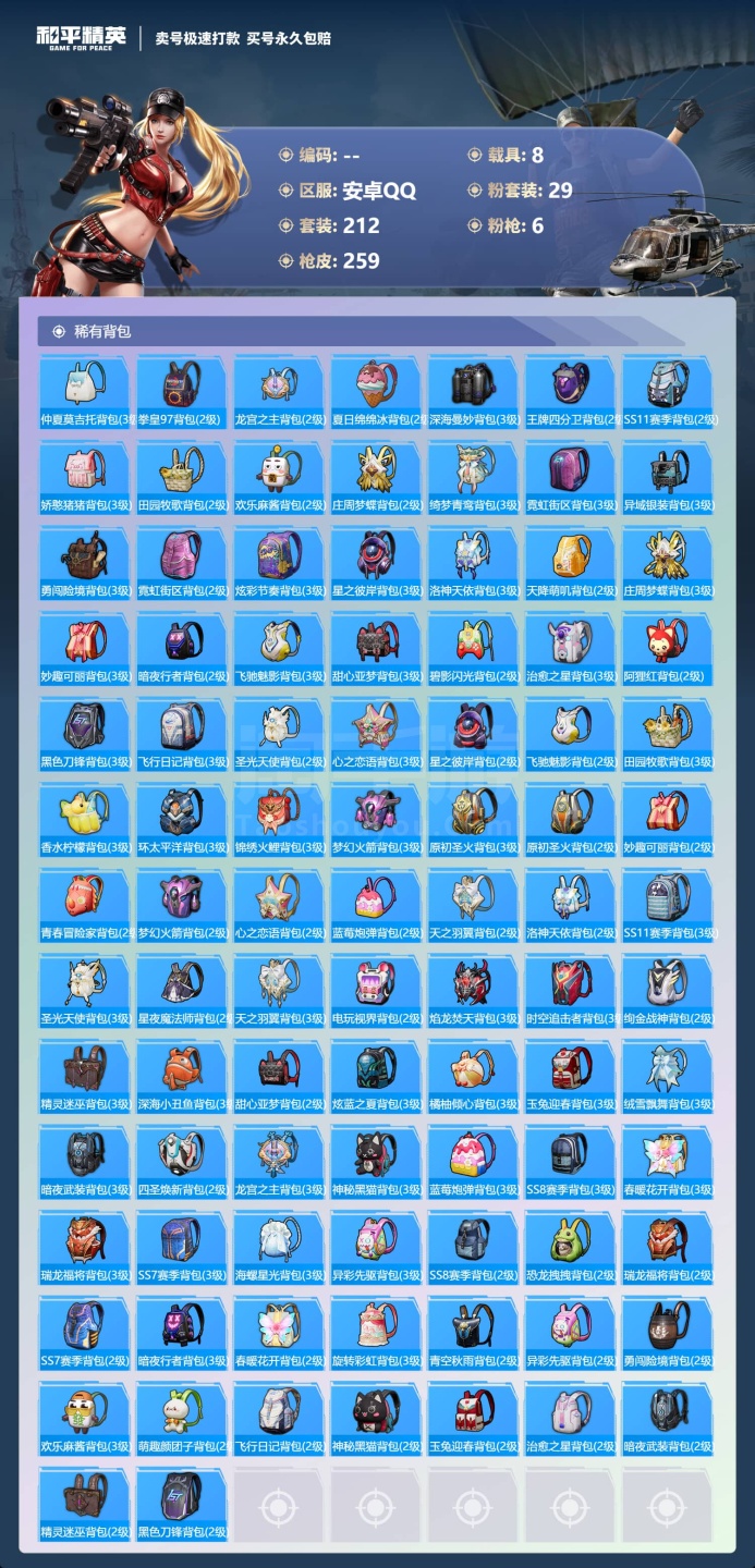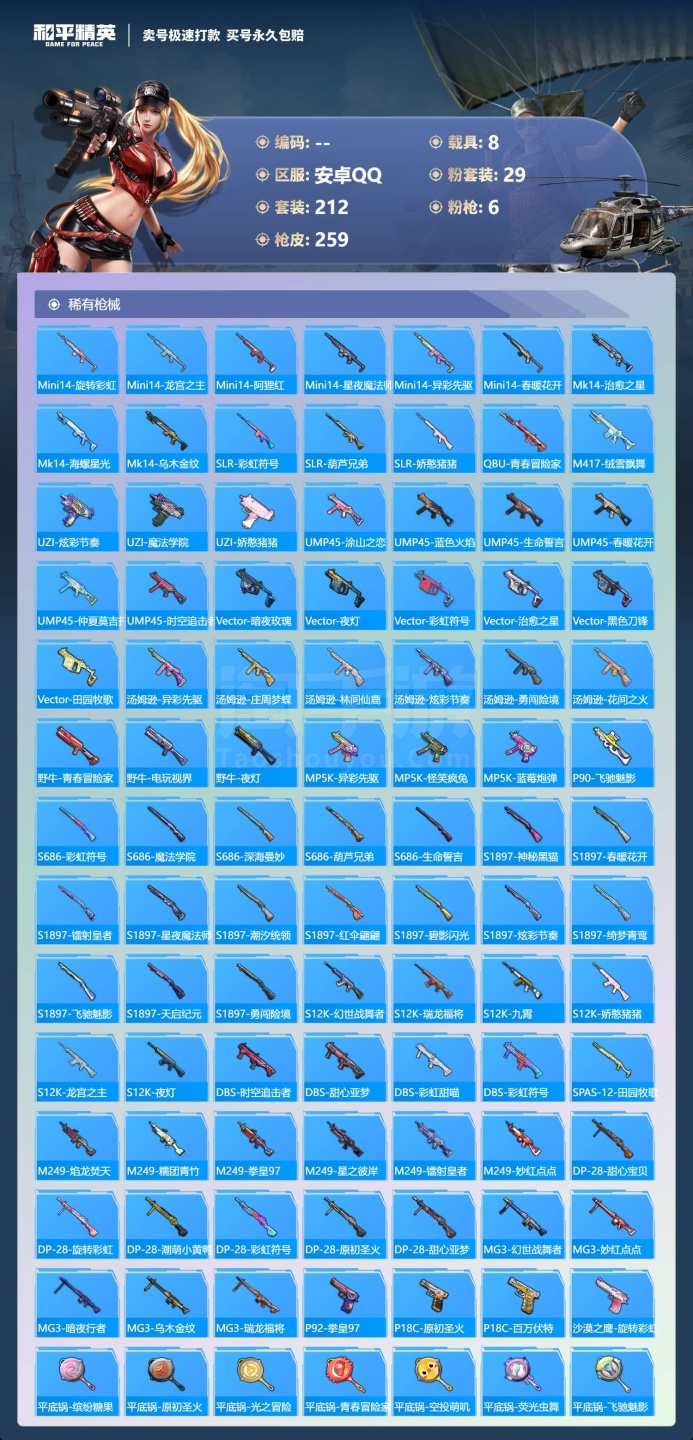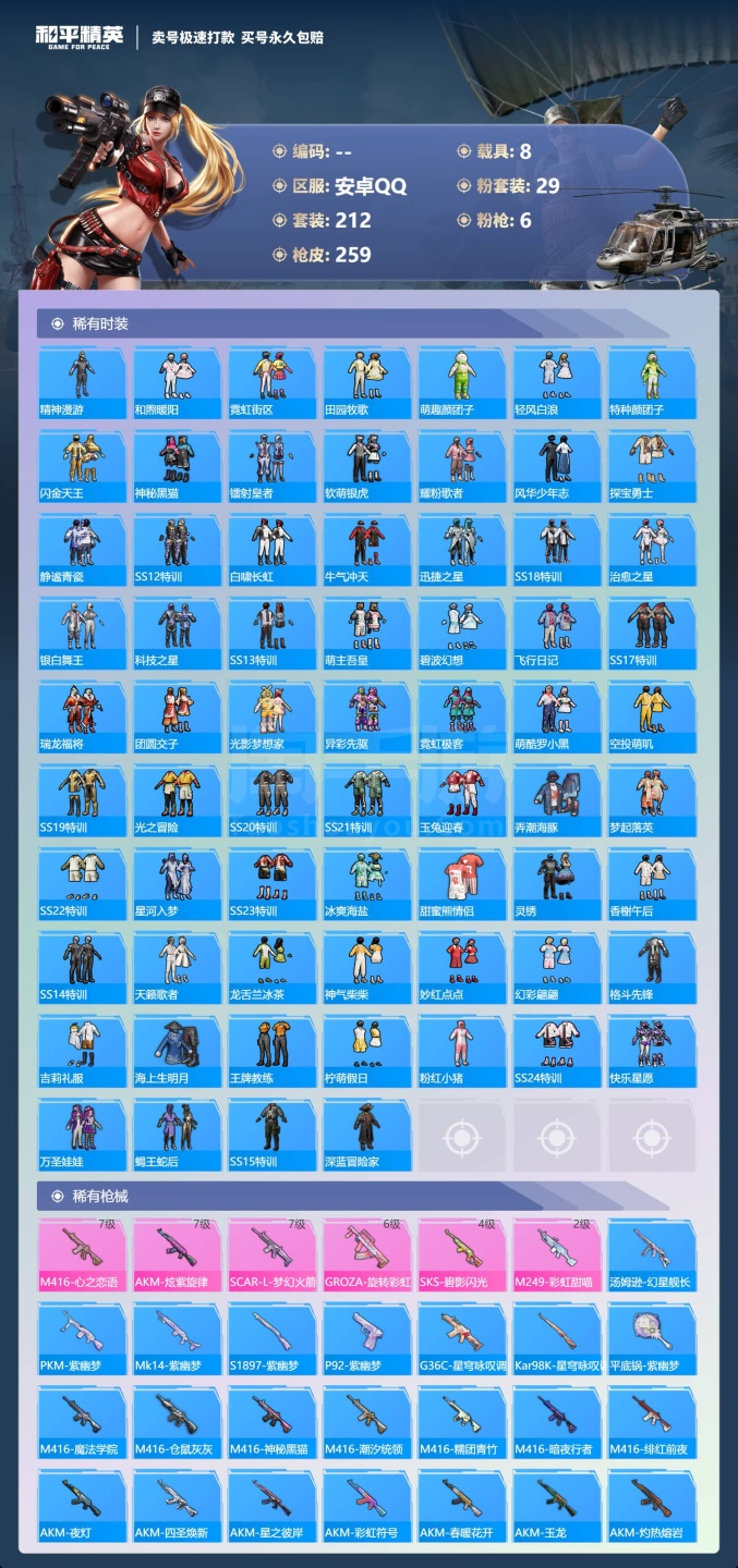 a3763/安卓QQ/-14王牌印记-29粉装-6特效枪-8载具-111033热力值-212套装-2
