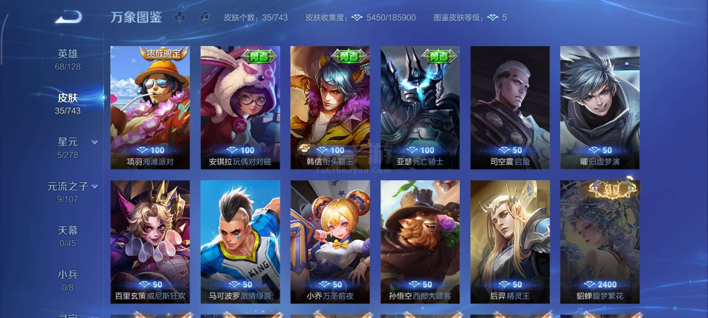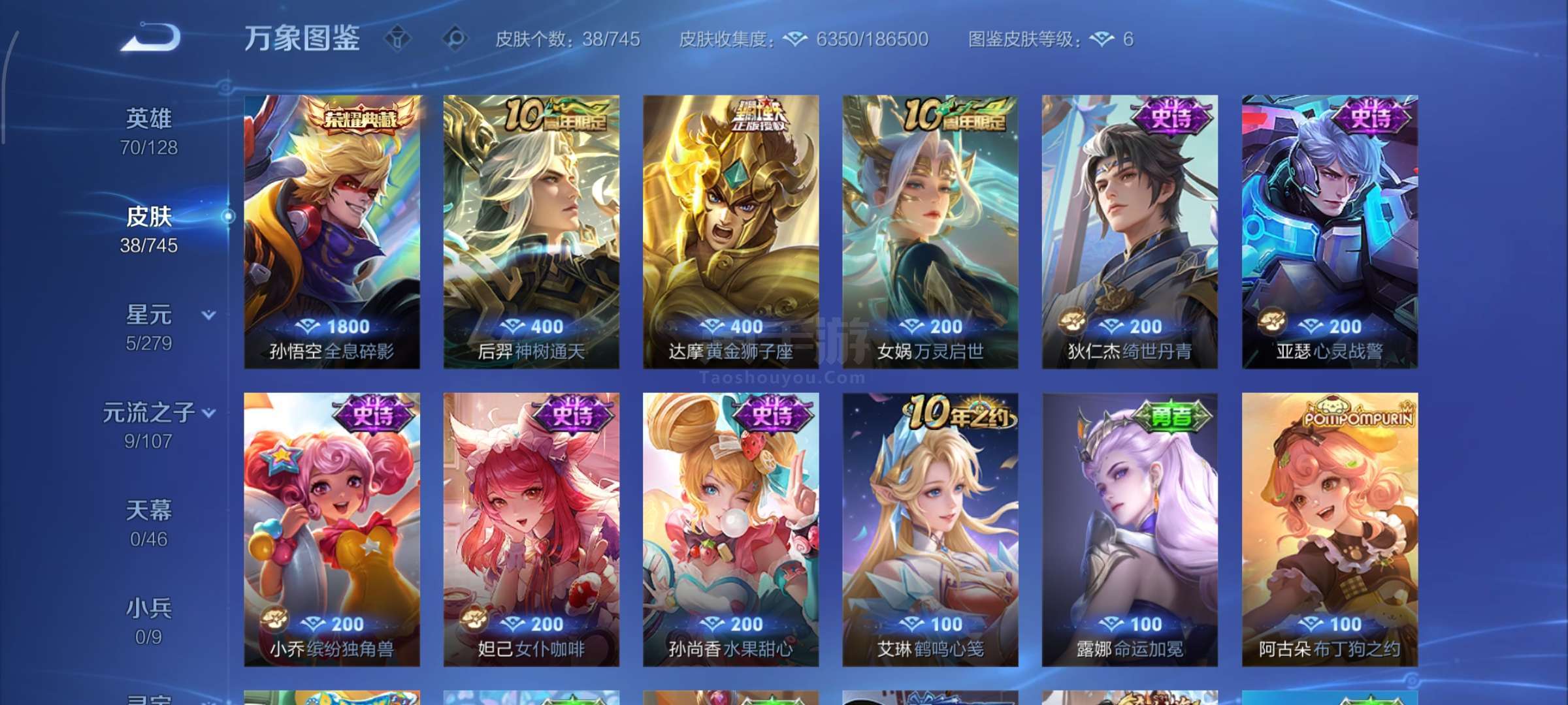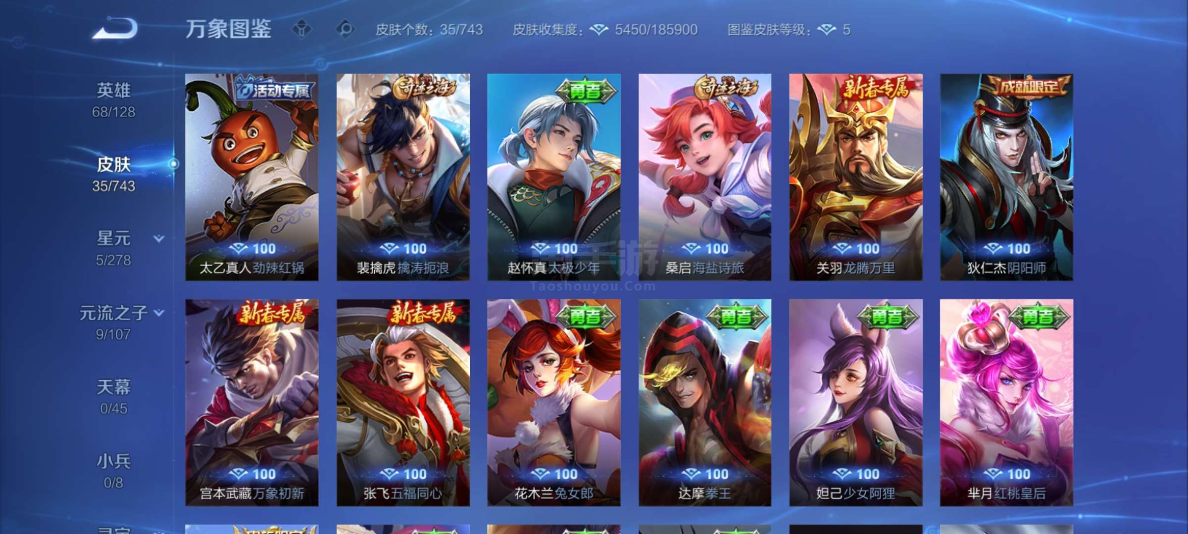 猴子荣耀典藏。吃鸡有强哥等皮肤。金铲铲有神话永恩。性价比不错可以当小号。