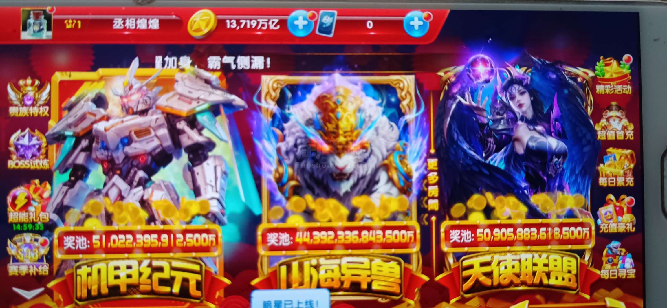 无绑v1 5000炮 13700万亿 狂暴2800+ 巅峰11 道具充足上线领双翅膀
