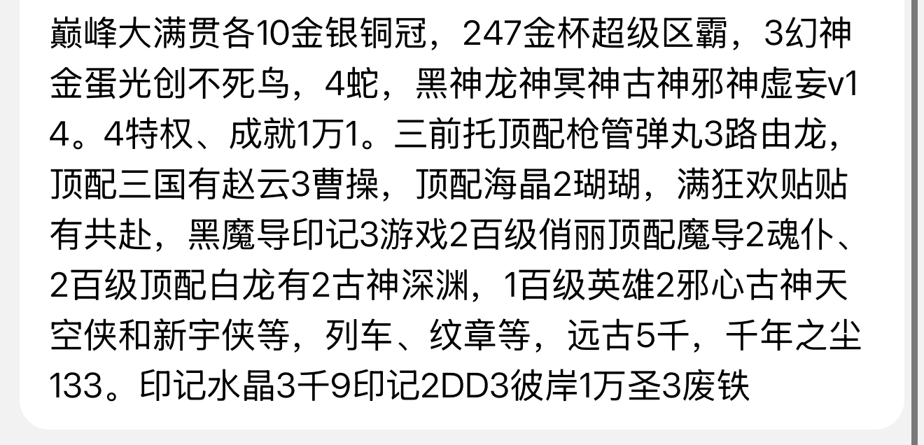 10金银铜冠,247金杯超级区霸,3幻神金蛋光创不死鸟,4蛇,黑神龙神冥神古神邪神虚妄v14。4特权、三前托顶配枪管弹丸3路由龙,顶配三国有赵云、曹操,顶配海晶2瑚瑚,满狂欢贴贴共赴黑魔导印记3魔导