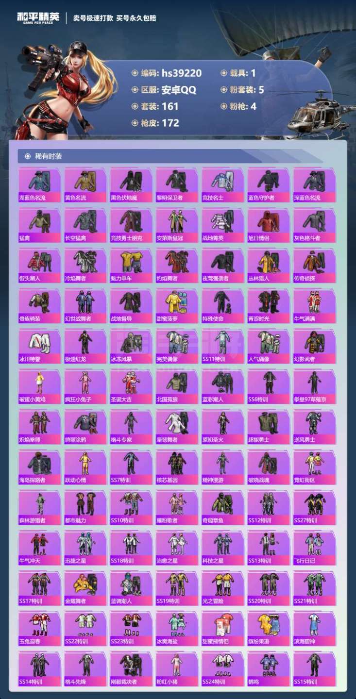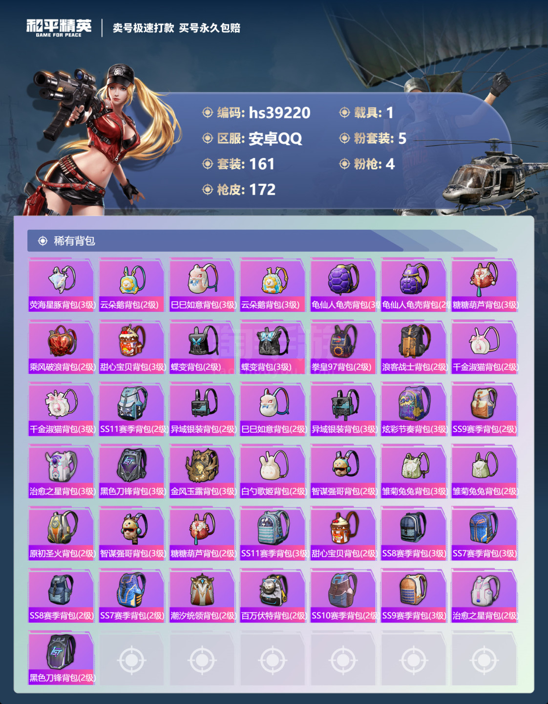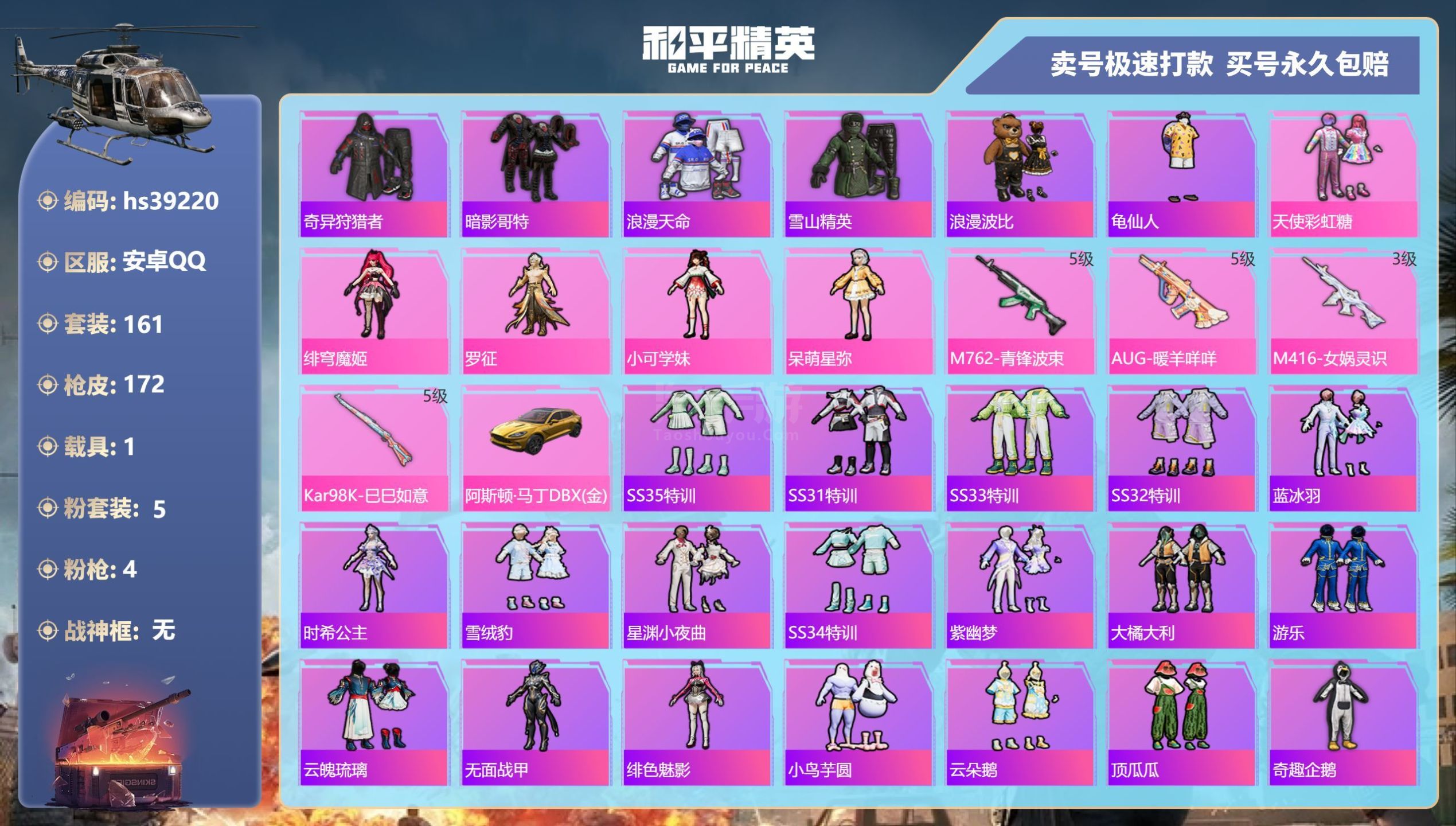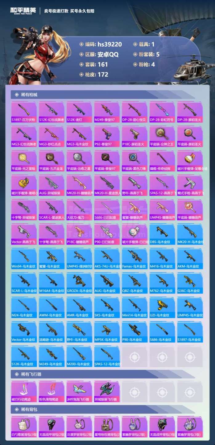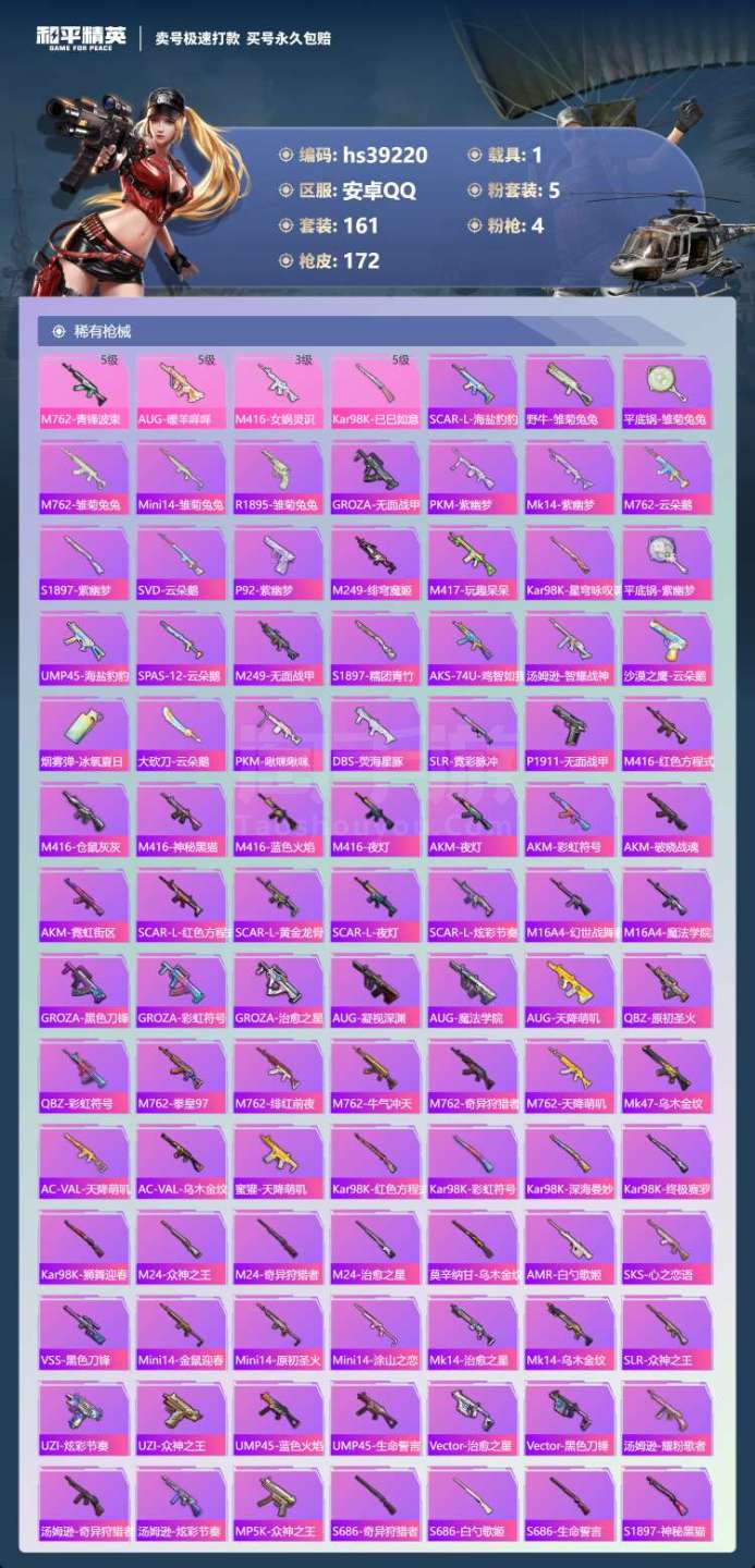 hs39220 安卓手Q-8王牌印记-5粉装-4特效枪-1载具-58116热力值-161套装-172