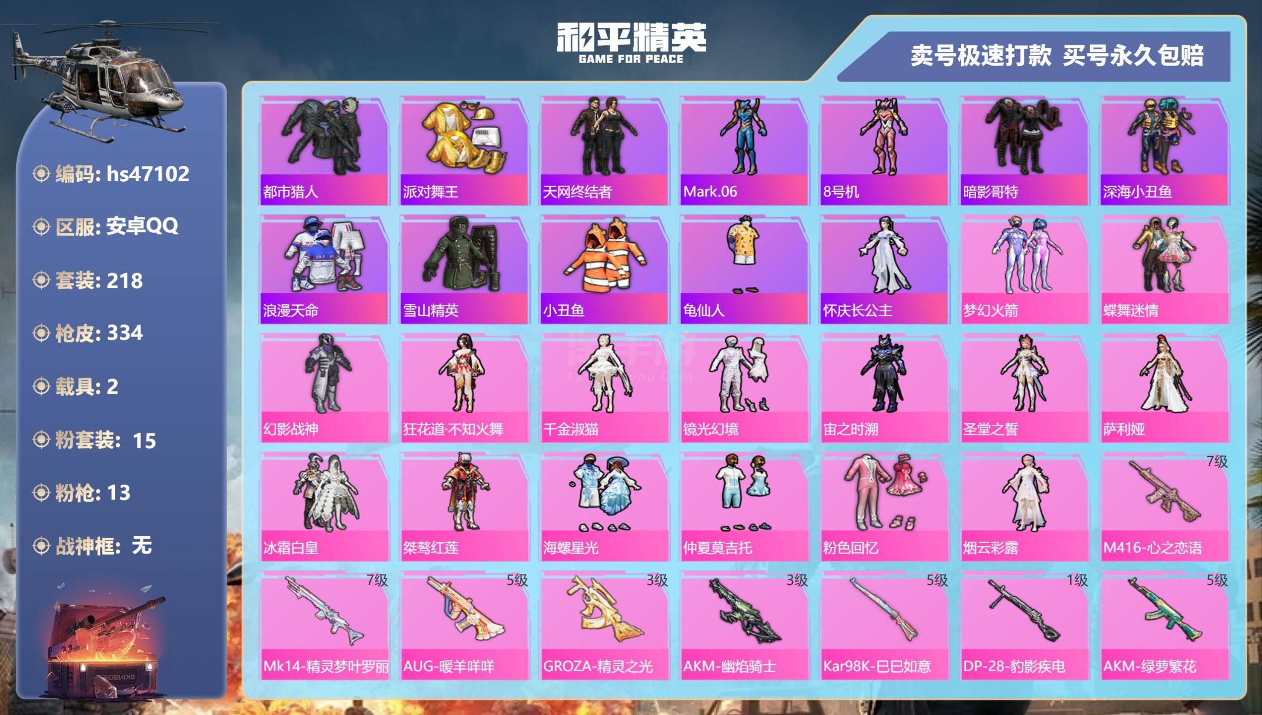 hs47102 安卓手Q-20王牌印记-15粉装-13特效枪-2载具-113891热力值-218套装