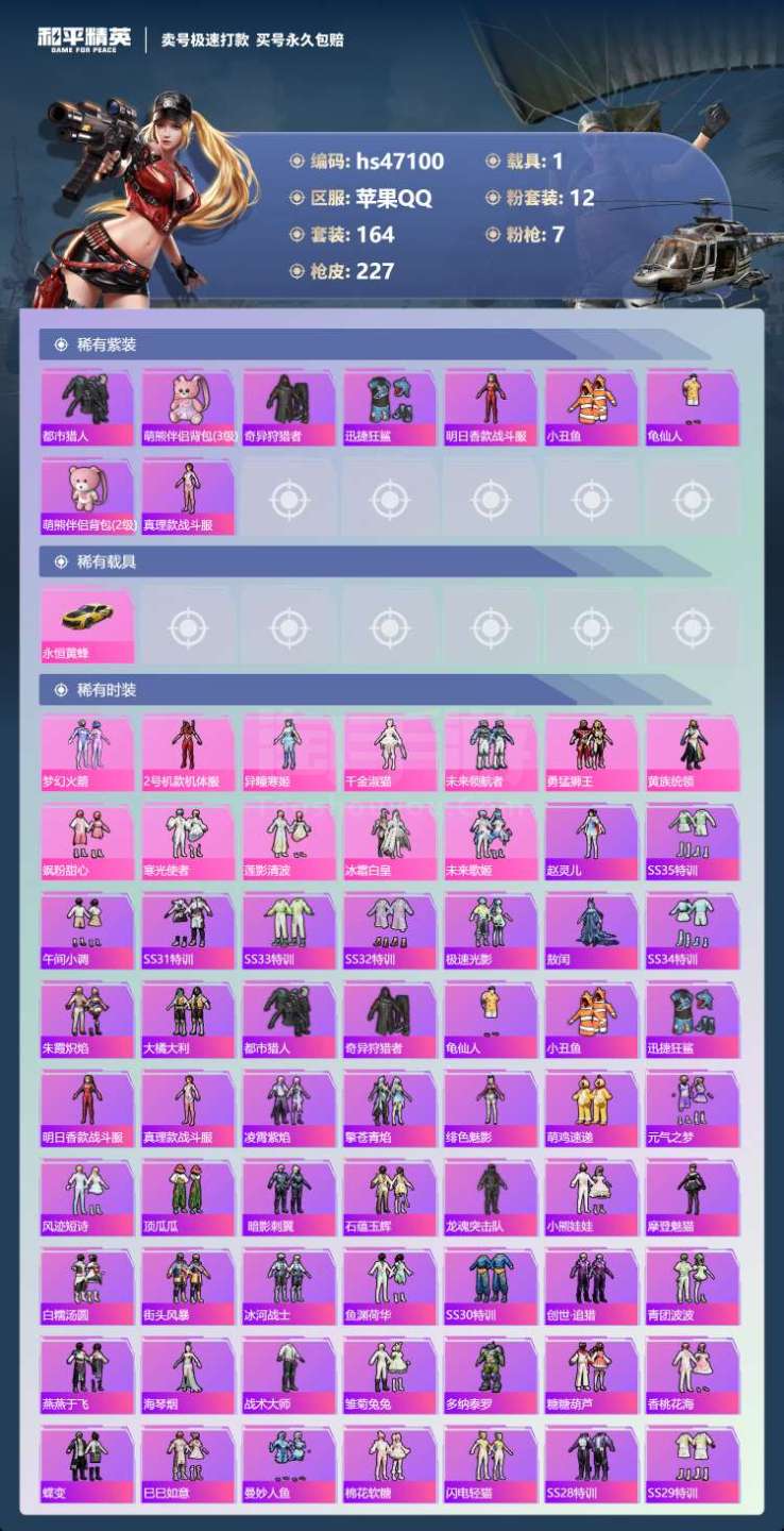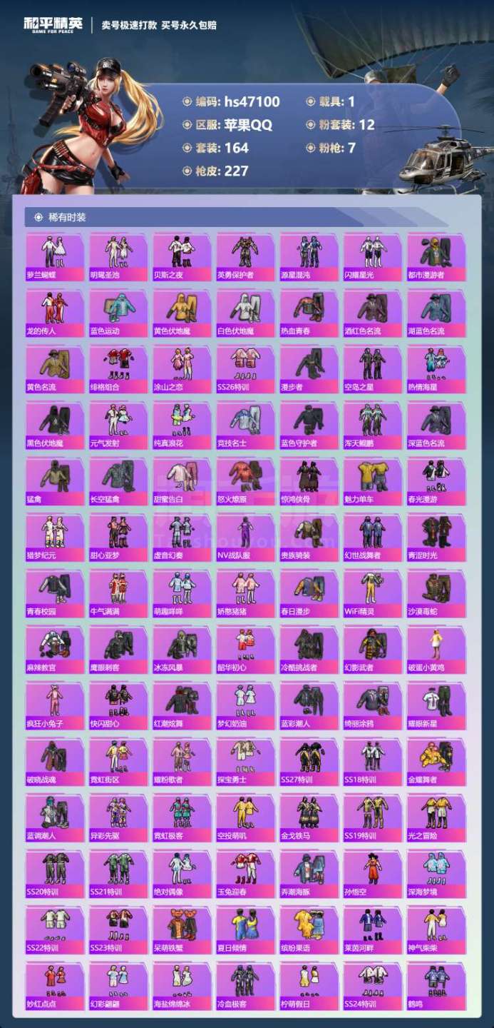 hs47100 苹果手Q-13王牌印记-12粉装-7特效枪-1载具-75344热力值-164套装-2