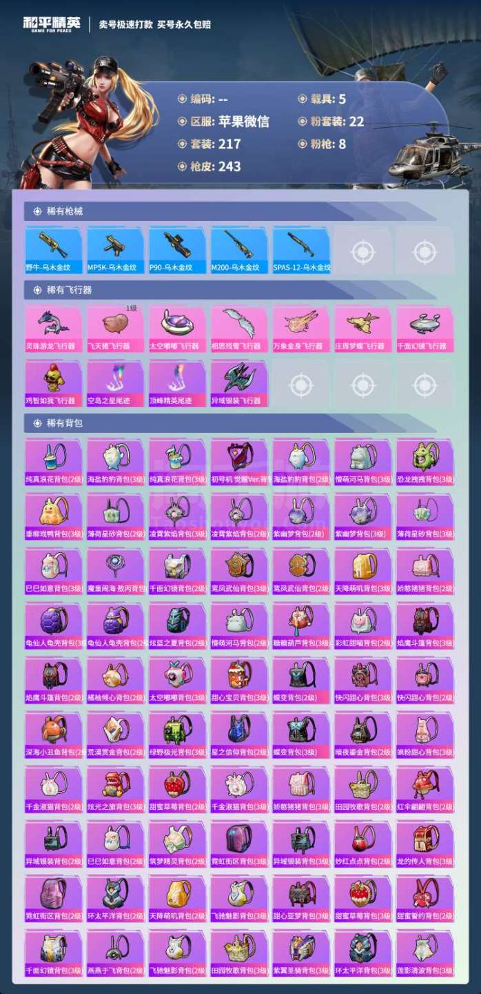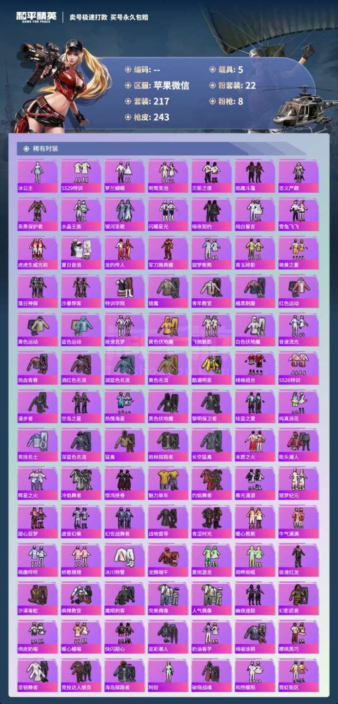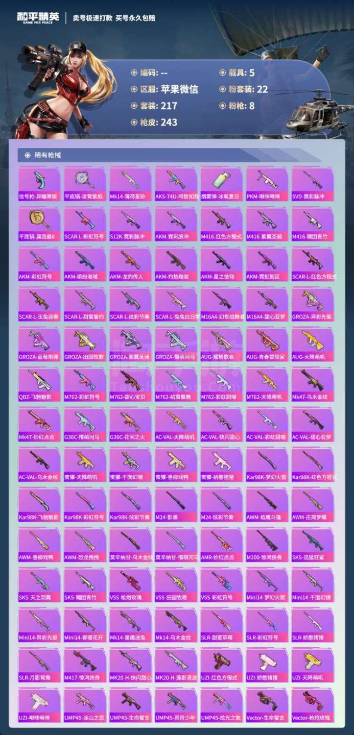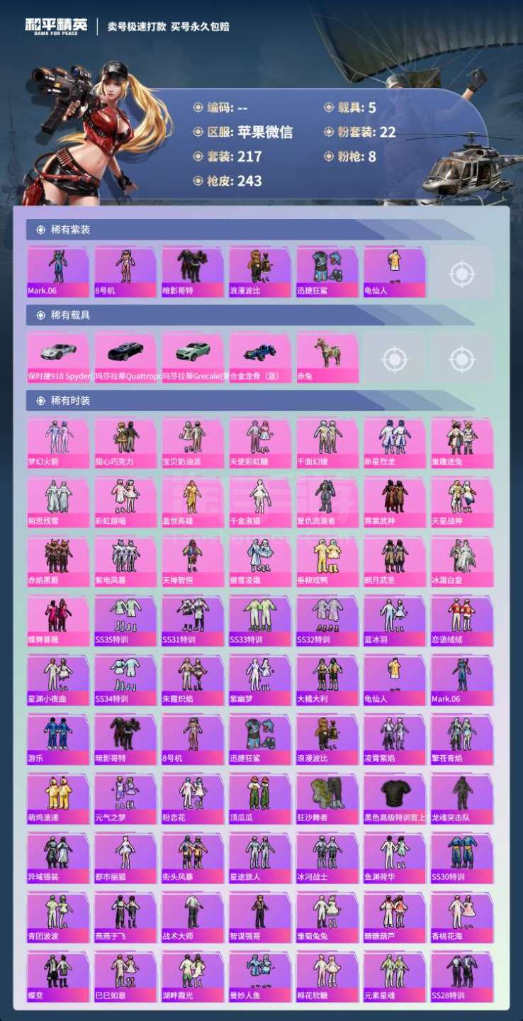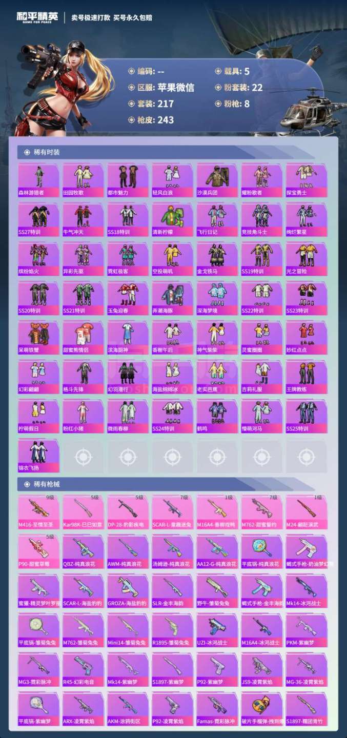 hs47388 苹果v-16王牌印记-22粉装-8特效枪-5载具-90879热力值-217套装-2