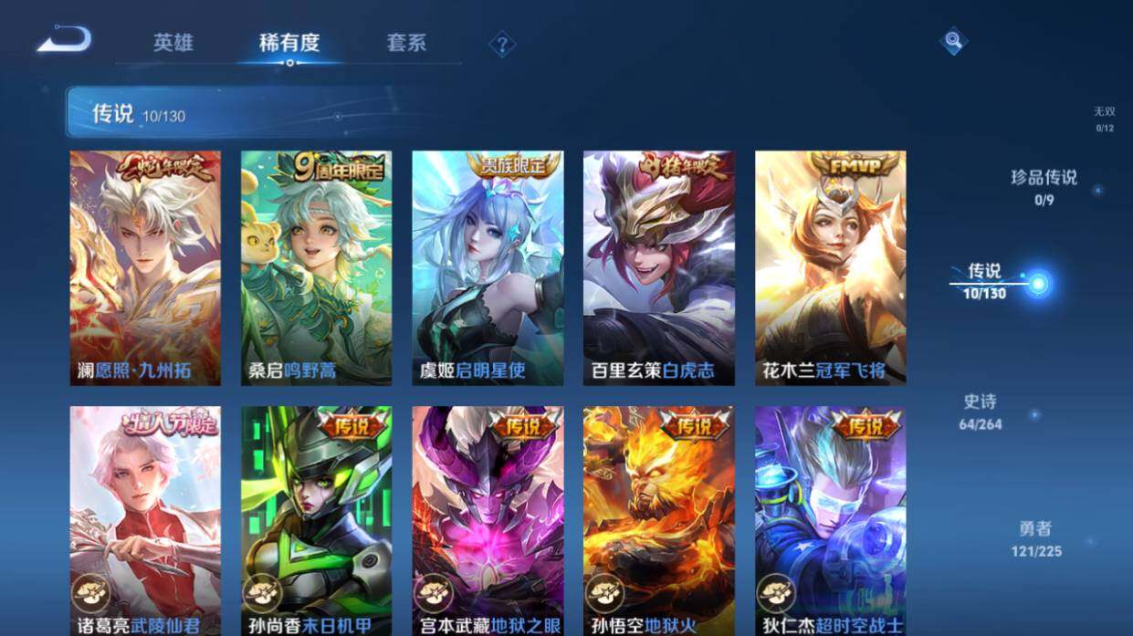 【传说皮肤】:澜愿照九州拓,桑启鸣野蒿,虞姬启明星使,百里玄策白虎志,花木兰冠军飞将,诸葛亮武陵仙君,孙尚香末日机甲,宫本武藏地狱之眼,孙悟空地狱火,狄仁杰超时空战士