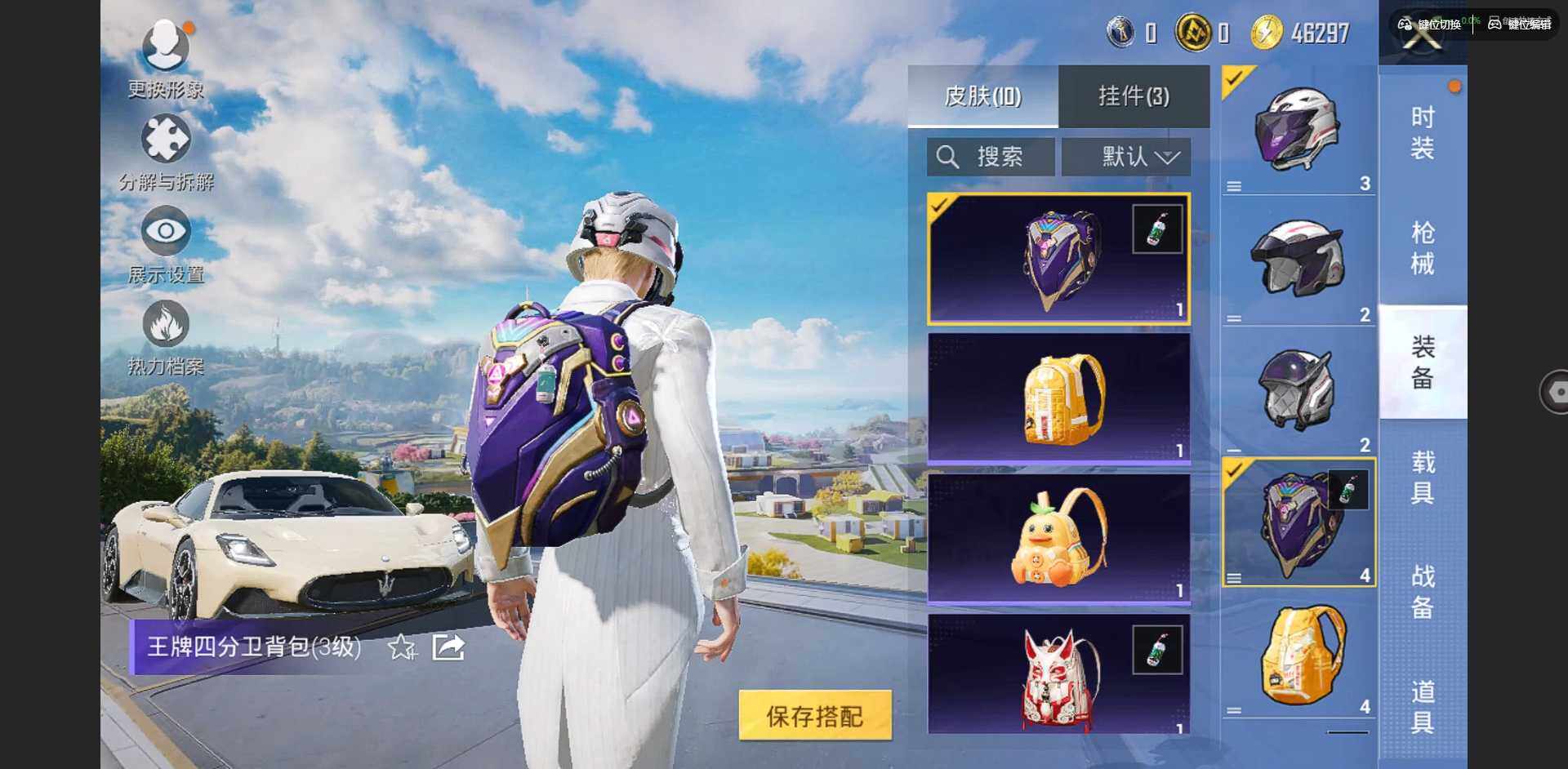 实名: 可修改 时装数: 15 载具数: 1 枪械数: 24 战备数: 20 热门装扮: 纯珍童话 载具: 玛莎拉蒂MC20(星石白)